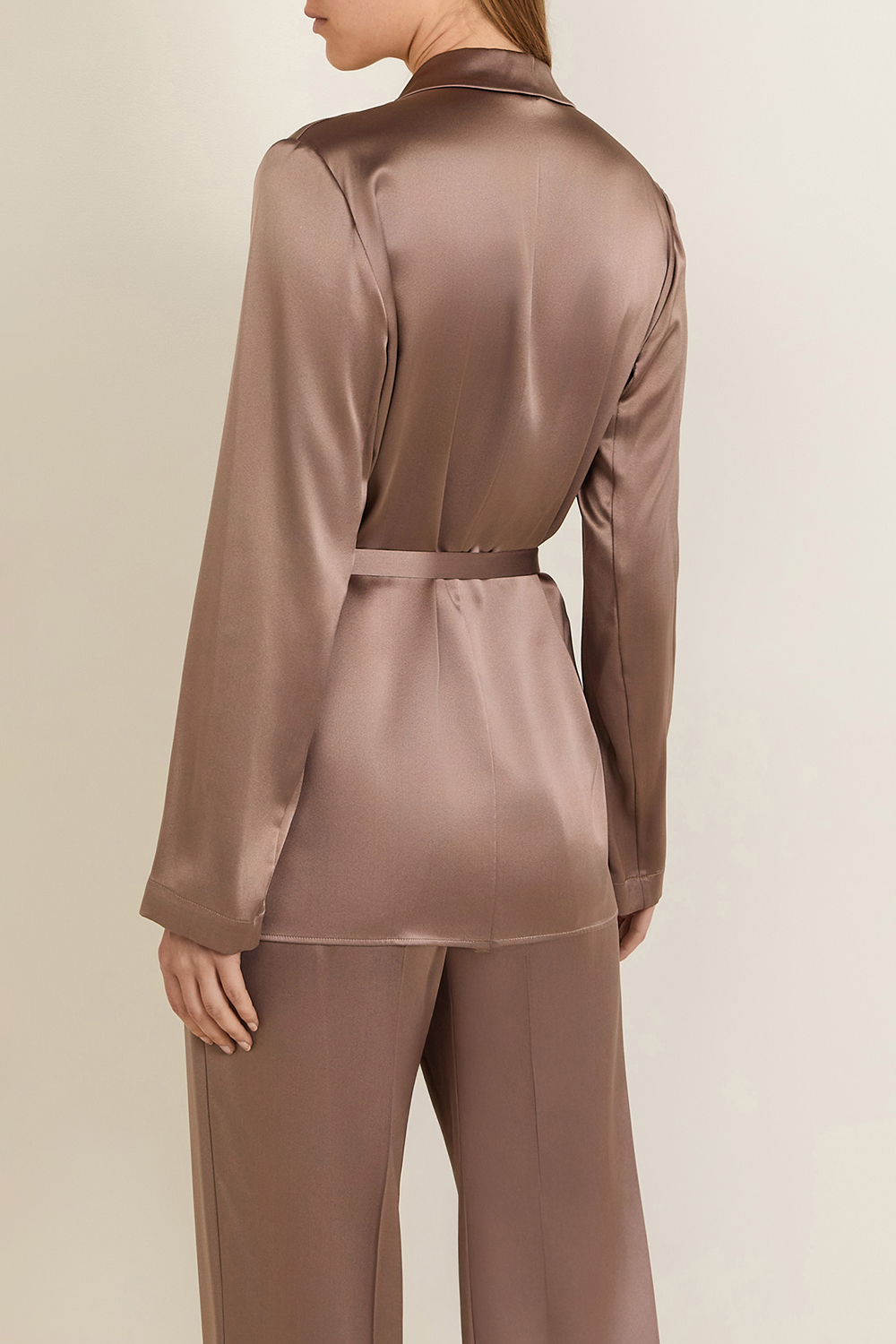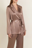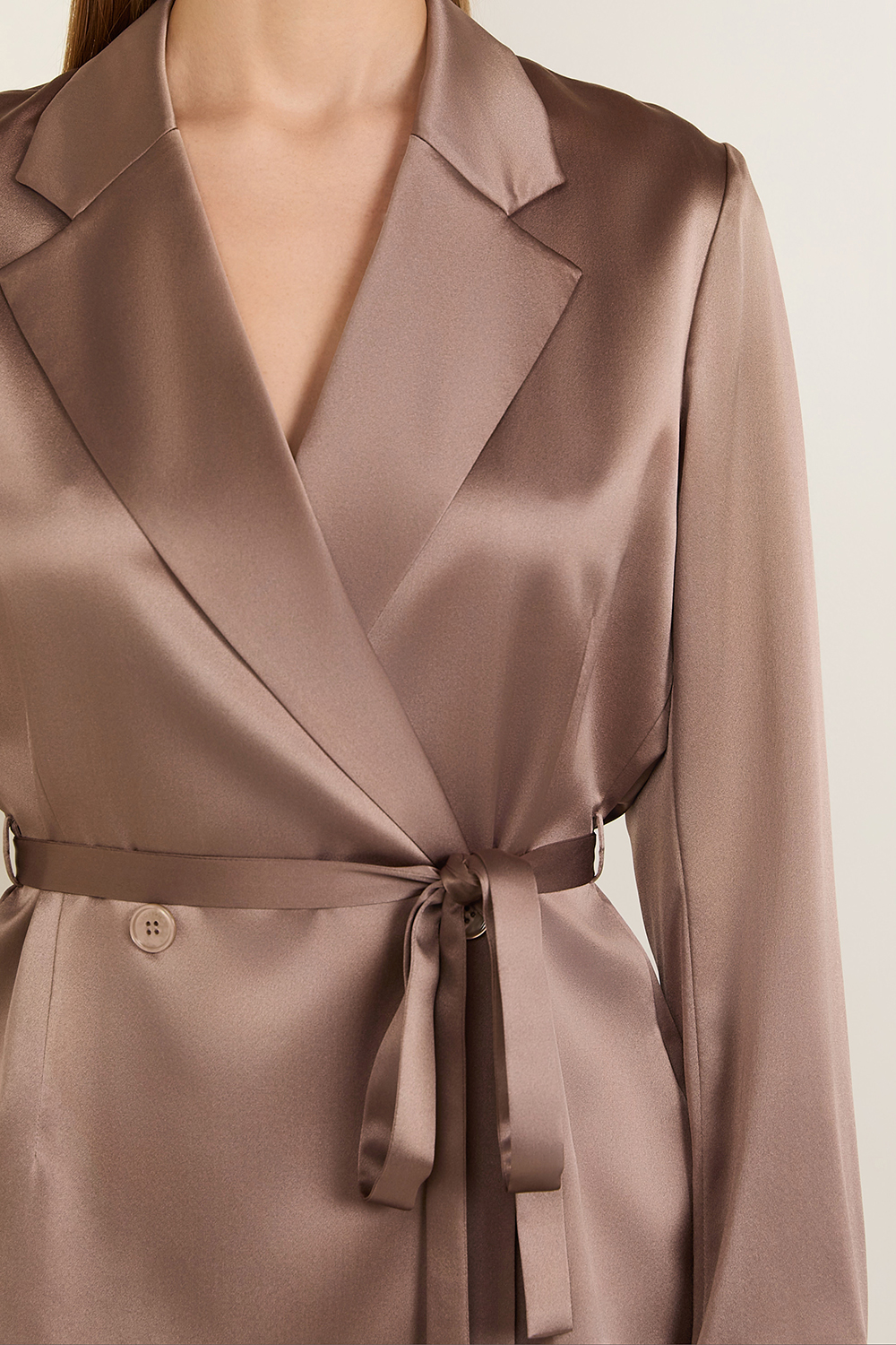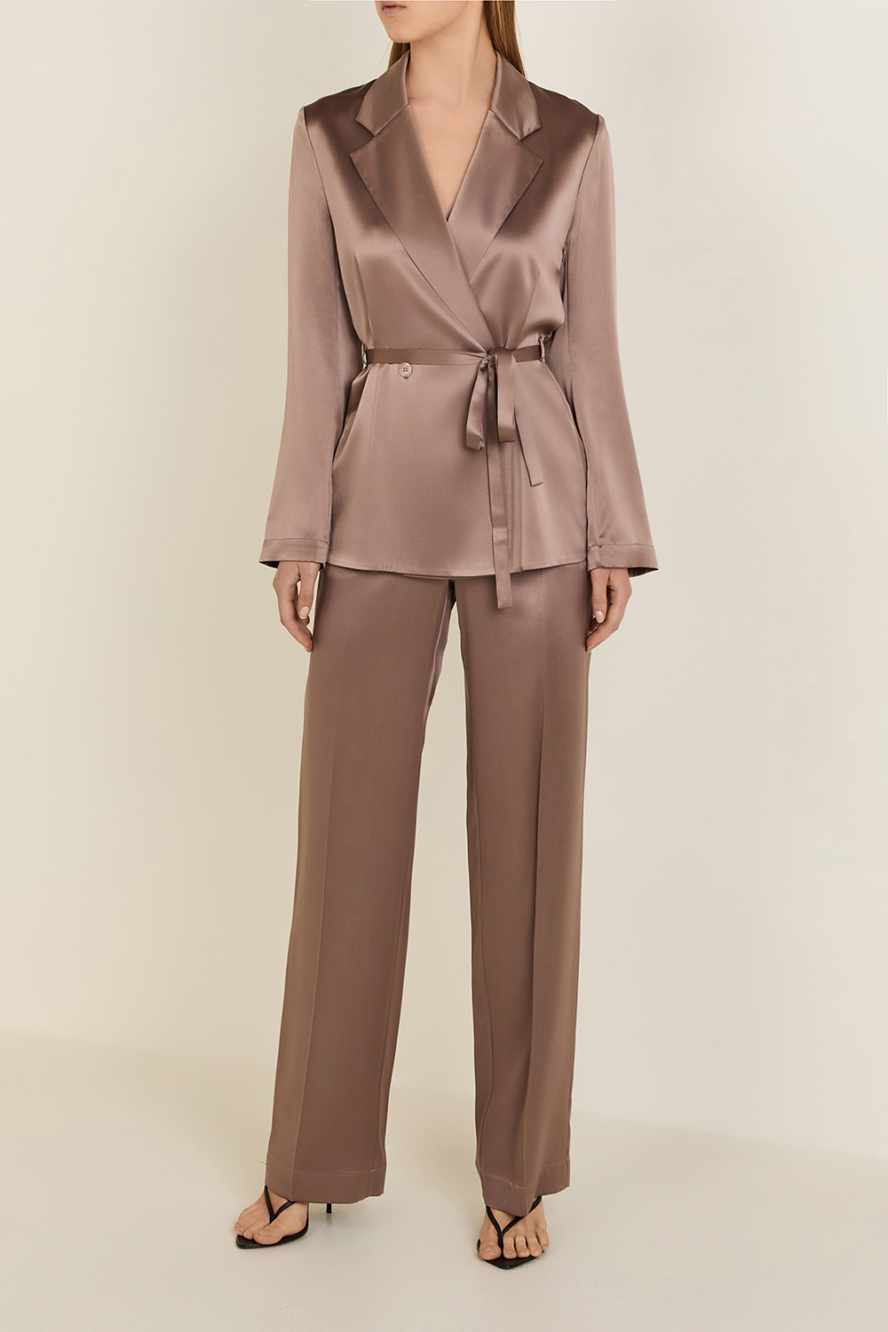 ז'קט Joubert בגזרת מעטפת מבית Joseph. הוא עשוי משי בצבע חום ונסגר ברכיסת כפתורים כפולה וחגורה תואמת. סגנני אותו מעל לחולצה אלגנטית או בלעדיה. מומלץ לשלב עם מכנסיים תואמים מתוך הקולקציה.