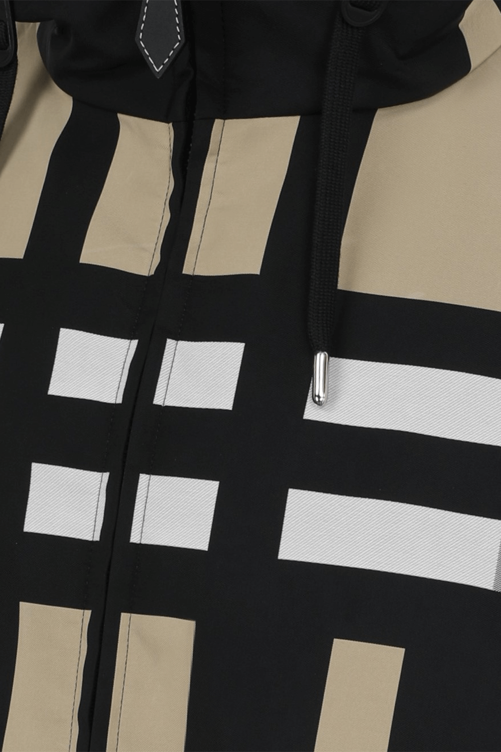"ז`קט מדגם Stanford בעיצוב בית האופנה הבריטי Burberry, העשוי 100% פוליאסטר חזק ועמיד בגוון שחור, ומציג הדפס משבצות בסגנון קולורבלוק בחלקו העליון, בגווני שחור, בז` ולבן. לפריט כובע קפוצ`ון לצד צווארון גבוה, אמרות אלסטיות וסגירת כפתורים חזיתית. הוא מתהדר בשני כיסים צדדיים. "