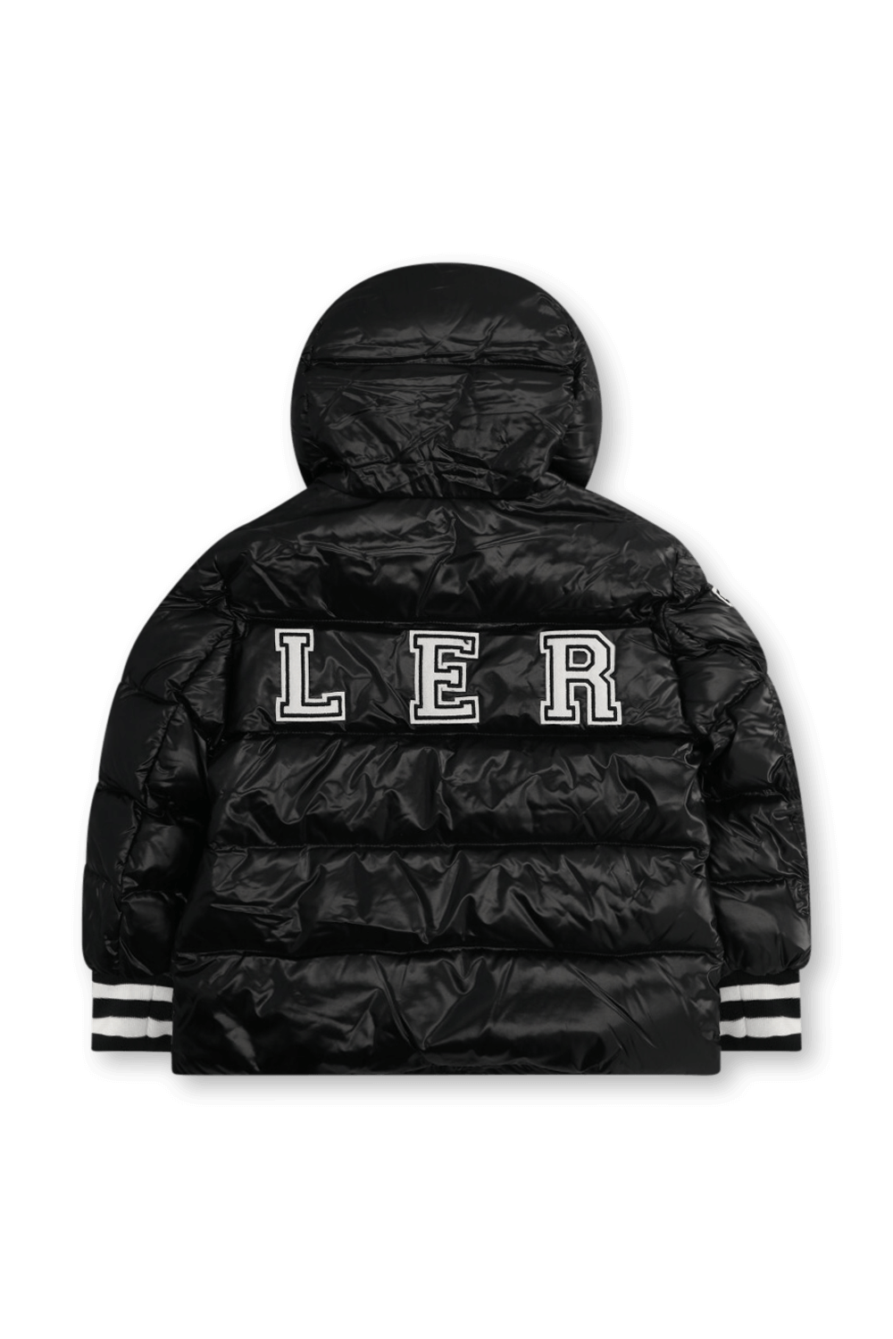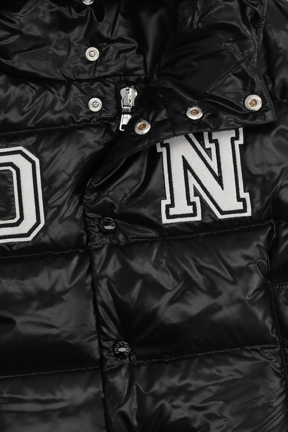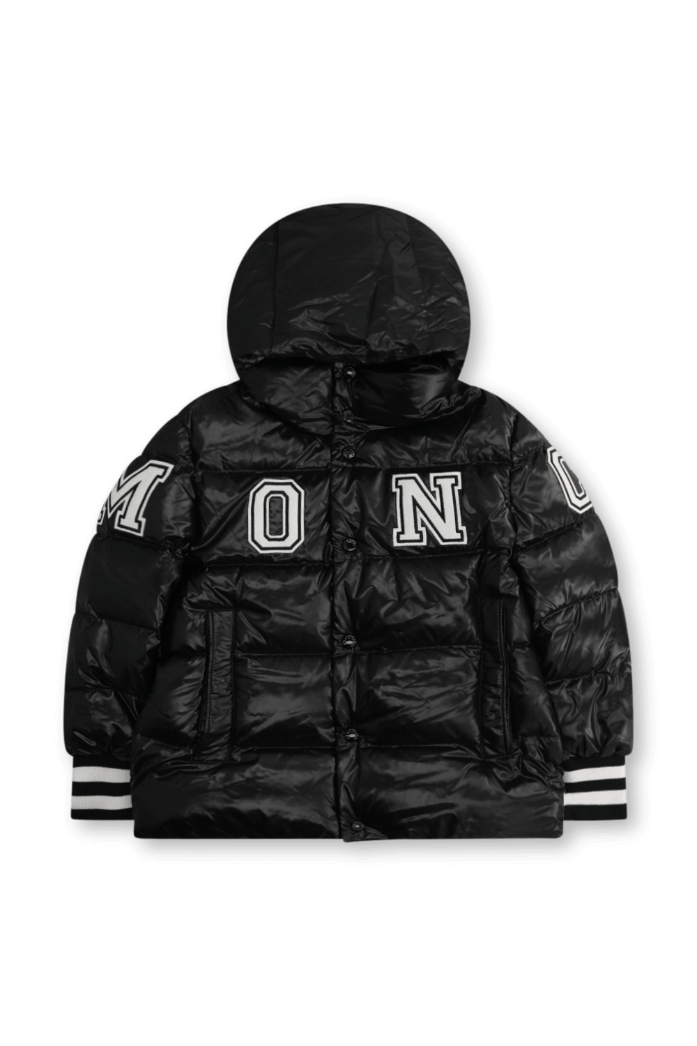 ז'קט פוך מדגם Bayan מבית Moncler, עשוי טקסטיל בצבע שחור עם הדפס לוגו המותג בשילוב כובע וכפתורים לאורך החזית ללבישה קלה ונוחה.