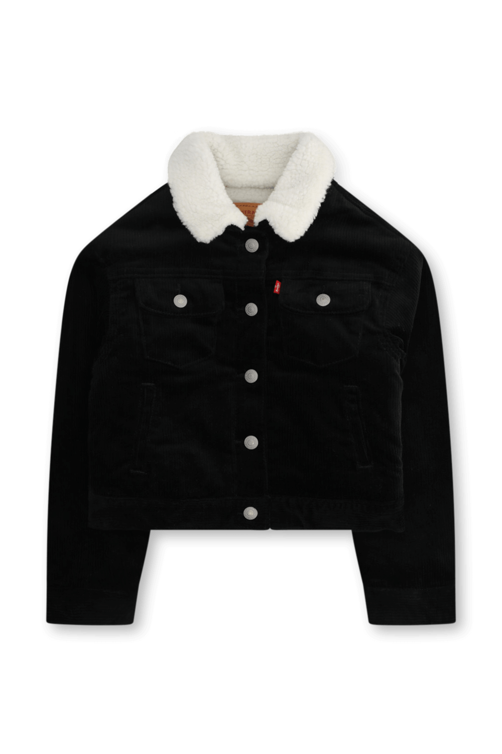 ז'קט Trucker קורדרוי מבית Levi's, עשוי תערובת כותנה באריגת קורדרוי בצבע שחור ופנים שרפה לבן.