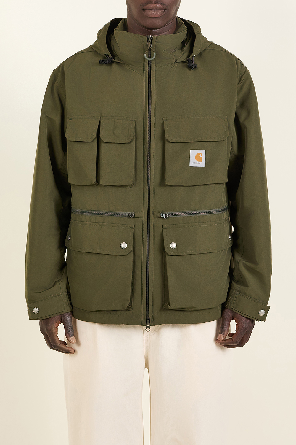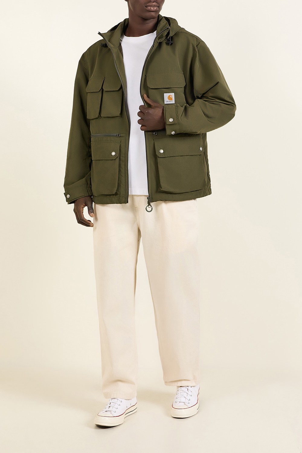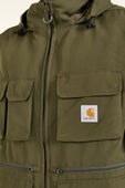 ז'קט קפוצון מבית Carhartt, עשוי מפוליאסטר בצבע ירוק חאקי עם ריפוד רשת. המעיל קל משקל ועמיד למים, עם קפוצ'ון נשלף ומתכוונן ושלושה כיסי חזה בשילוב לוגו המותג, שני כיסים עם רוכסן במרכז ושני כיסים נוספים בסגירת תיק-תק.