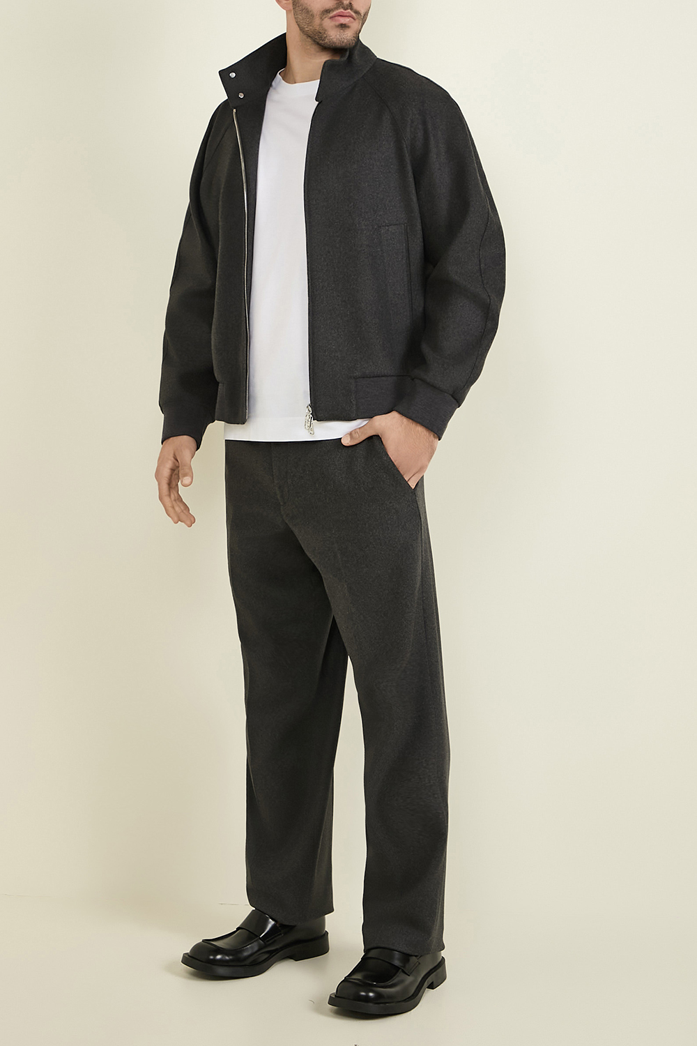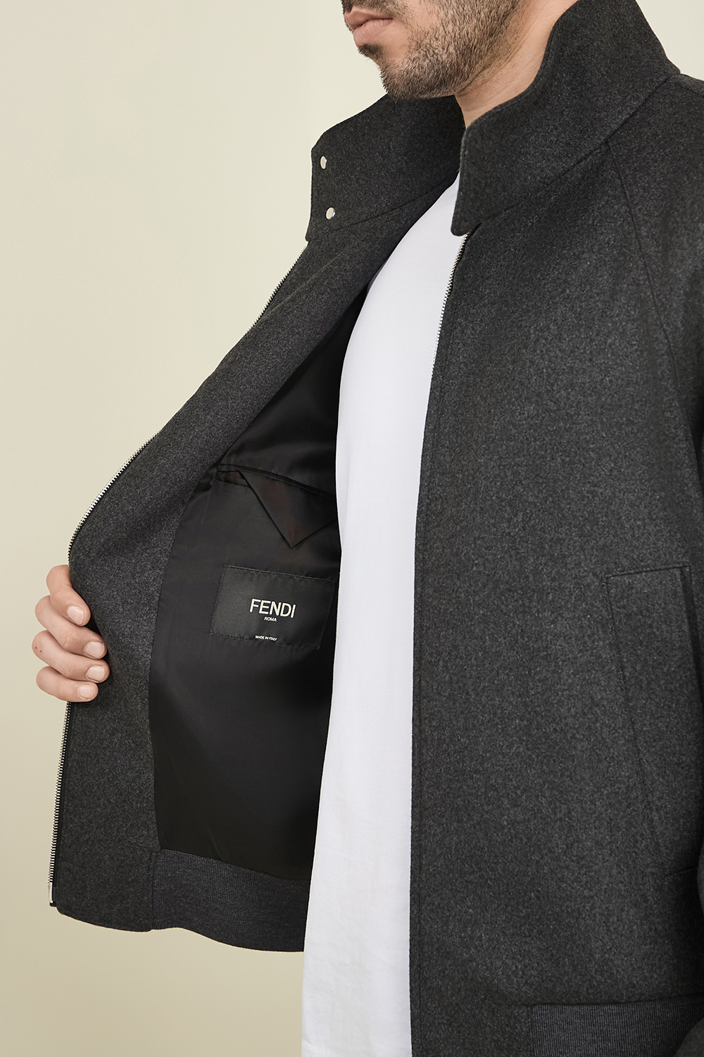 ז'קט קשמיר בגזרה משוחררת מבית Fendi, עשויים קשמיר בצבע אפור, עם ביטנת ויסקוזה שחורה. יש לו שני כיסי צד, כיס פנימי והוא נסגר ברוכסן וכפתור תיק תק בצוווארון. לבשו אותו כחלק מחליפה עם מכנסיים תואמים המוצעים מתוך הקולקציה.