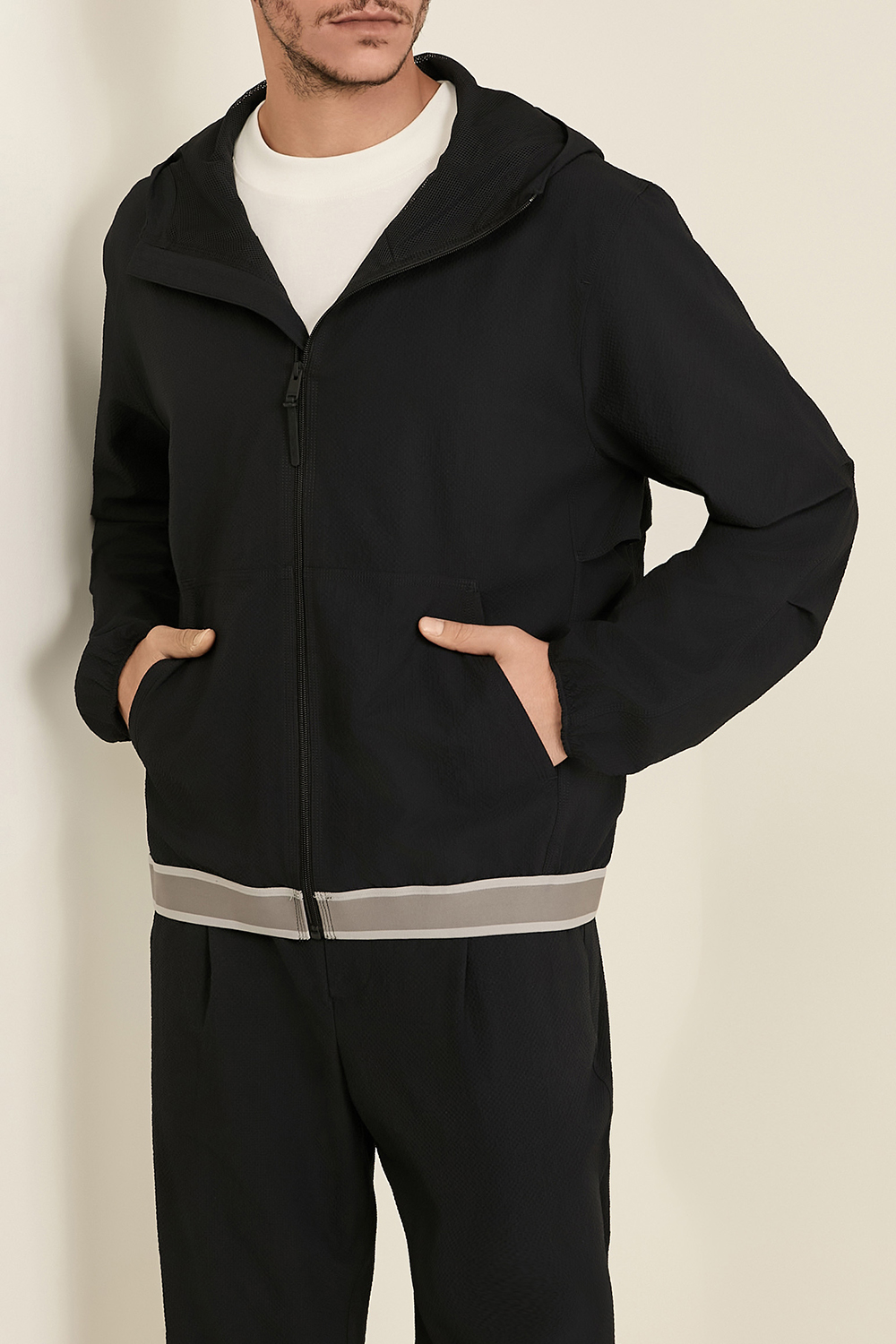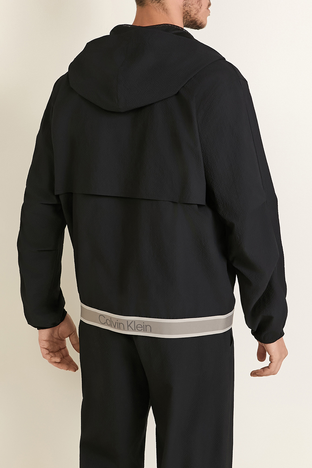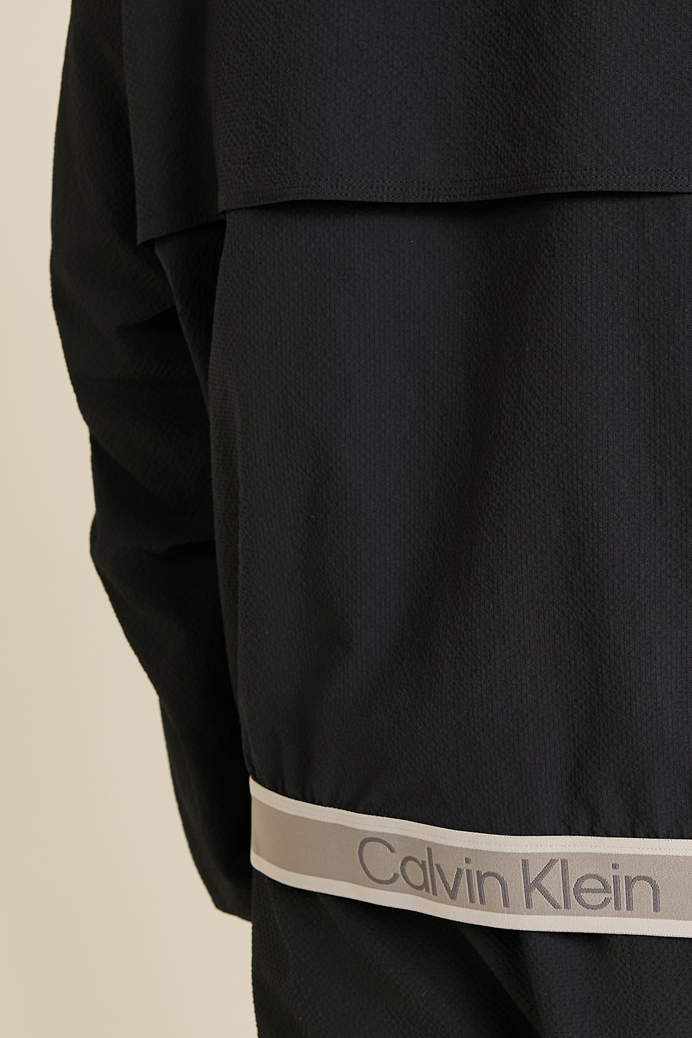 ז'קט רוח מבית Calvin Klein, עשוי פוליאסטר בצבע שחור ובעיצוב פס בז' בסיומת. לז'קט כובע קפוצ'ון עם שני כיסי צד, כשלוגו המותג מופיע בחלק האחורי. מומלץ לשלב עם המכנסיים התואמים מהקולקציה.