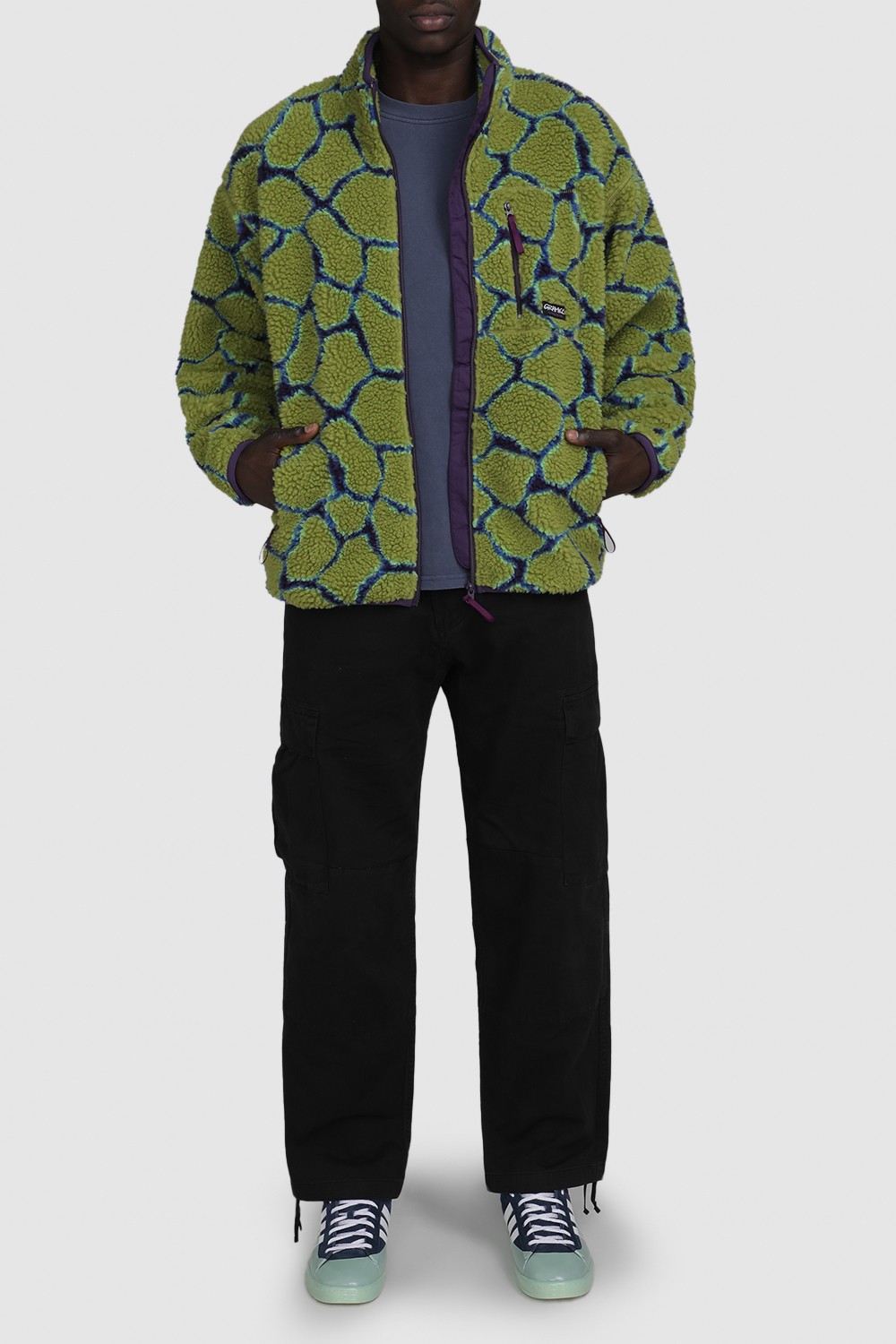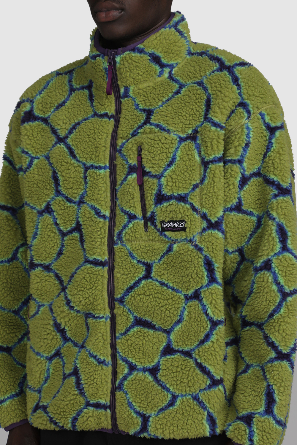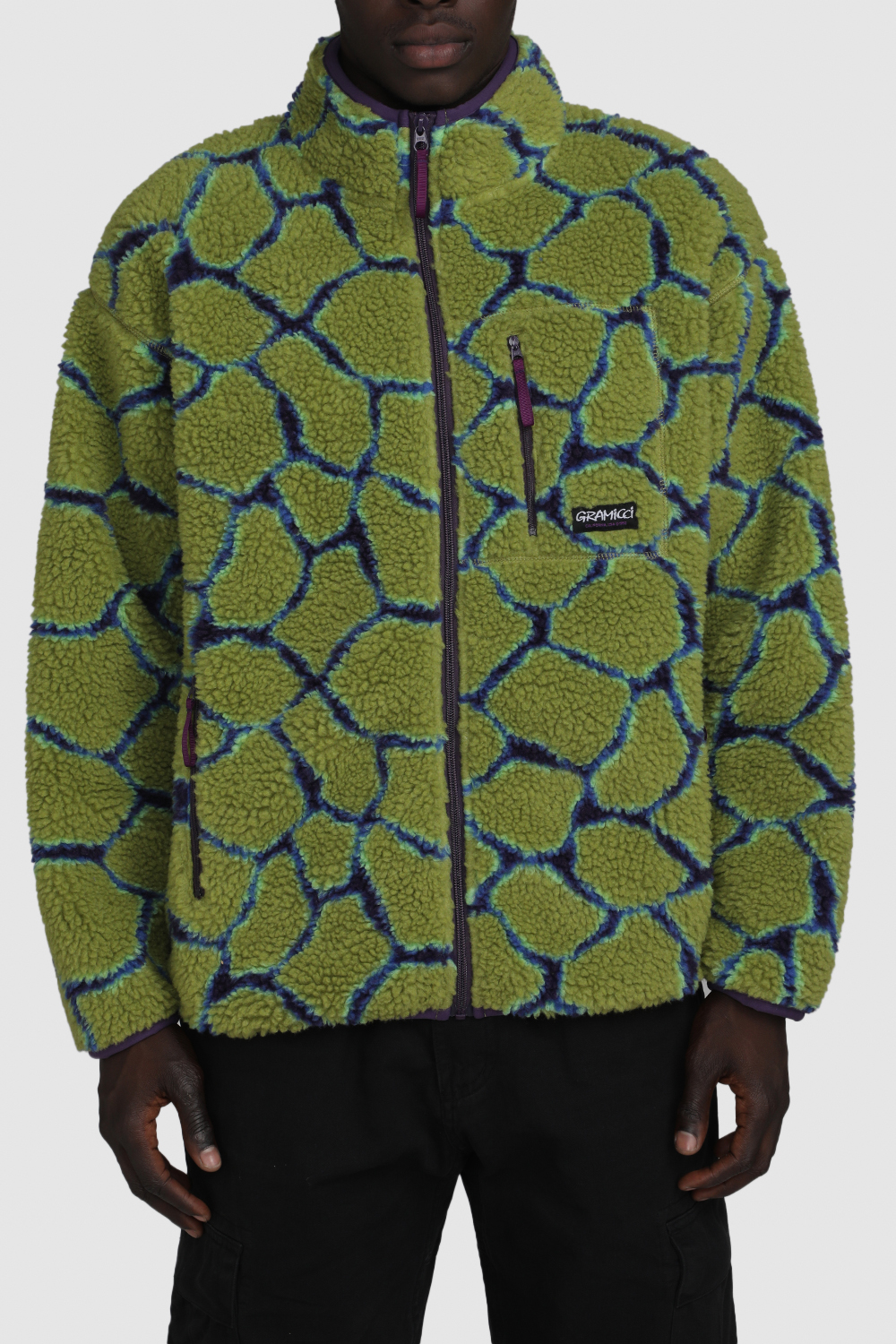 ז'קט שרפה מבית Gramicci, עשוי פוליאסטר בצבע ירוק עם דוגמת ברקים כחולים.