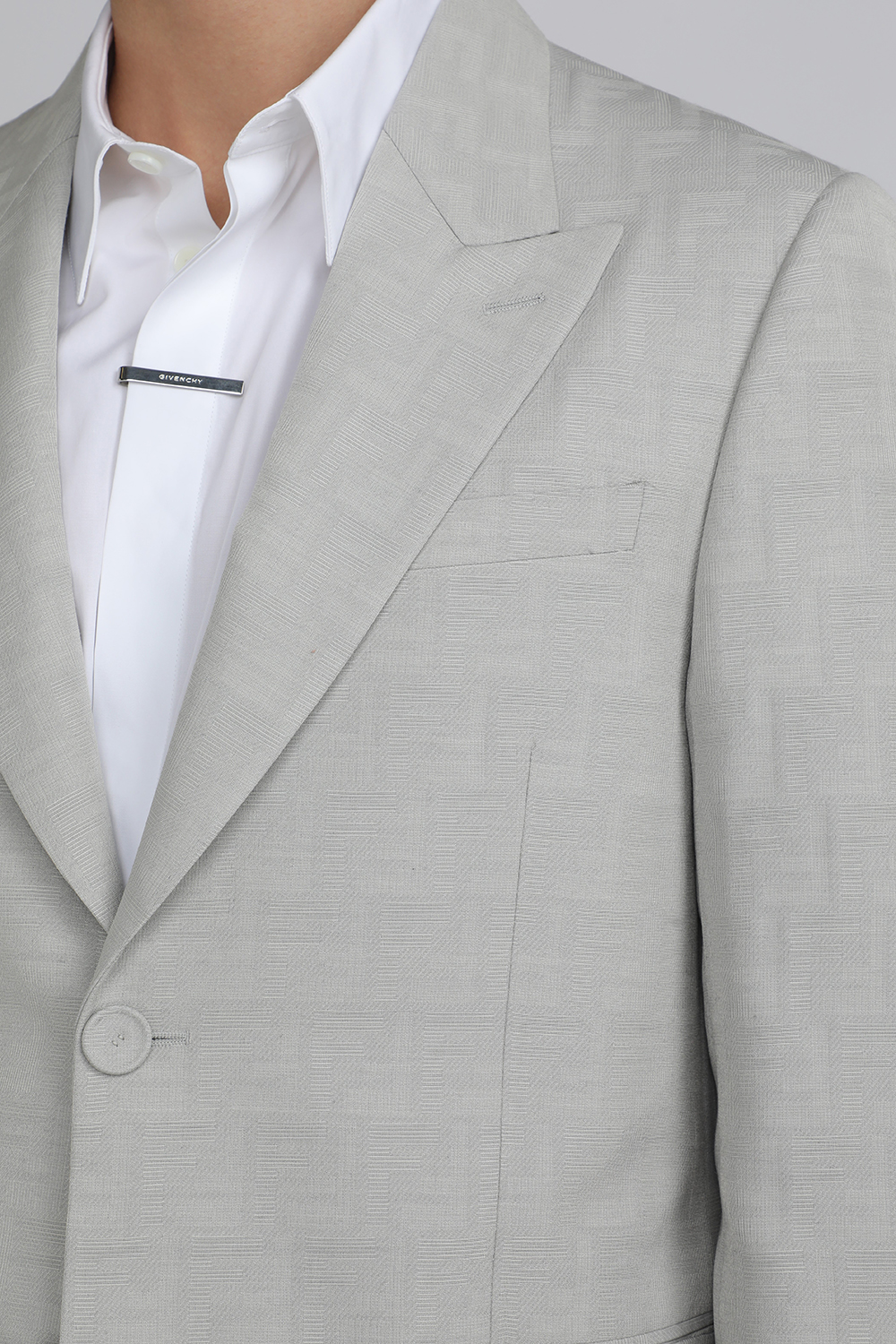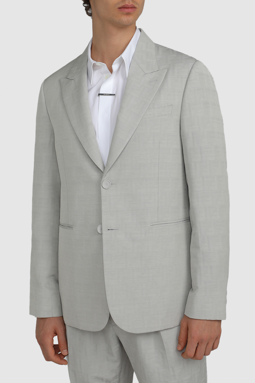 ז`קט מבית Fendi, עשוי תערובת צמר, פוליאסטר ומשי בצבע אפור וברקמת מונוגרמה. לז`קט צווארון מחודד בשילוב שני כפתורים בחזית עם כיס חזה ושני כיסי צד. להשלמת המראה מומלץ לרכוש את המכנסיים התואמים.