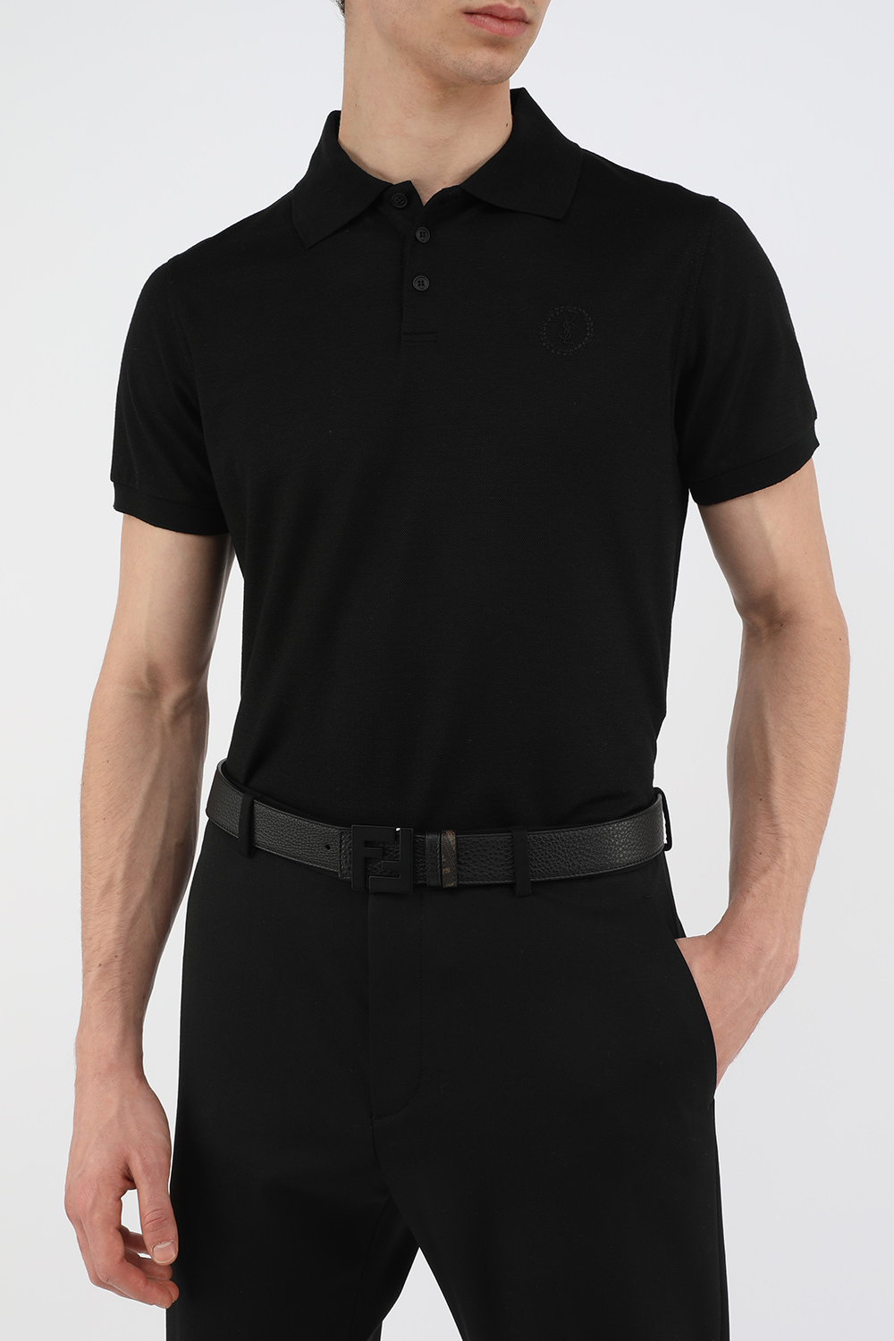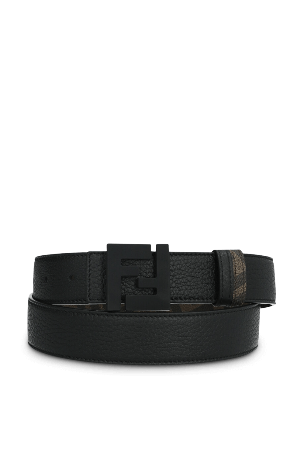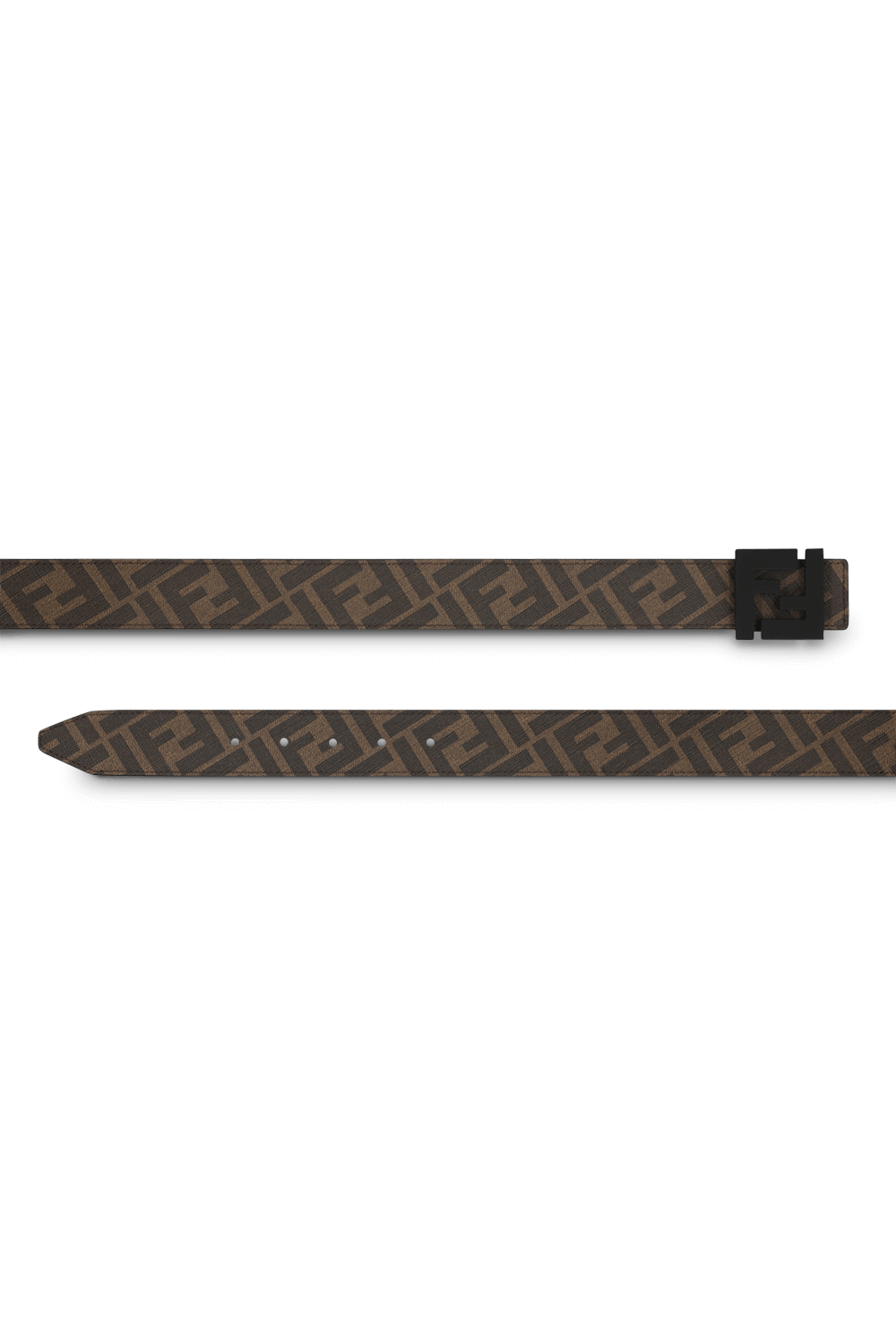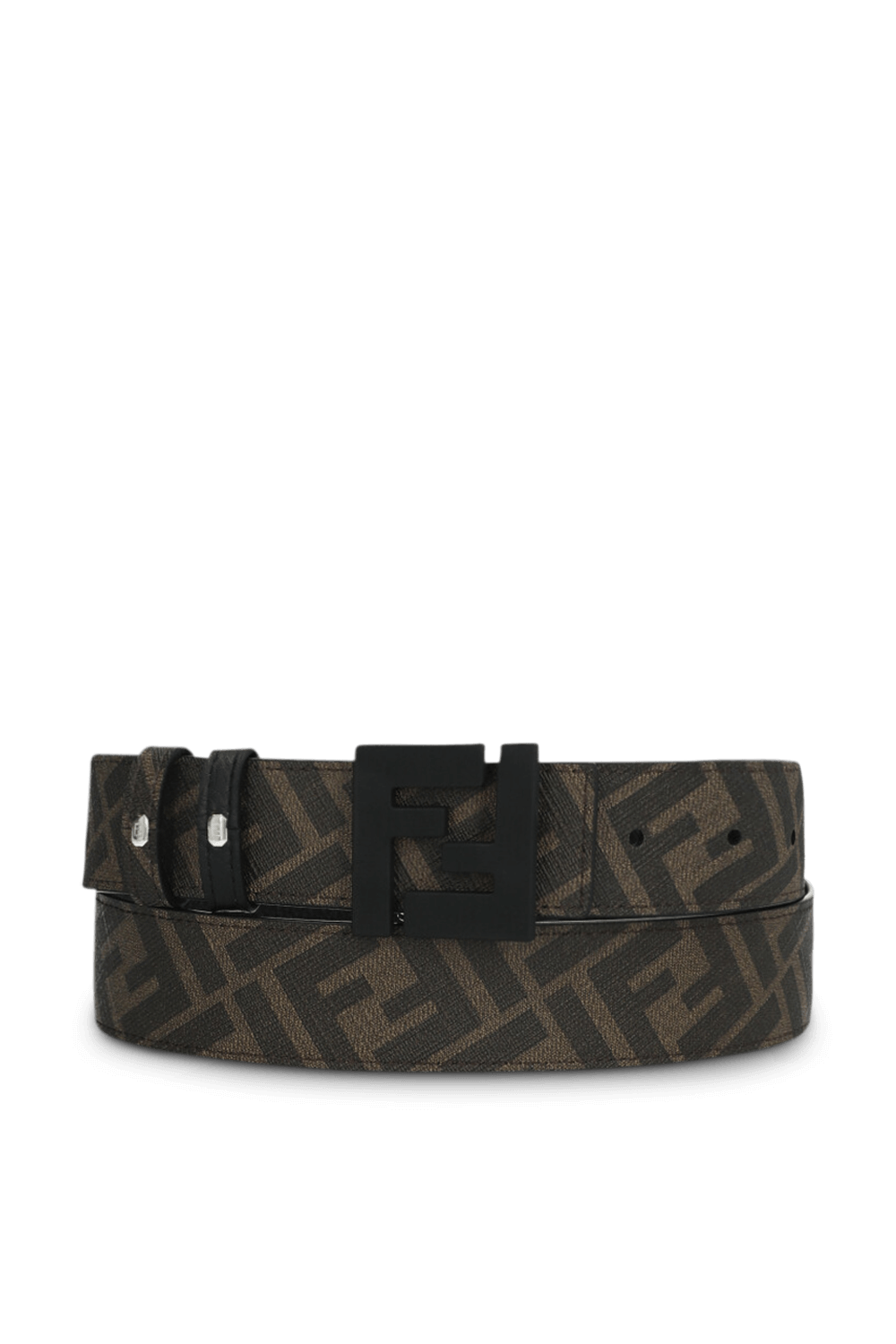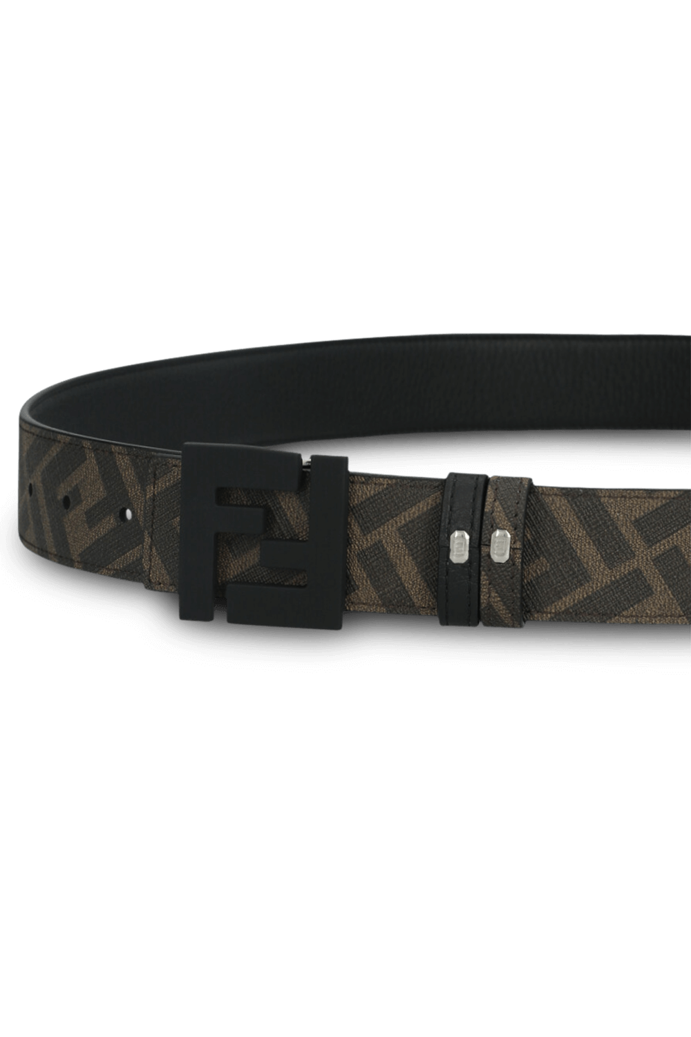 חגורה דו צדדית מבית Fendi, עשויה עור בצבע שחור עם אבזם לוגו מטאלי. בצידה השני החגורה עשויה כותנת קנבס בהדפס לוגו מונגרמי בגוונים חומים.