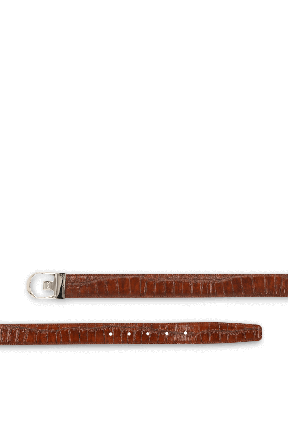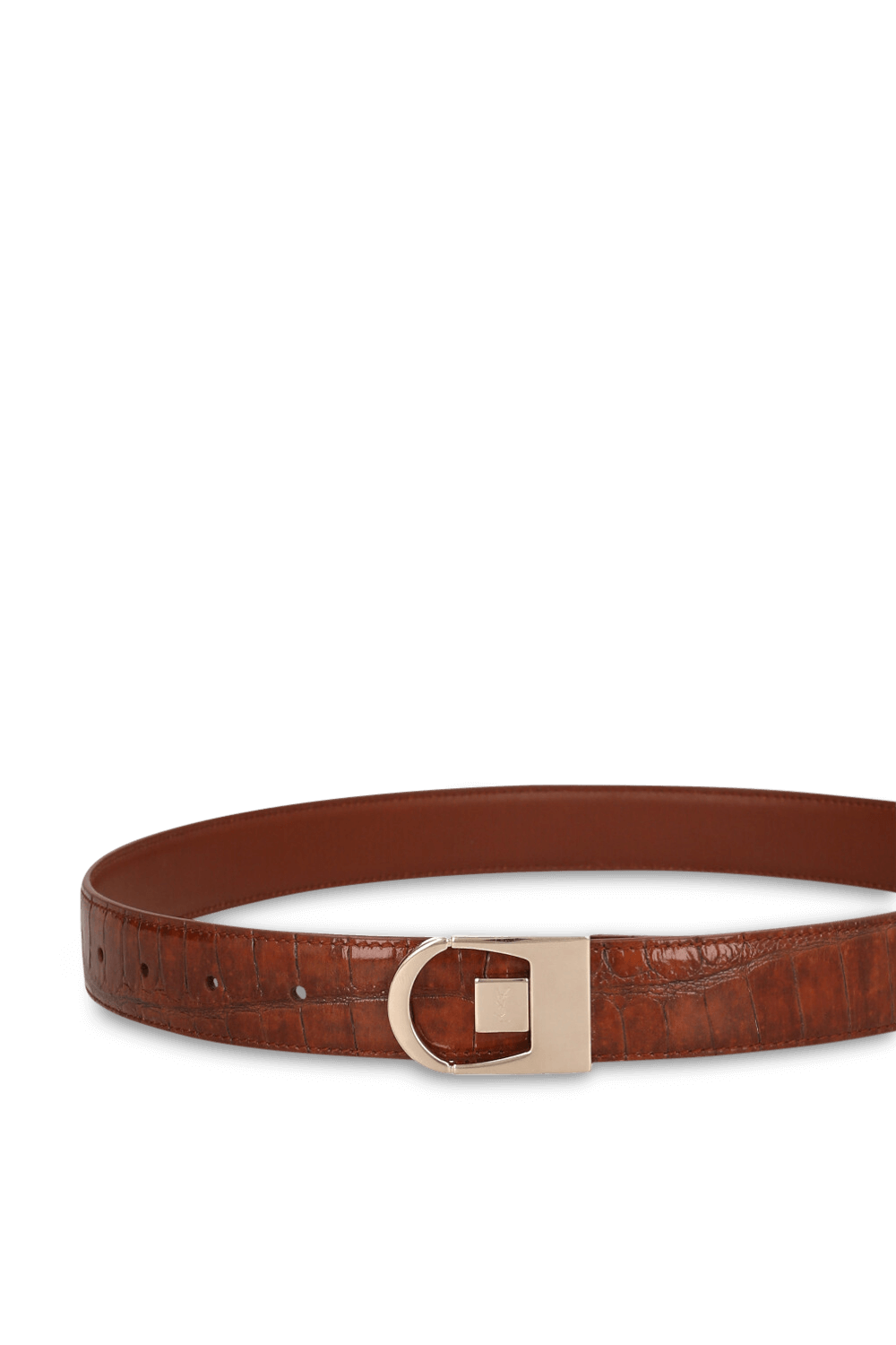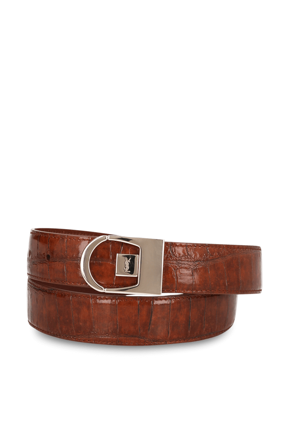 חגורה דו צדדית מבית Saint Laurent, עשויה עור בצבע חום - מצד אחד בדוגמת קרוקו ומצד שני עור חלק. יש לה אבזם קלאסי, המעוצב בטאץ' רטרו. הוא נשלף מהחגורה כך שניתן לסובב אותו בהתאם לצבע החגורה הרצוי.