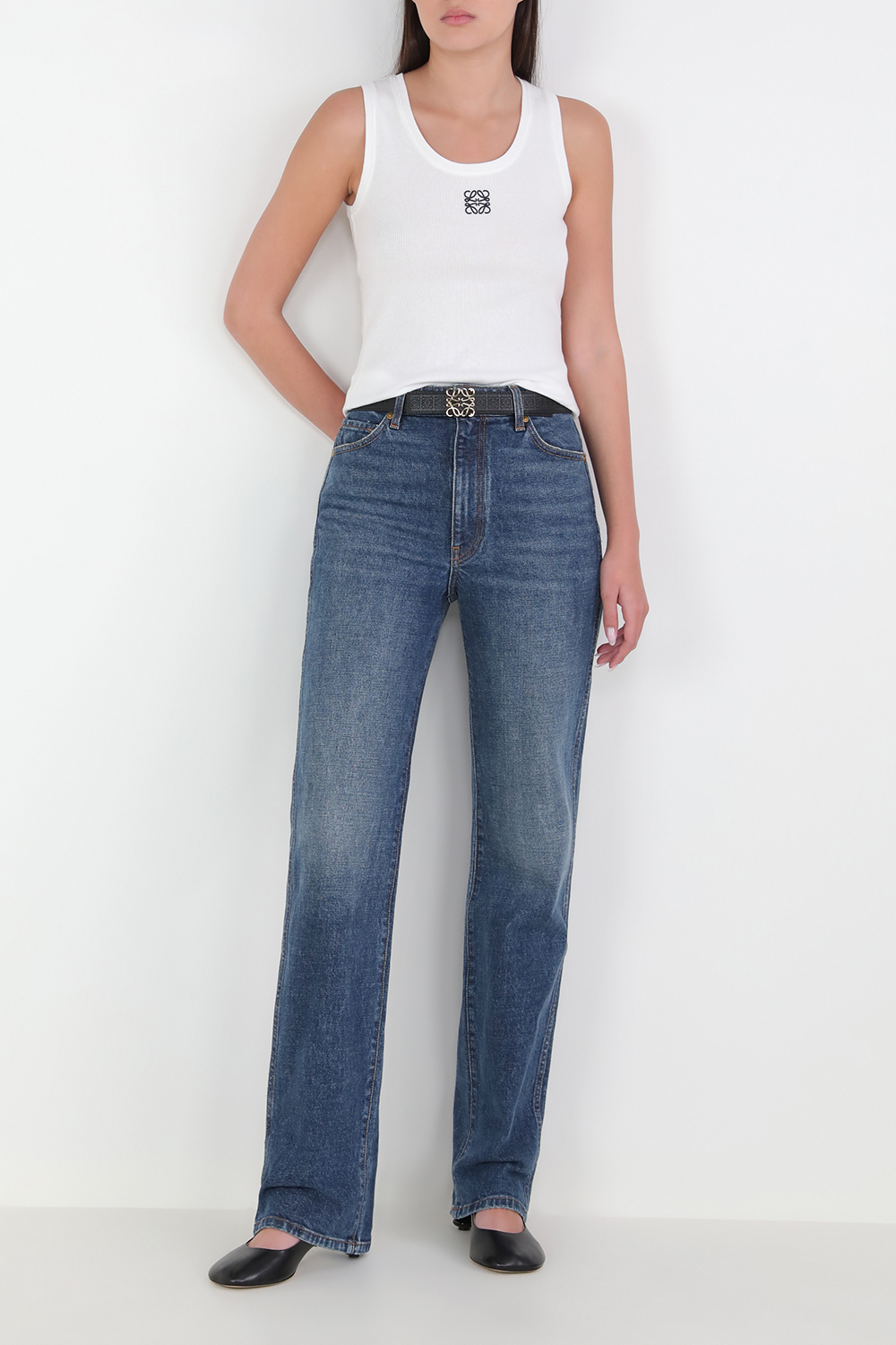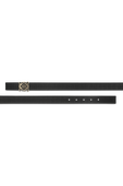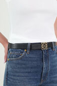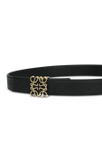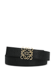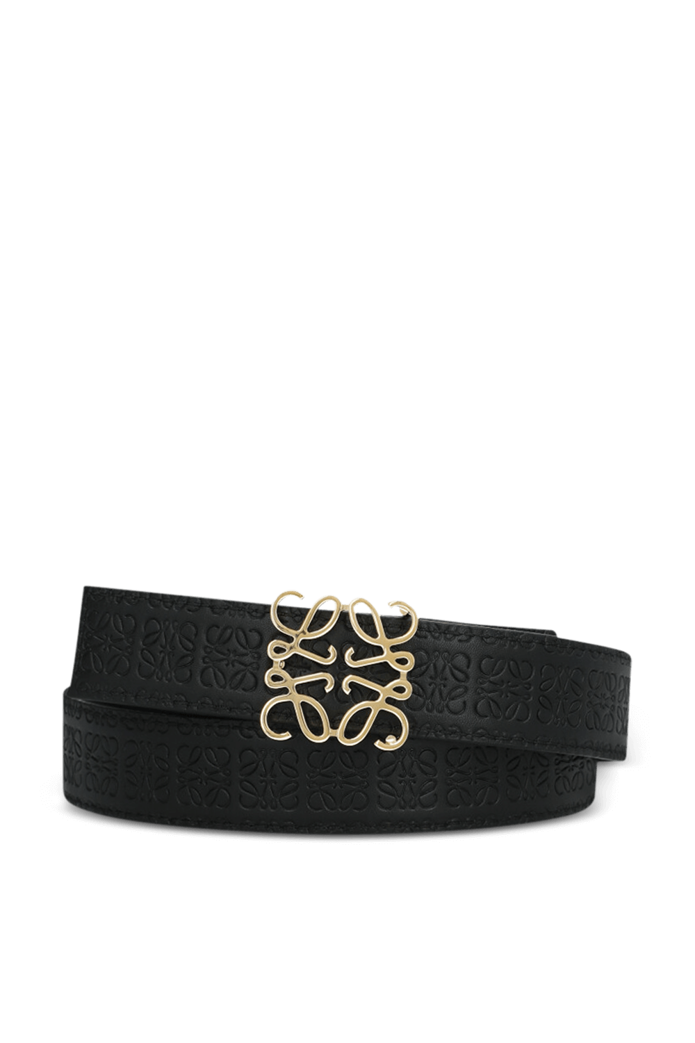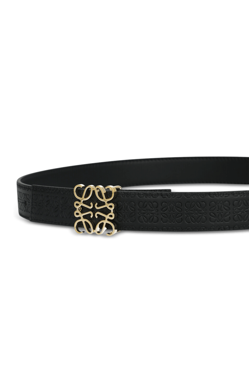 חגורה דו צדדית מבית Loewe, עשויה עור כשצד אחד בצבע שחור בעיצוב חריטת מונוגרמה והצד בשני בצבע שחור חלק. לחגורה אבזם מטאלי זהוב בחזית, כשהיא מגיעה באריזת מתנה בעיצוב המותג.