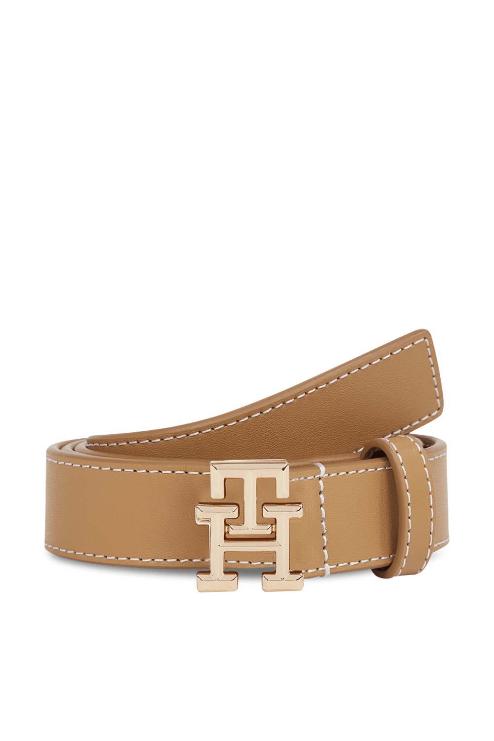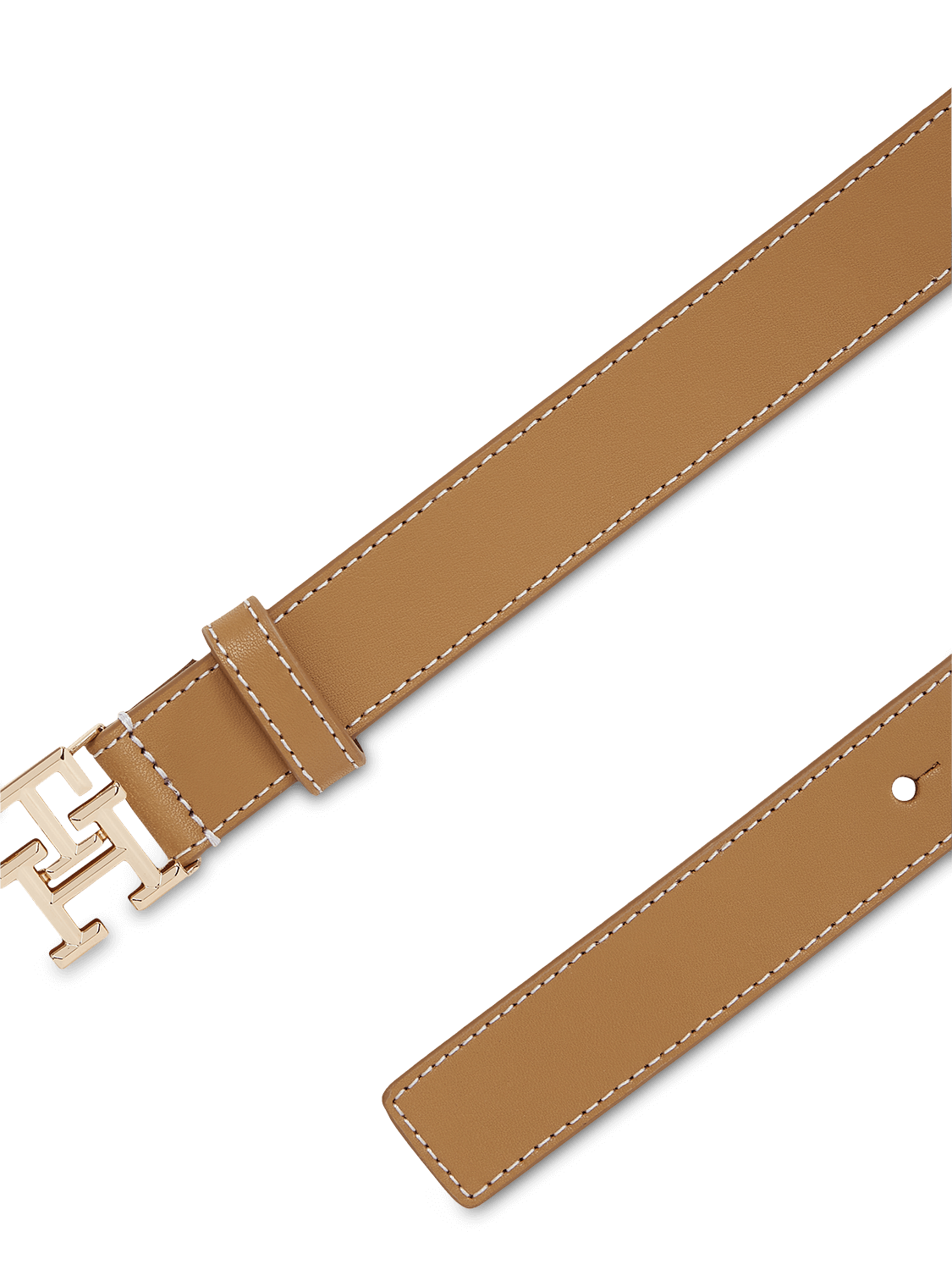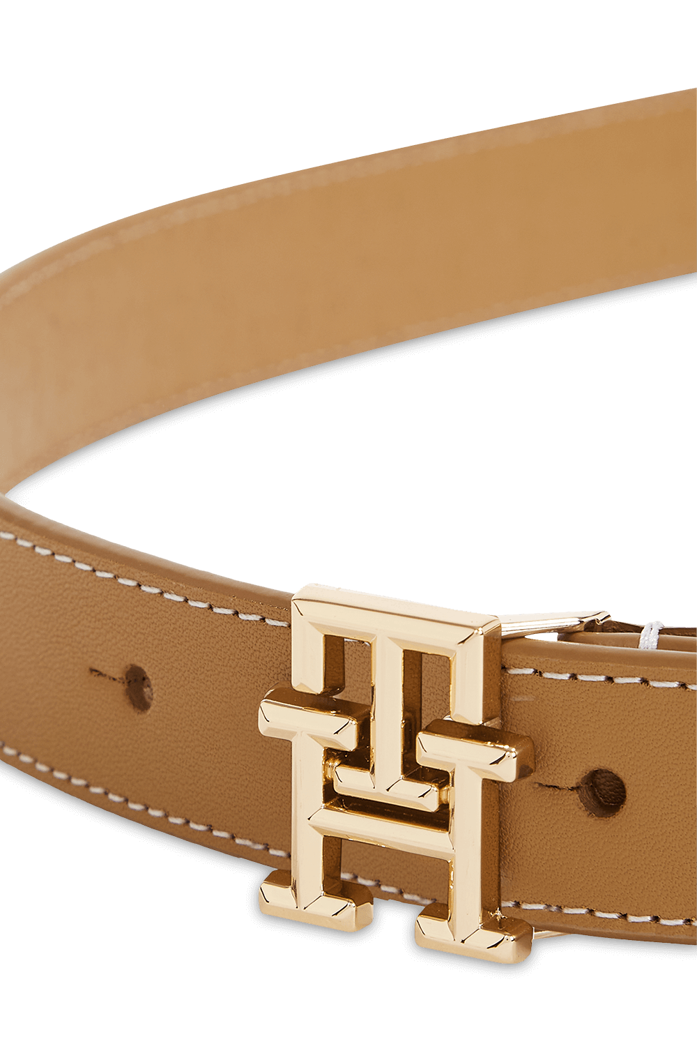 חגורה מבית Tommy Hilfiger, עשויה עור בצבע חום עם אבזם TH זהוב.