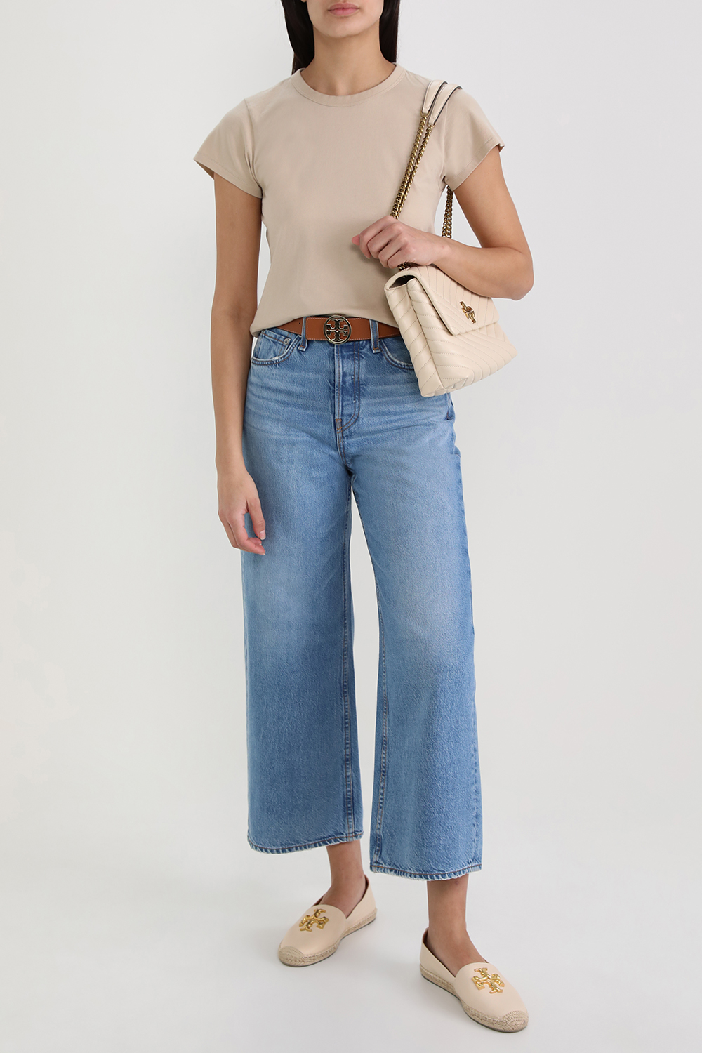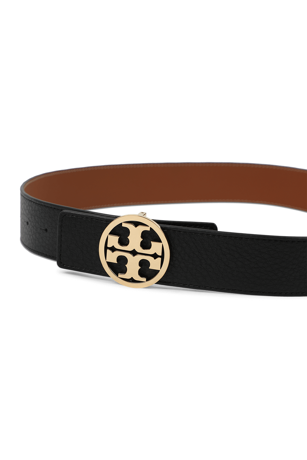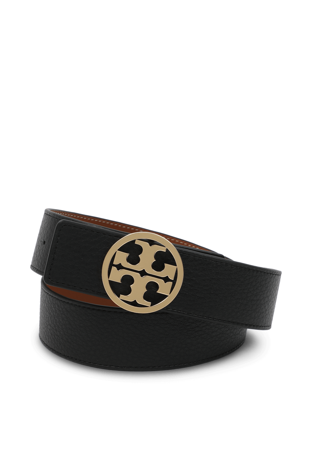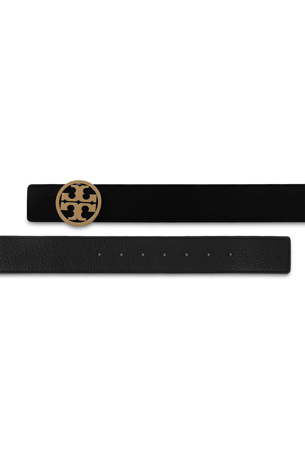 "חגורת עור Miller בעיצוב בית האופנה Tory Burch, בגימור מגורען ובעיצוב דו צדדי בצבעי חום ושחור. לחגורה אבזם מטאלי מוזהב בחיתוך לוגו המותג."
