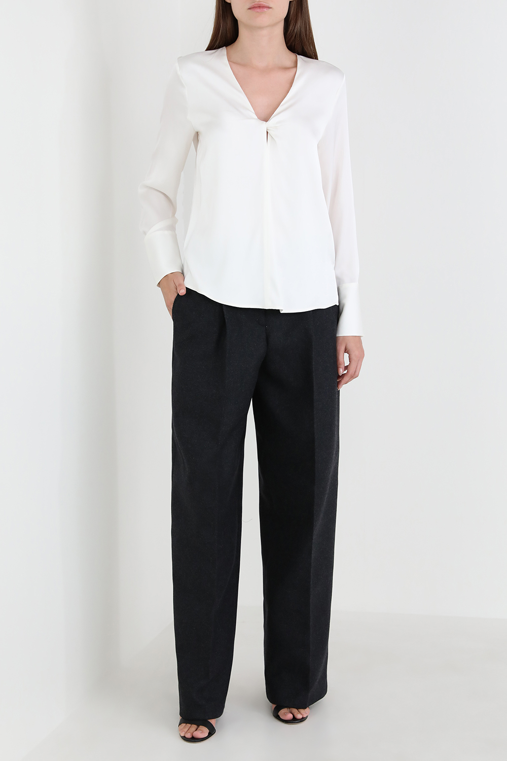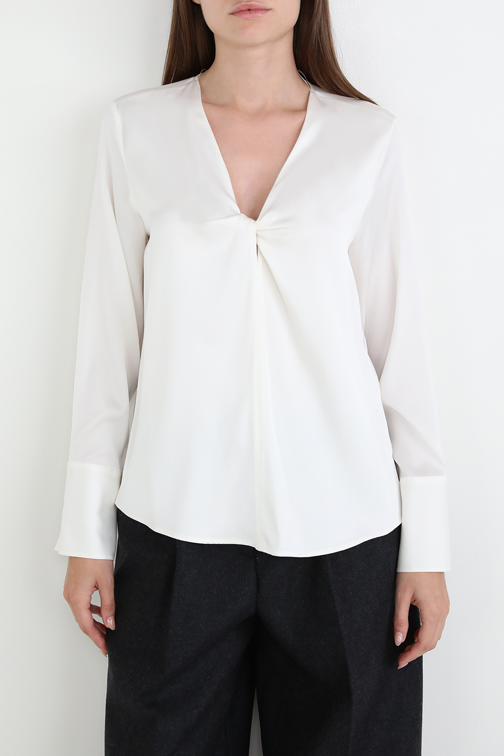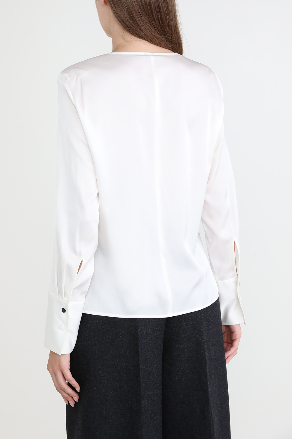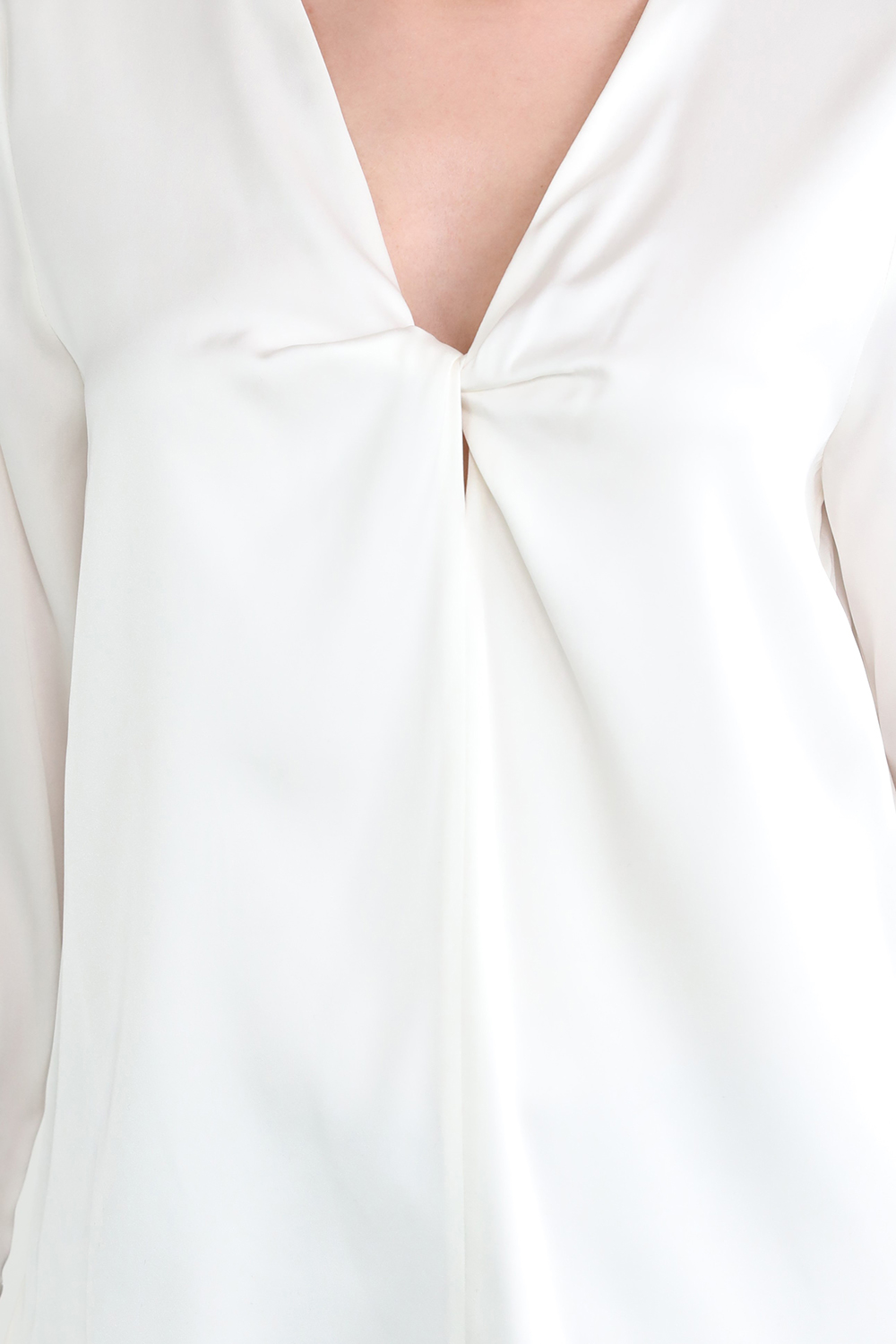 חולצה ארוכה מבית Boss, עשויה משי בגימור סאטן בצבע שמנת בשילוב מפתח צווארון וי עם עיצוב קשר בחזית.