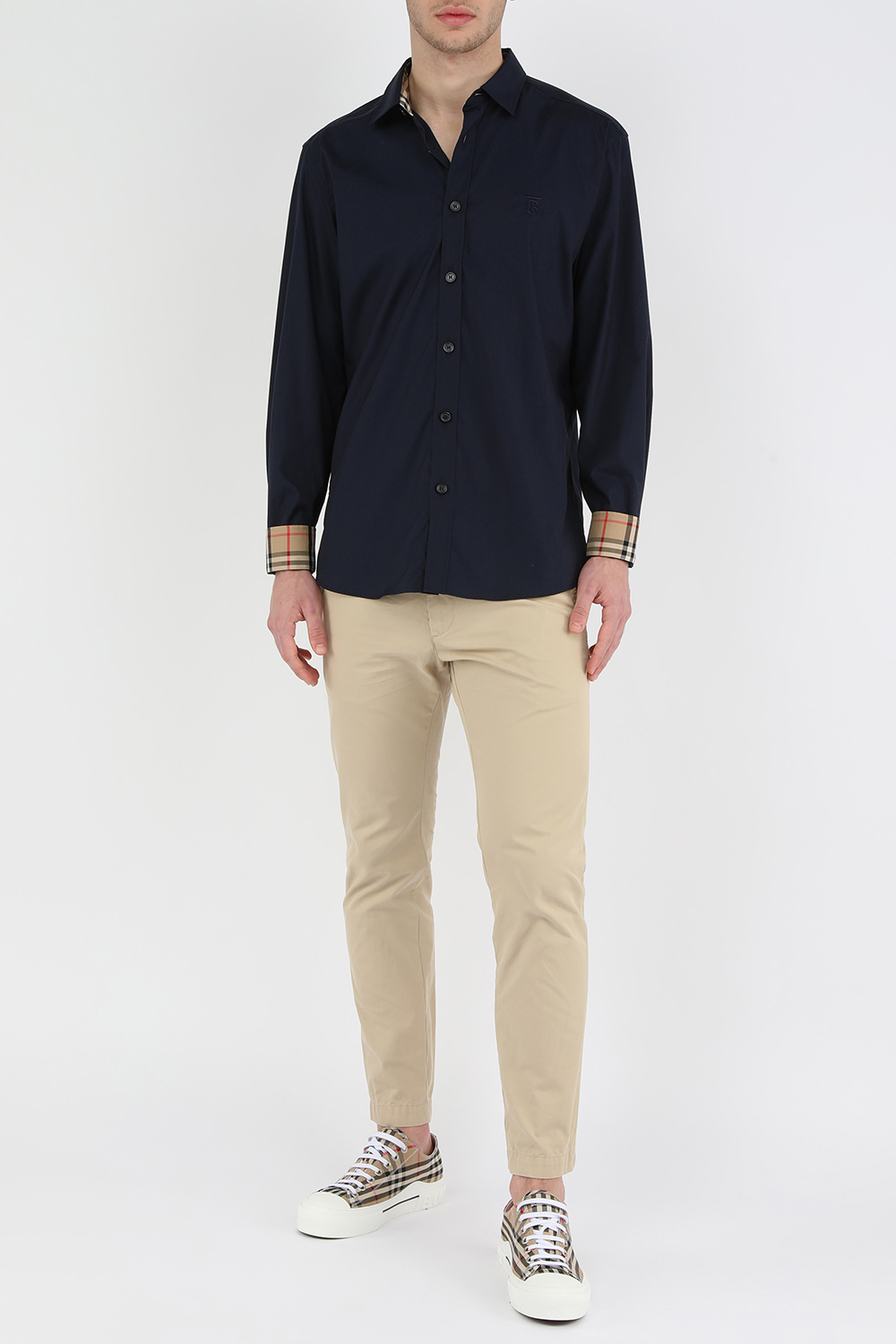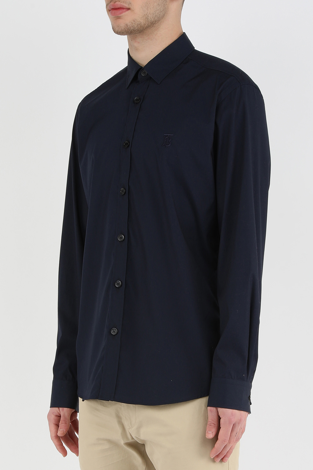 חולצת כפתורים כחולה בעלת סטייל נצחי לבית Burberry הבריטי. חולצה זו תפורה באיכות מכותנה משובחת וסטרצ`ית לכדי גזרה קלאסית ומדויקת. דוגמת המשבצות האייקונית המזוהה עם המותג- מעטרת את חלקו הפנימי של צווארונה בעוד שורת כפתורי פנינה טונאליים משמשים לרכסיתה. לוגו הרוכב הרקום בחוט טונאלי באזור החזה- משלים את עיצובו של פריט זה אשר יחתום בטאץ` מוביל ויוקרתי מגוון אאוטפיטים לשעות היום או הערב.