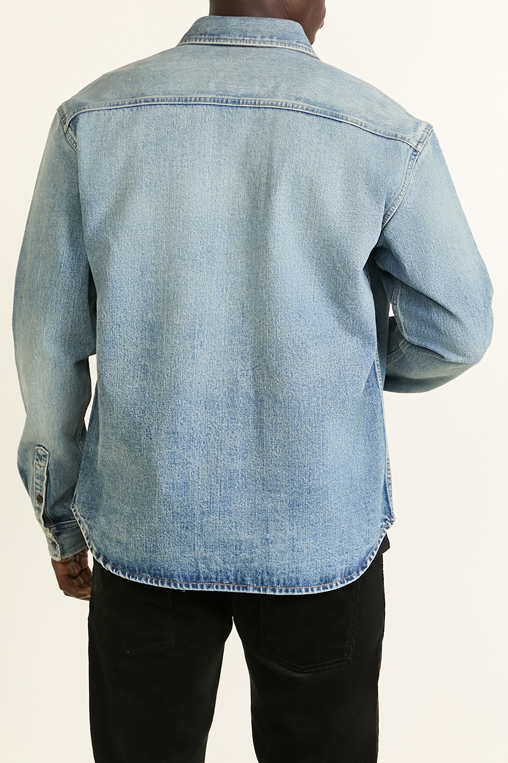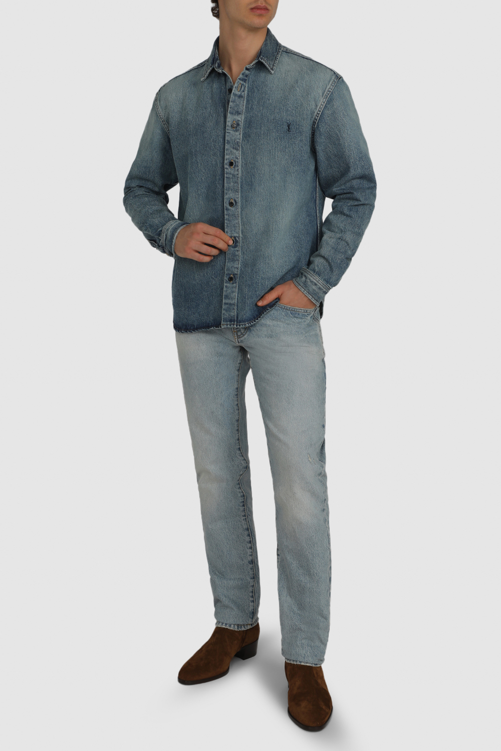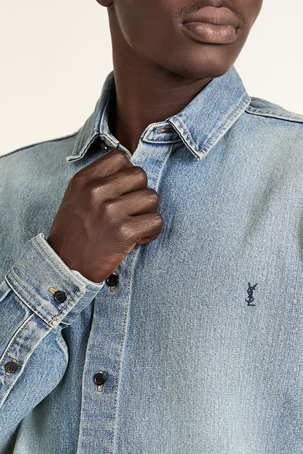 חולצה מכופתרת מבית Saint Laurent, תוצרת איטליה, עשויה כותנת דנים בצבע כחול במראה וינטג' עם רקמת לוגו בצד החזה. ניתן ללבוש את החולצה כמכופתרת קלאסית, או בפתיחת הכפתורים עם חולצת טי.