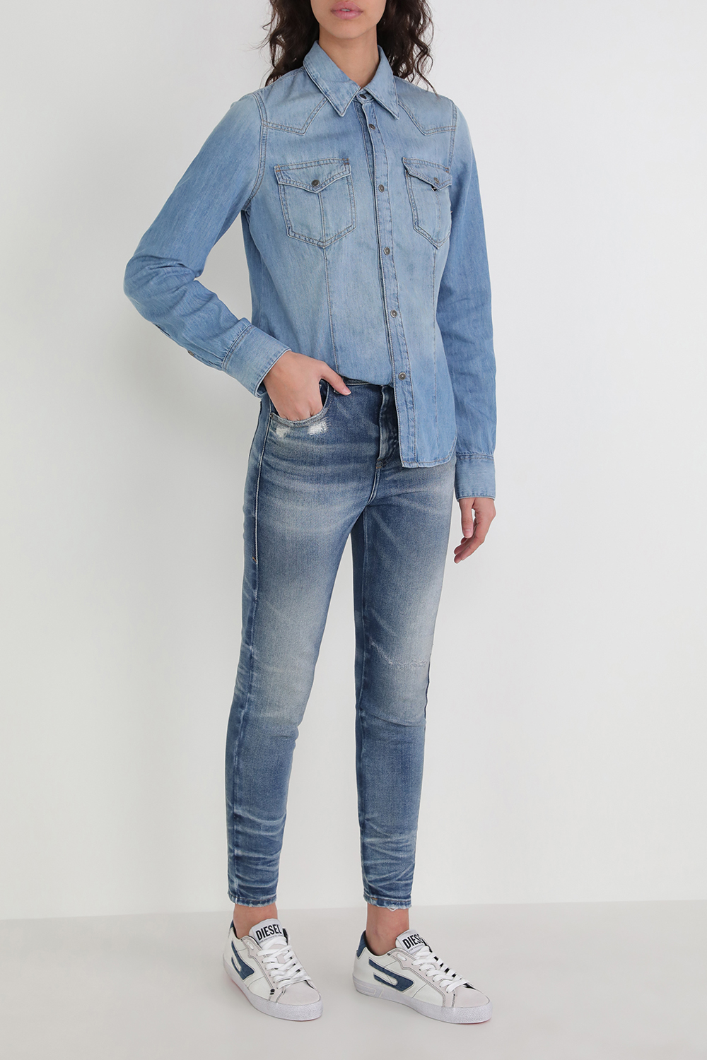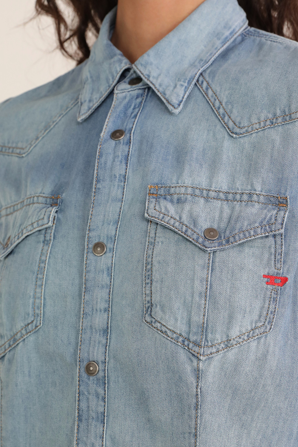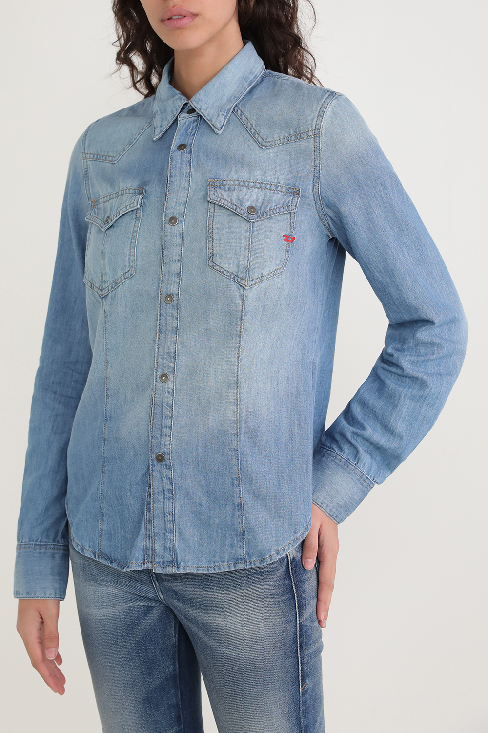 חולצה מכופתרת מבית Diesel, עשויה כותנת דנים בשטיפה כחולה בהירה עם צווארון מחודד ושני כיסי חזה.