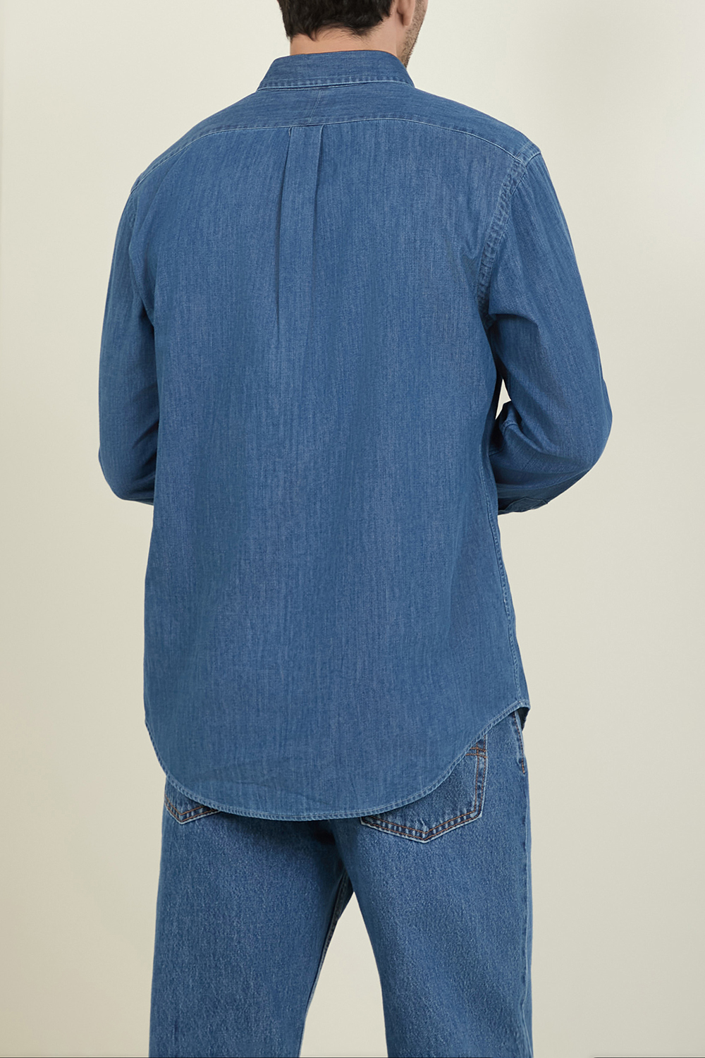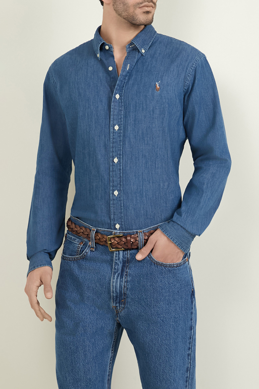 חולצת מכופתרת ג'ינס מבית Polo Ralph Lauren, עשויה כותנה בצבע כחול עם לוגו צבעוני רקום על החזה.
