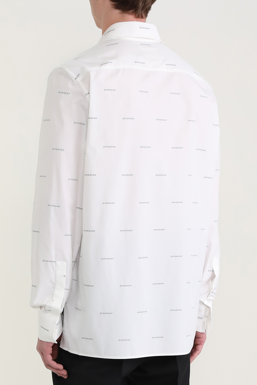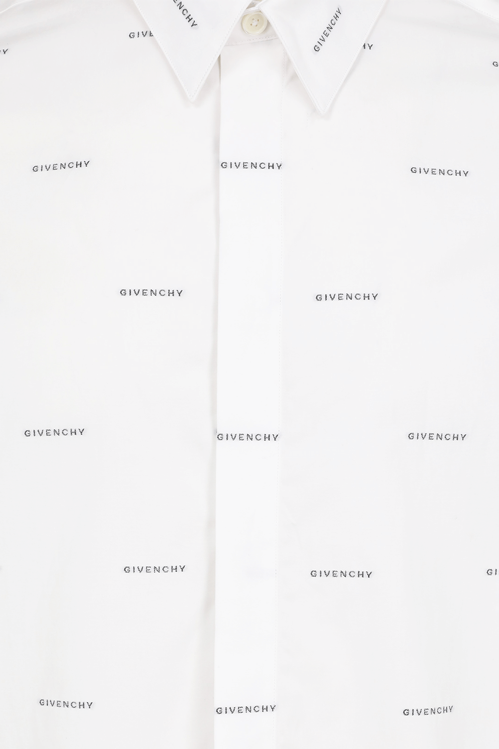 חולצה מכופתרת ארוכה בעיצוב המותג Givenchy, העשויה 100% כותנה עמידה ואיכותית בגוון לבן עם דוגמה חוזרת של שם המותג בגוון קונטרסטי. לחולצה זו גזרה ישרה ומחוייטת עם צווארון משולש ורכיסת כפתורים חבויה, למראה אלגנטי ומדוייק במיוחד.\r\n