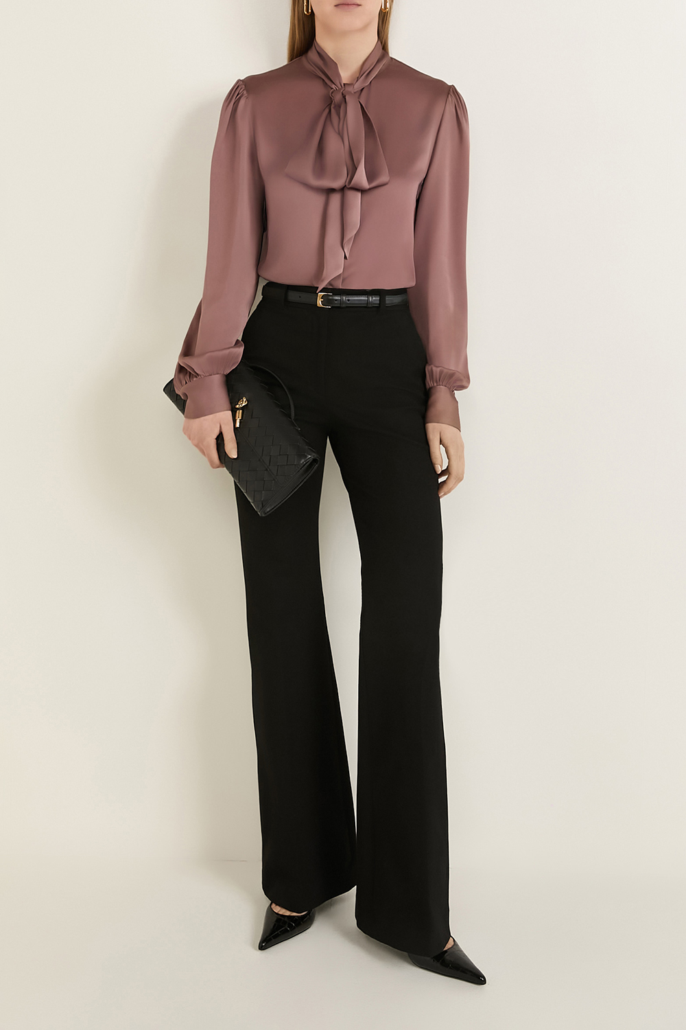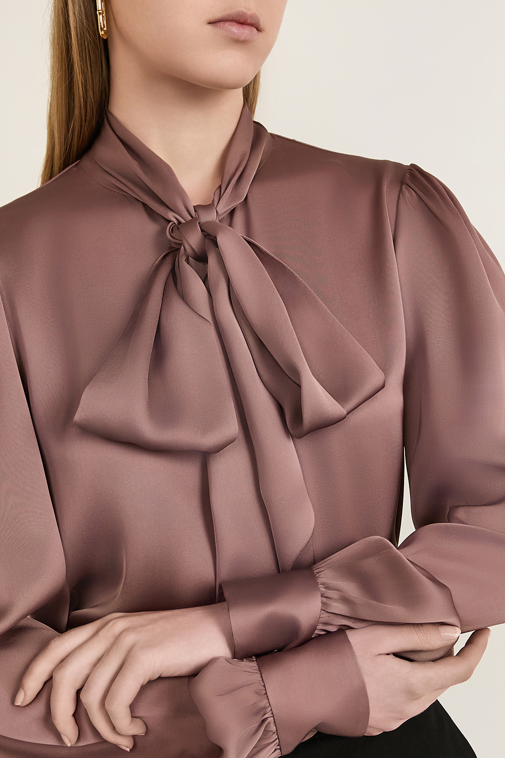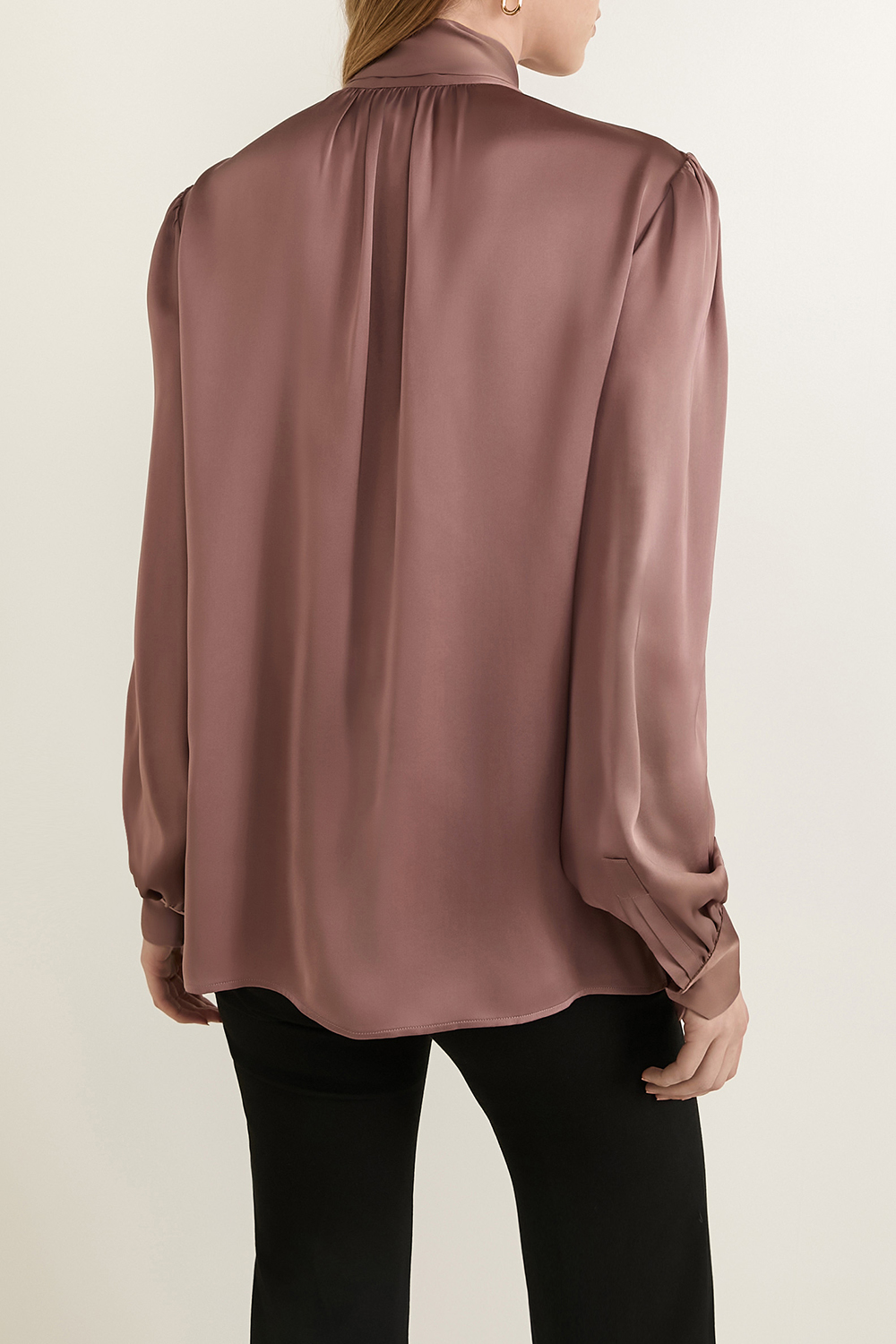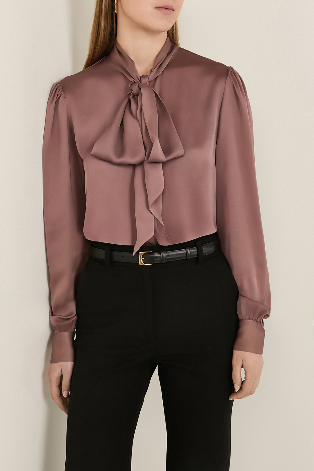 חולצה מכופתרת אלגנטית מבית Saint Laurent, תוצרת איטליה, עשויה משי בצבע ורוד קלאסי בשילוב סגירת כפתורים נסתרת לאורך החזית. לחולצה עיצוב עניבת לוואלייר, בשילוב שרוולים מעט נפוחים במראה אלגנטי.