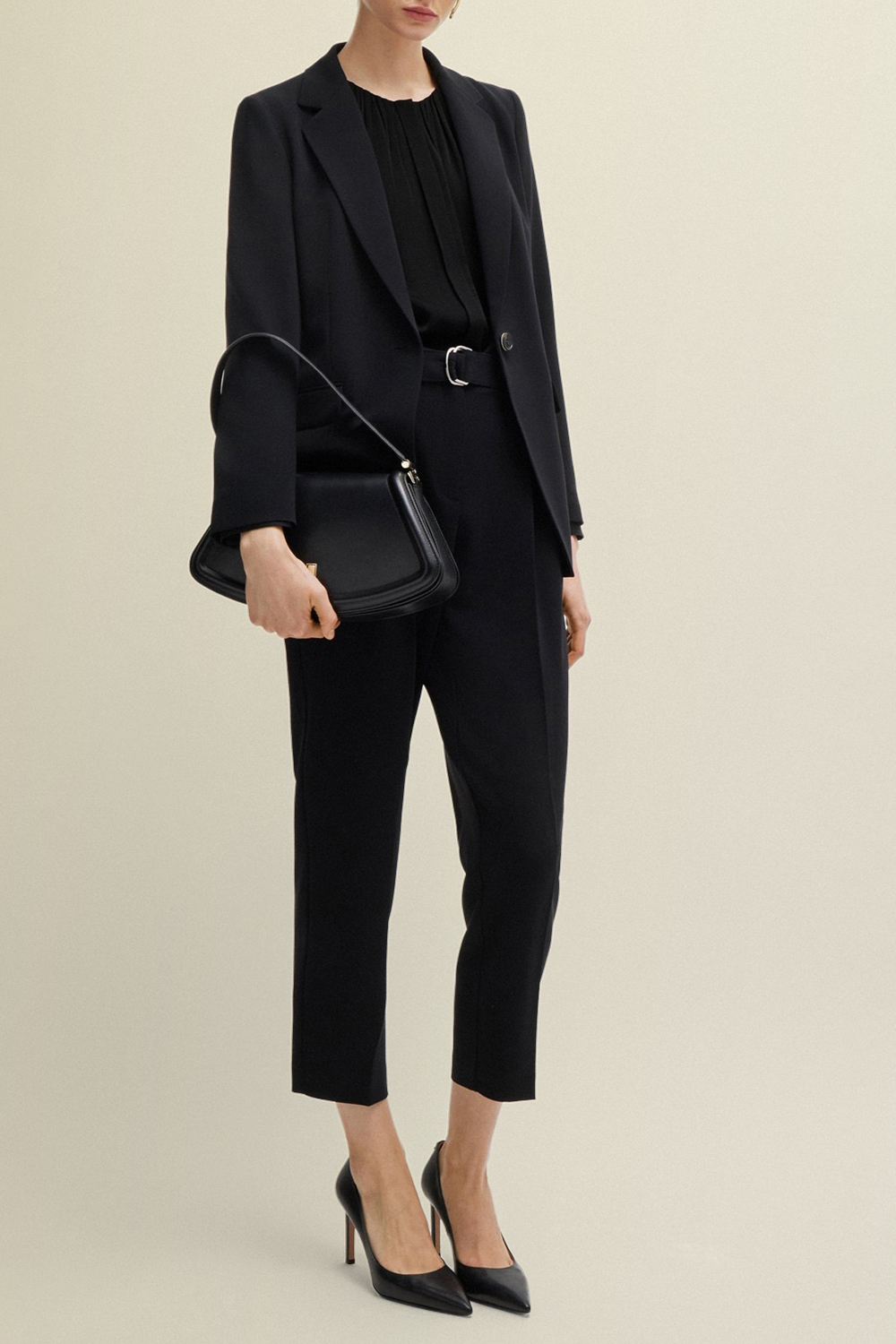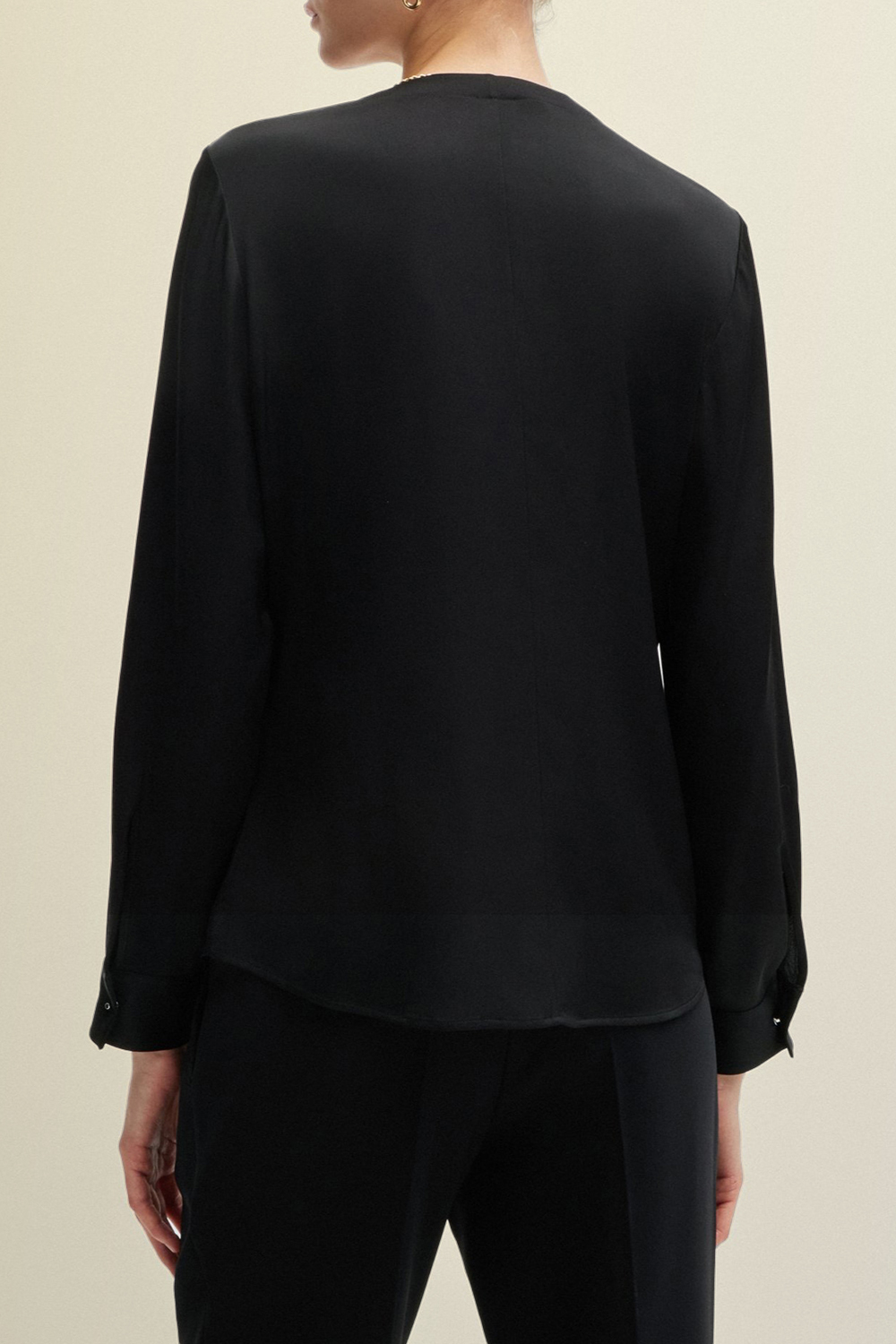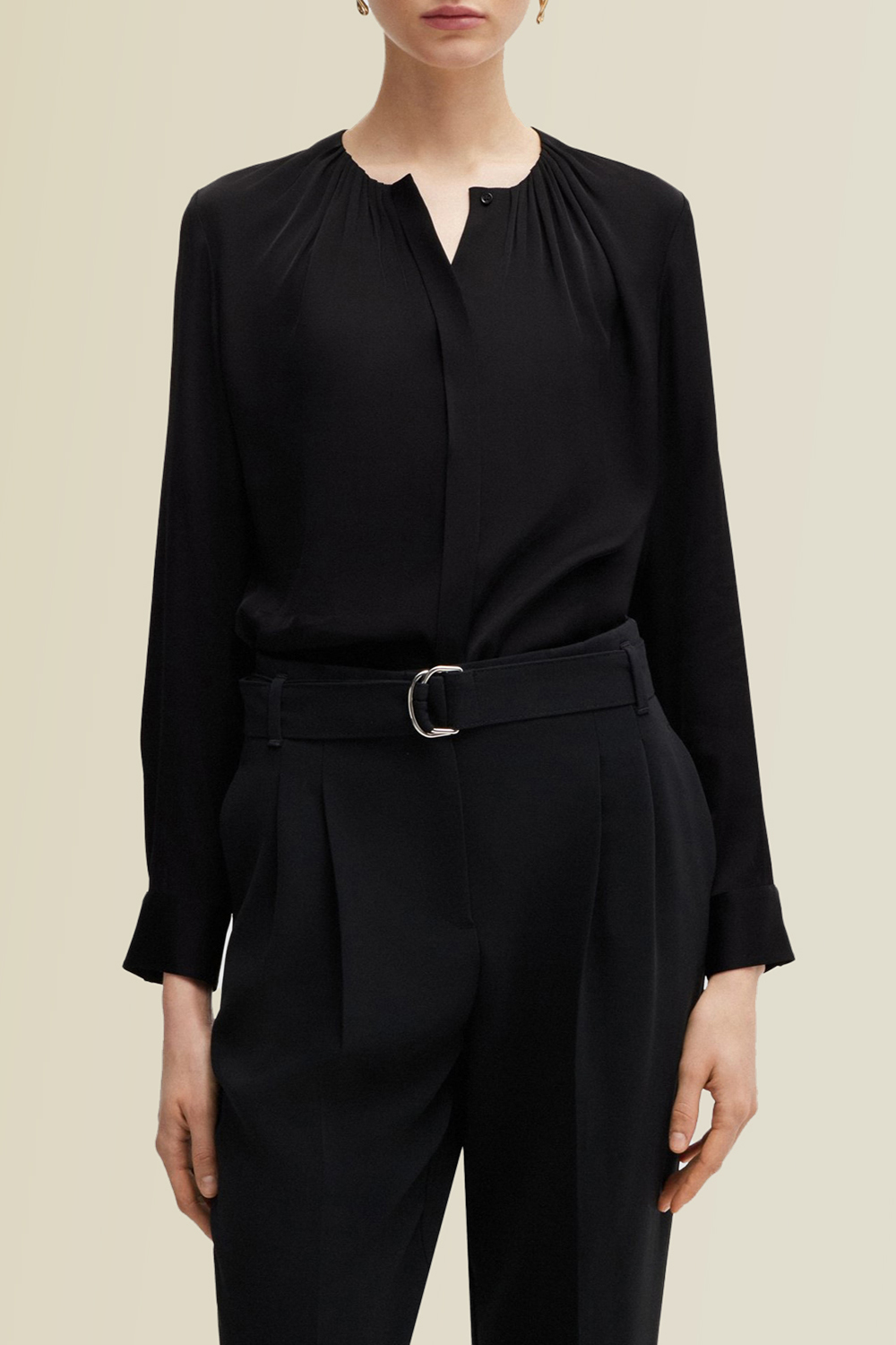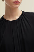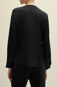 חולצה מכופתרת מבית Boss, עשויה תערובת משי ואלסטן בצבע שחור בעיצוב צווארון מעוגל גבוה במראה כיווצים עדינים. החולצה הקלאסית תשמש אותך ליצירת לוקים אלגנטיים.