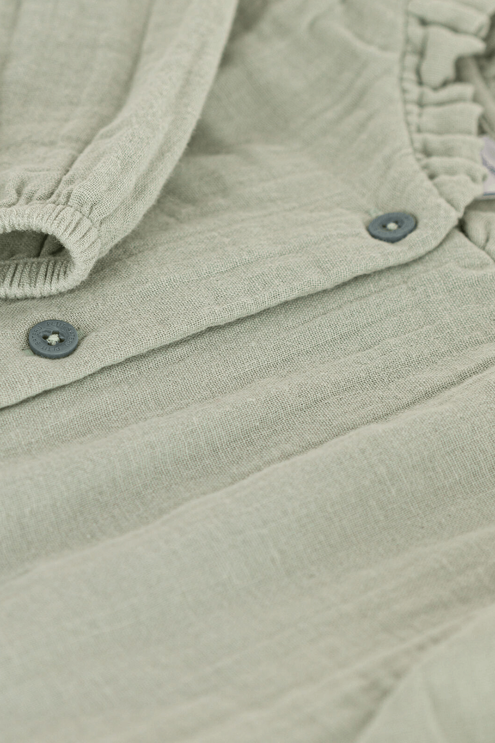 חולצה מכופתרת מבית Petit Bateau, עשויה כותנה אורגנית בצבע ירוק עם צווארון מלמלה ושרוולים תפוחים.