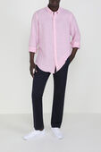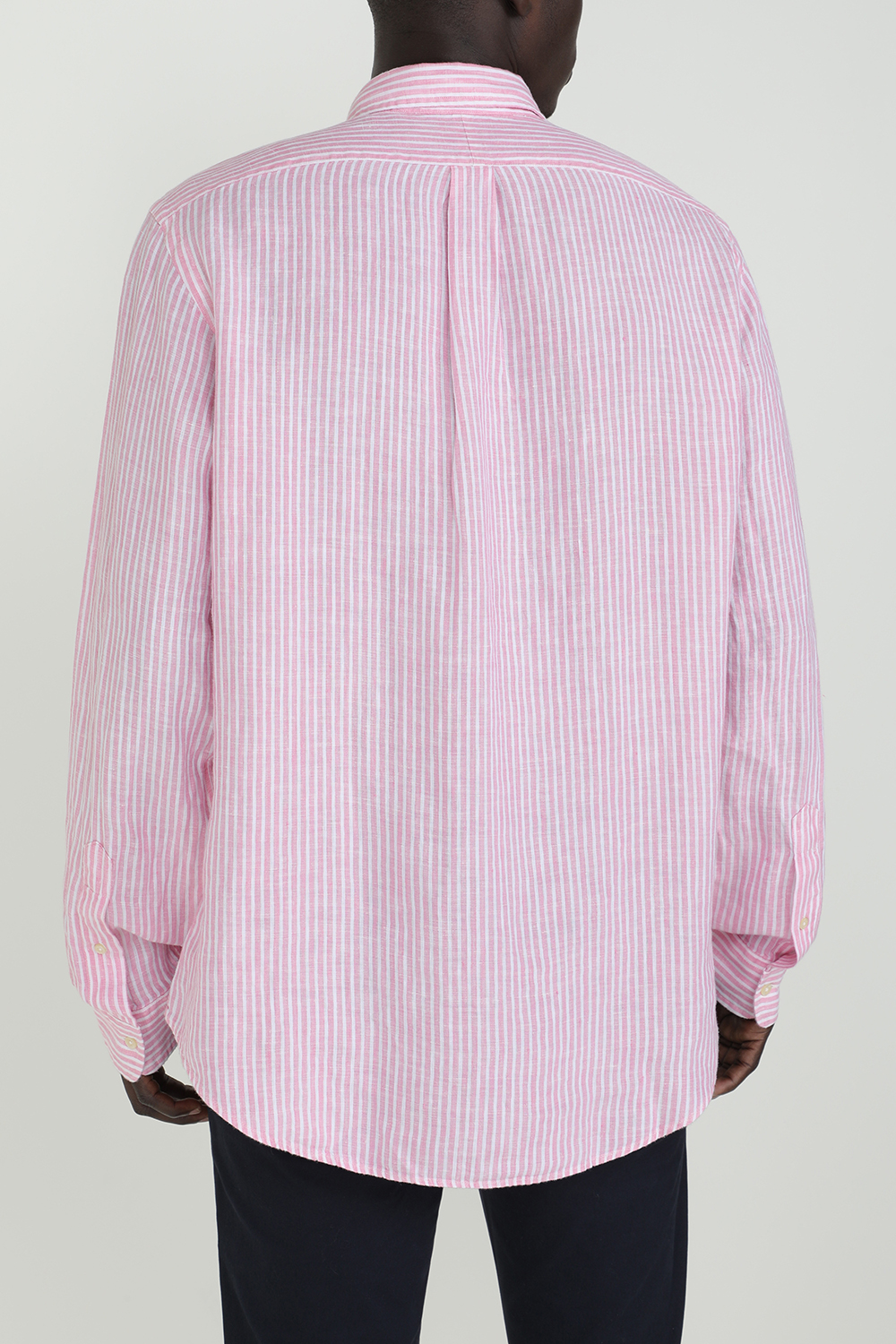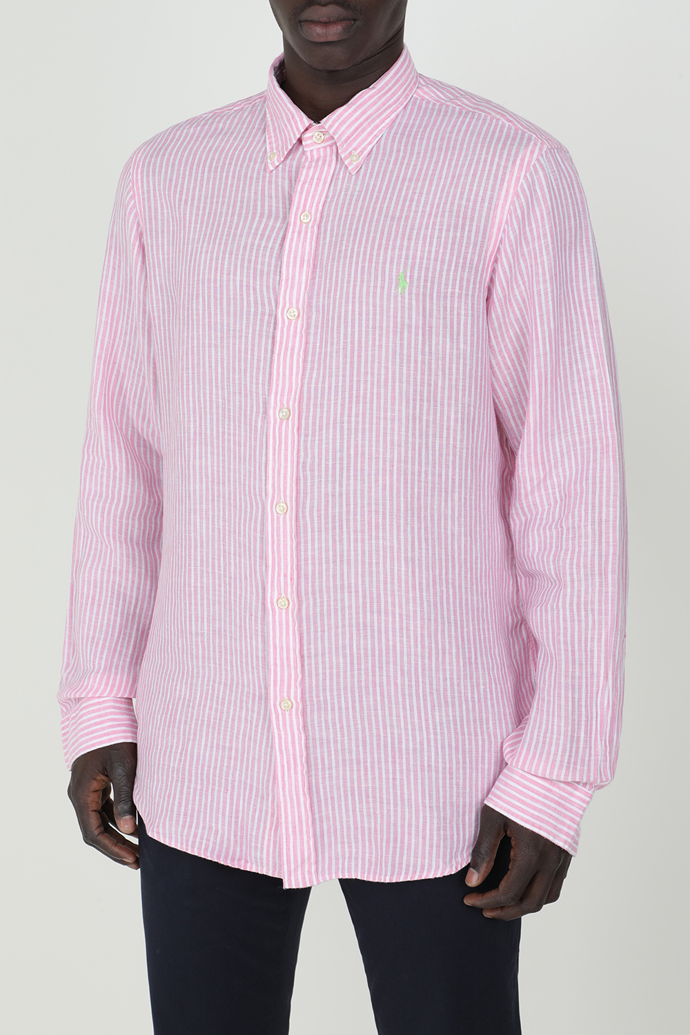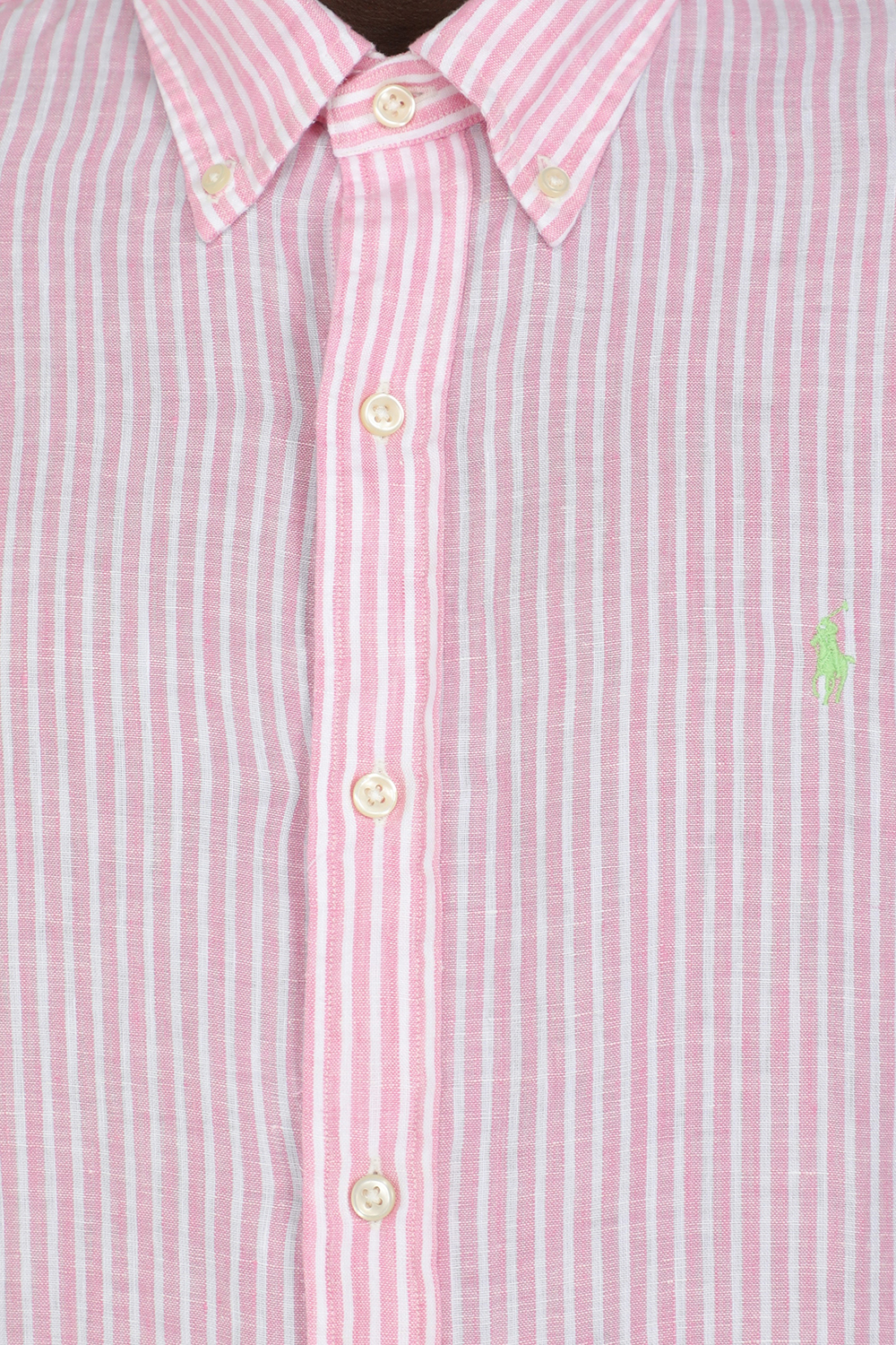 חולצה מכופתרת מבית Polo Ralph Lauren, עשויה פשתן בהדפס פסים בצבעי כחול ולבן, בשילוב צווארון מחודד כשלוגו המותג רקום בצד החזה.