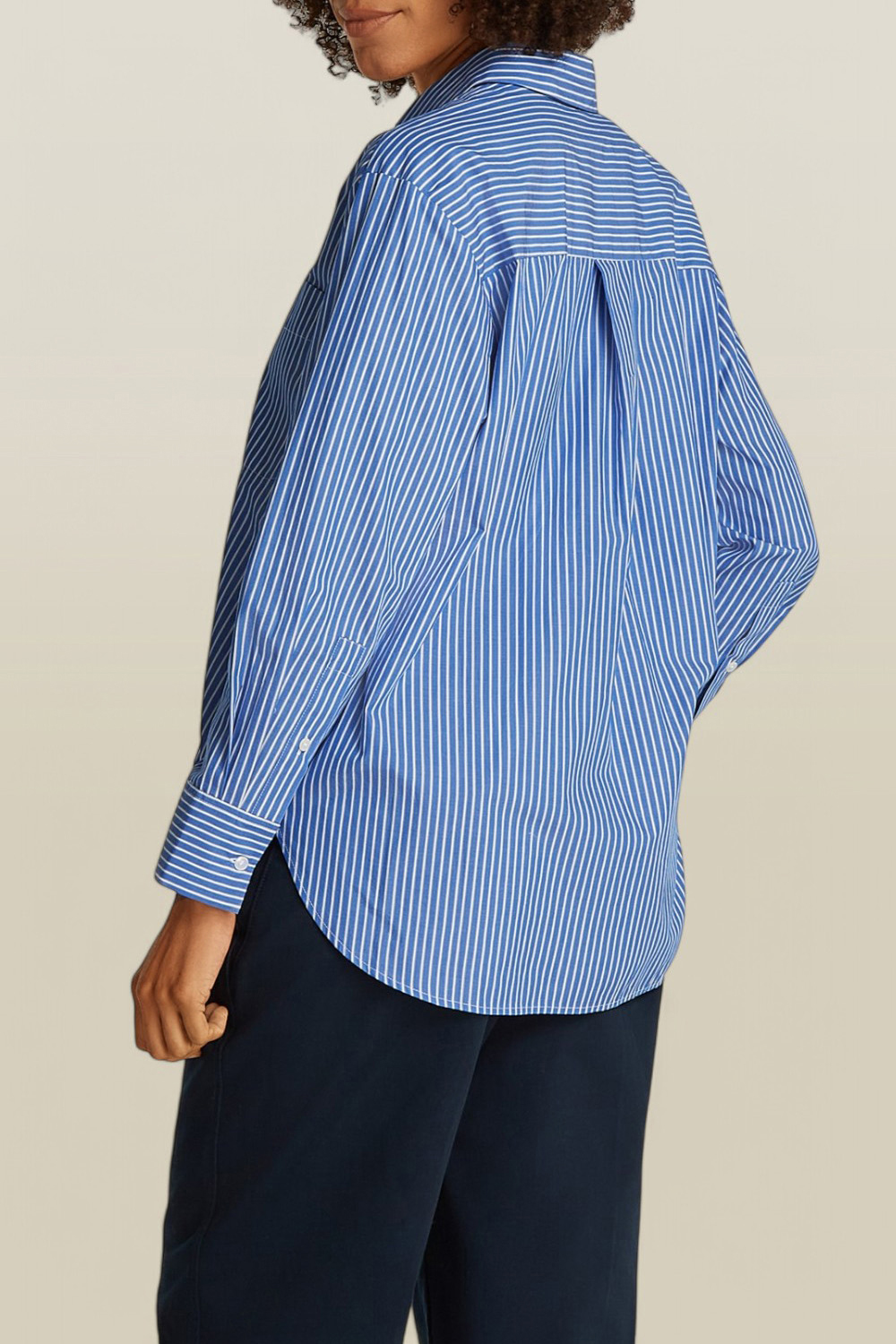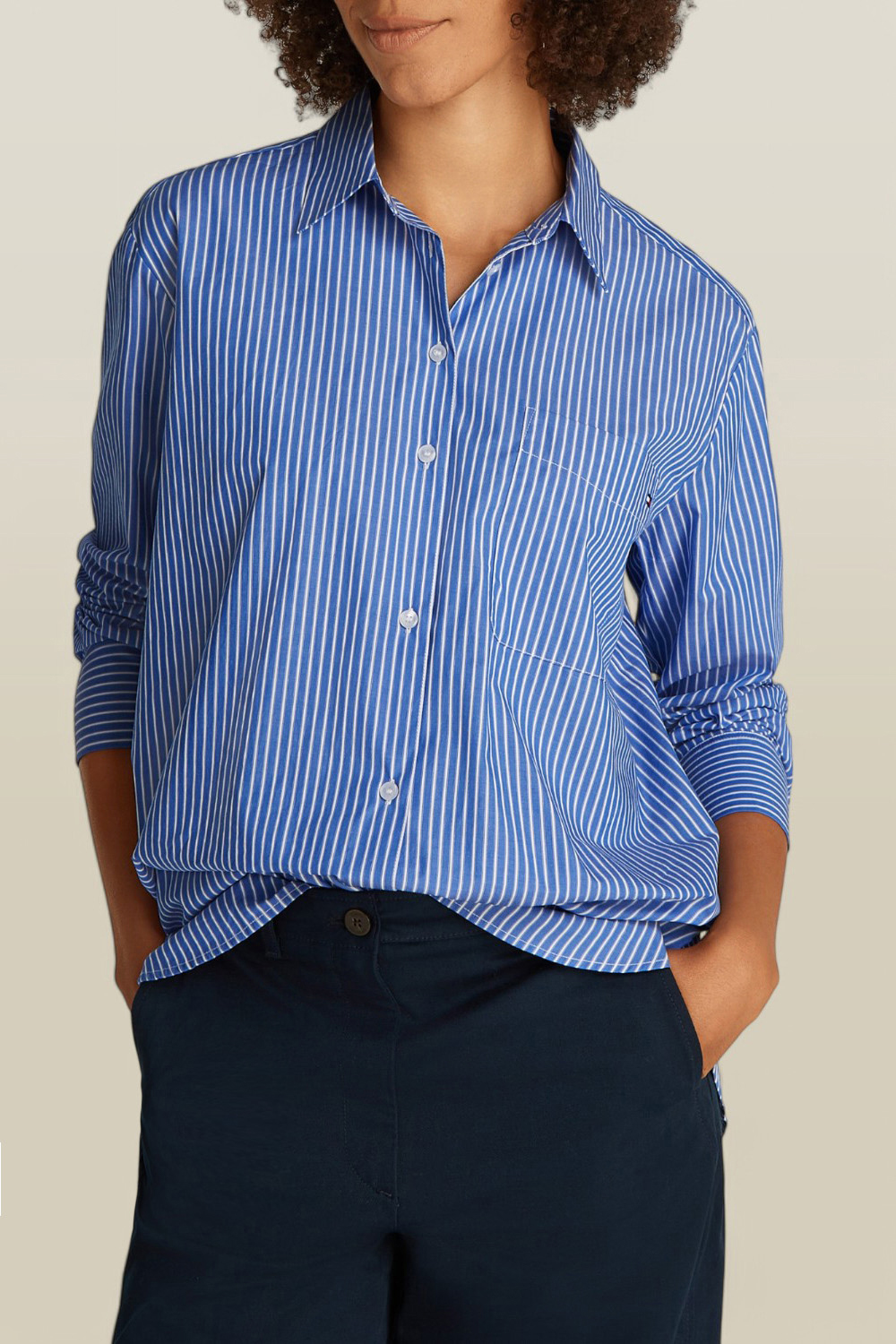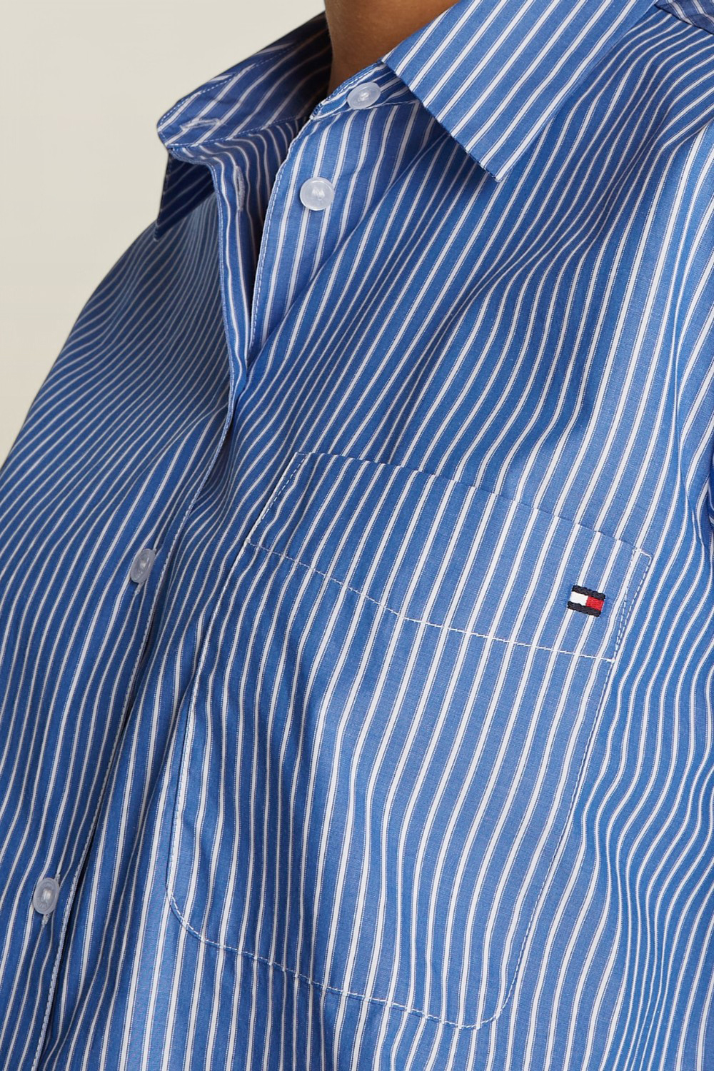 חולצה מכופתרת מבית Tommy Hilfiger, עשויה כותנה אורגנית בעיצוב פסים בצבעי כחול ולבן עם כיס חזה.