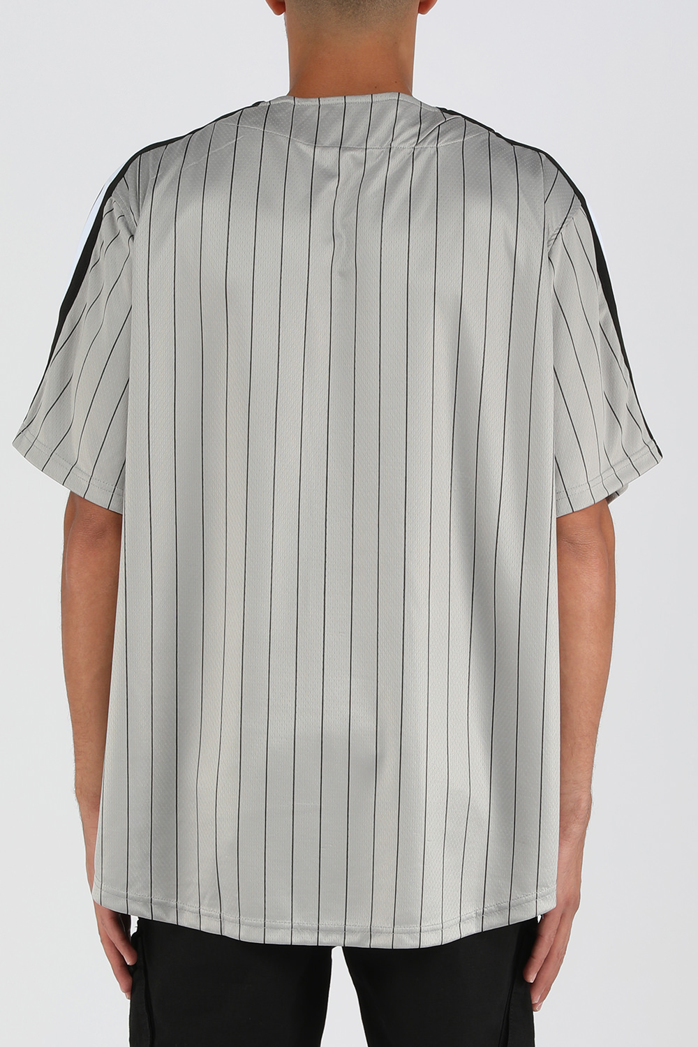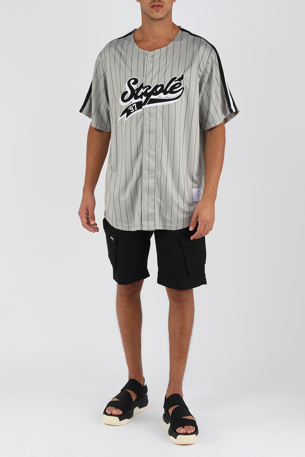 חולצה מבית STAPLE. זהו דגם העשוי טקסטיל משובח עם הדפס פסים בסגנון בייסבול כאשר על החזית מתנוסס שם המותג. לפריט גזרה ישרה עם סגירה מכופתרת ושרוולים קצרים.
