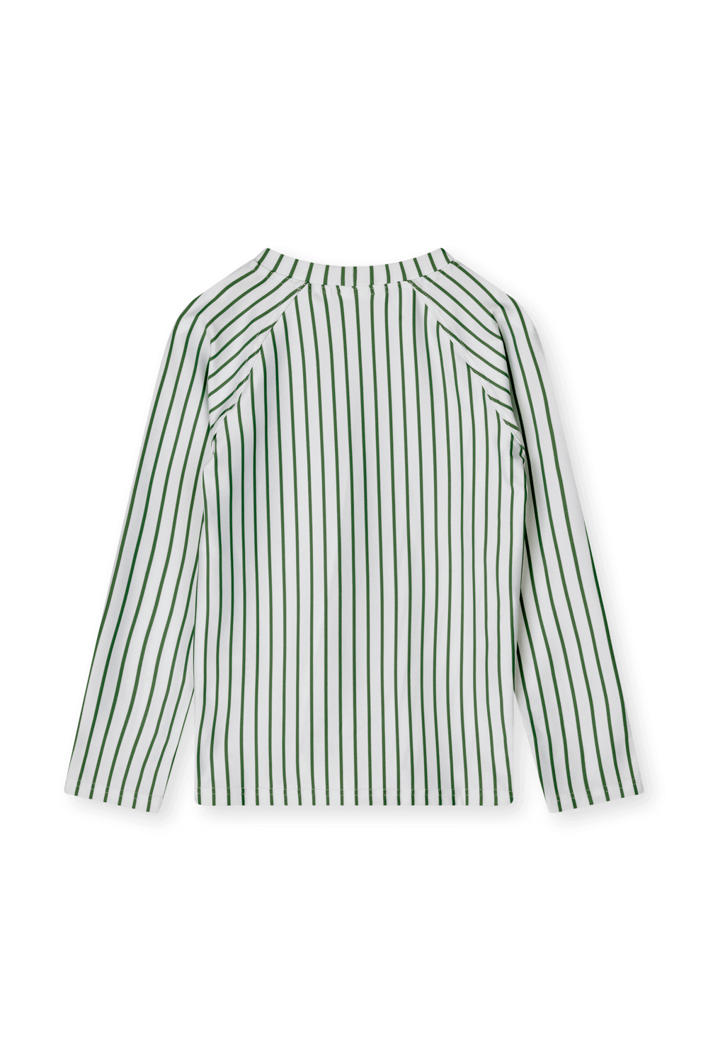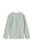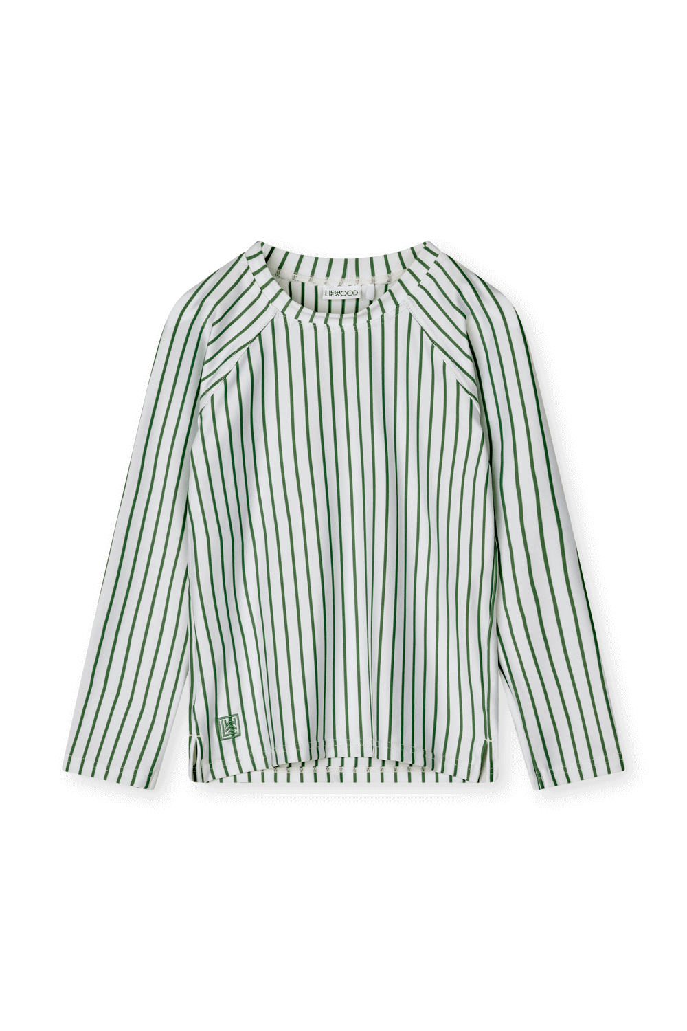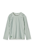 חולצת בגד ים מבית המותג הדני-צרפתי Liewood . דגם העשווי מטקסטיל איכותי וסטרצ'י המתייבש במהירות בדוגמת פסים בצבעי תכלת ולבן הכולל עיטור מלמלה באזור הכתפיים, בשילוב לוגו רקום ותפרים עדינים החותמים את סגנונו של הפריט.
