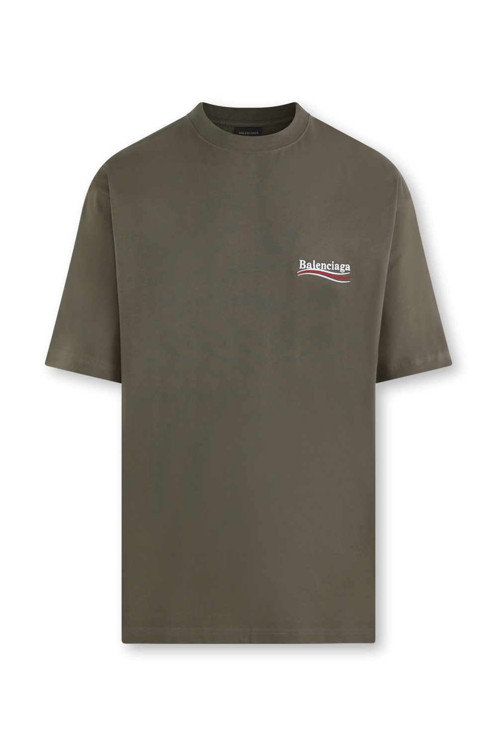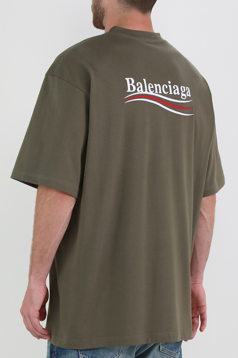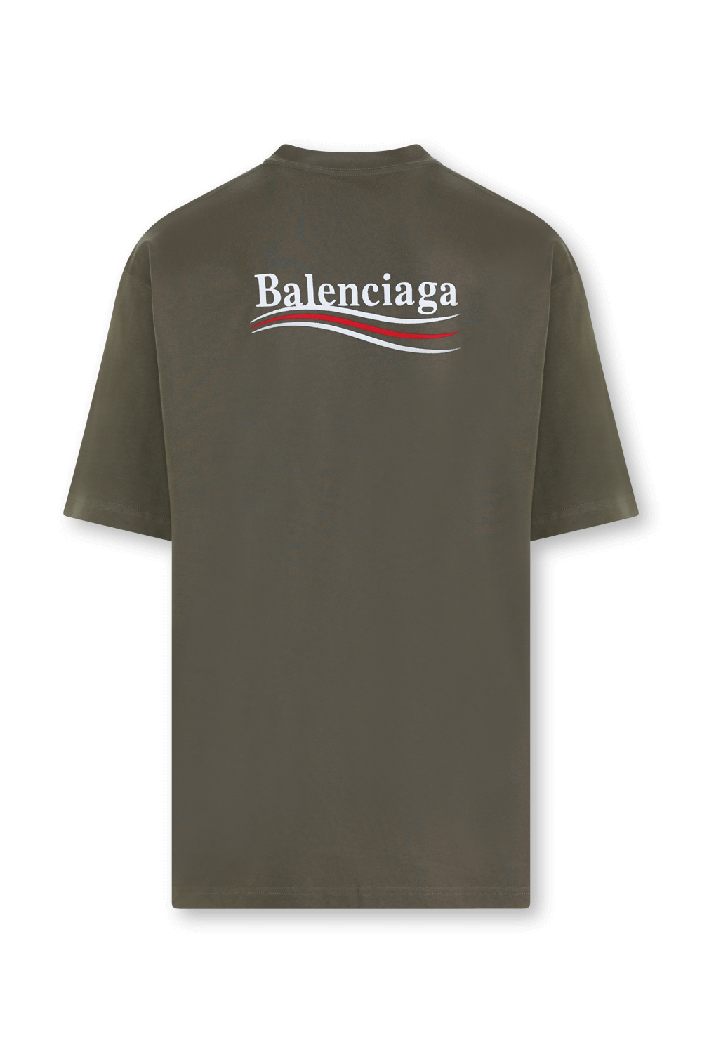 חולצת טי מבית האופנה הרותח Balenciaga, העשויה כותנה איכותית בצבע חאקי. לפריט גזרת אוברסייז מגניבה ונינוחה, עם צווארון עגול ושרוולים קצרים. הדפס בסגנון קמפיין פוליטי של שם המותג מופיע על צד החזית ובגב.