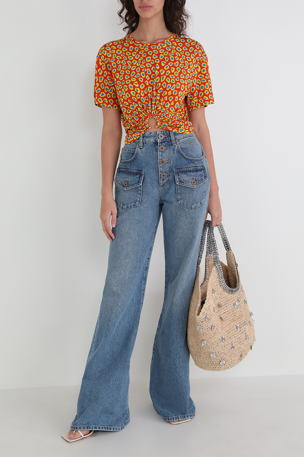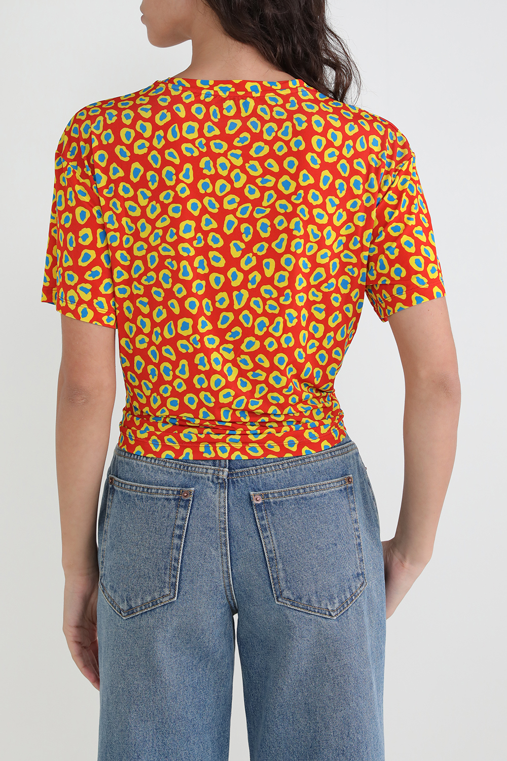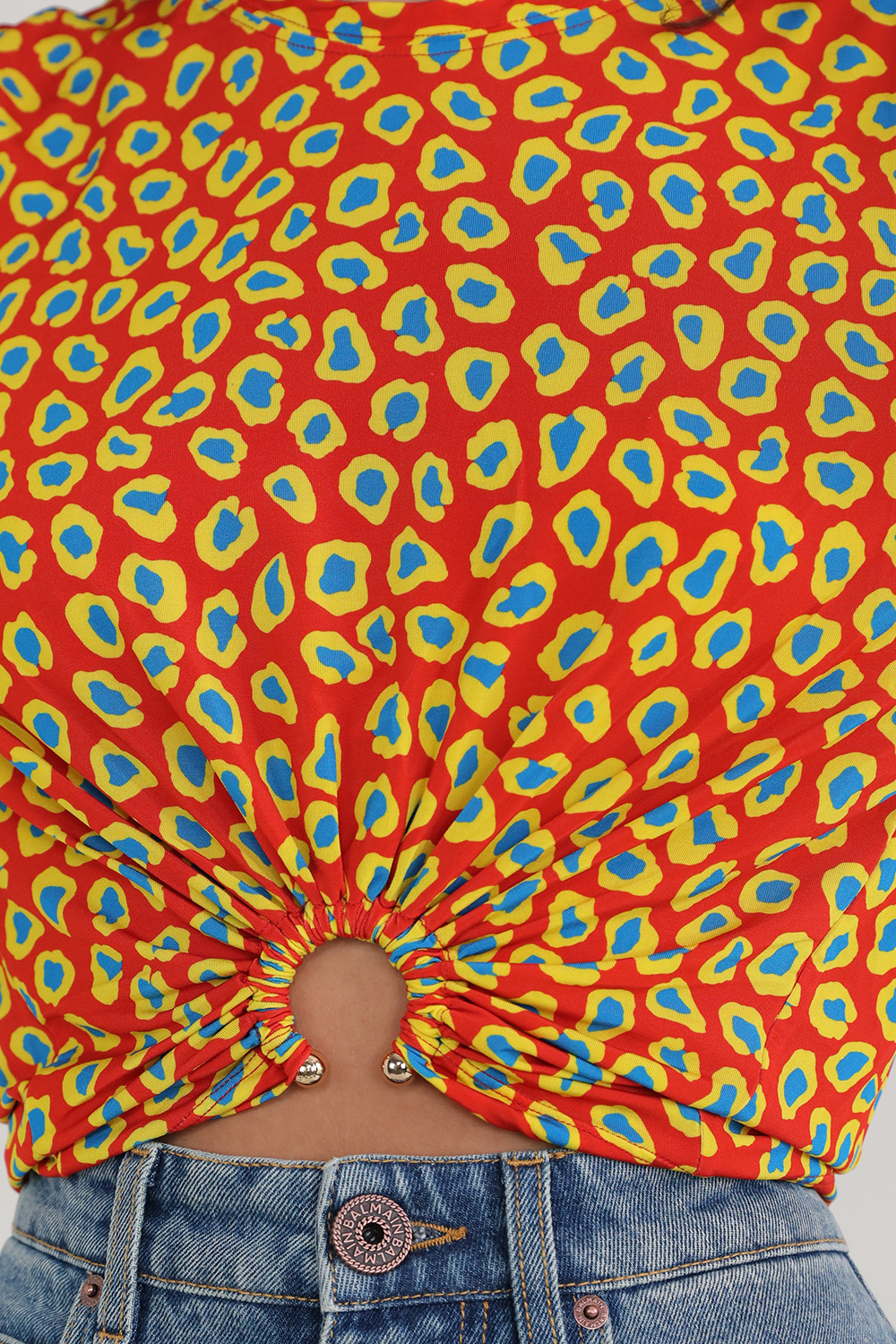 חולצת טי מבית Paco Rabanne, עשויה ויסקוזה ואלסטן בהדפס מנומר בצבעים כחול, אדום וצהוב עם כיווץ בחזית סביב טבעת מטאלית.