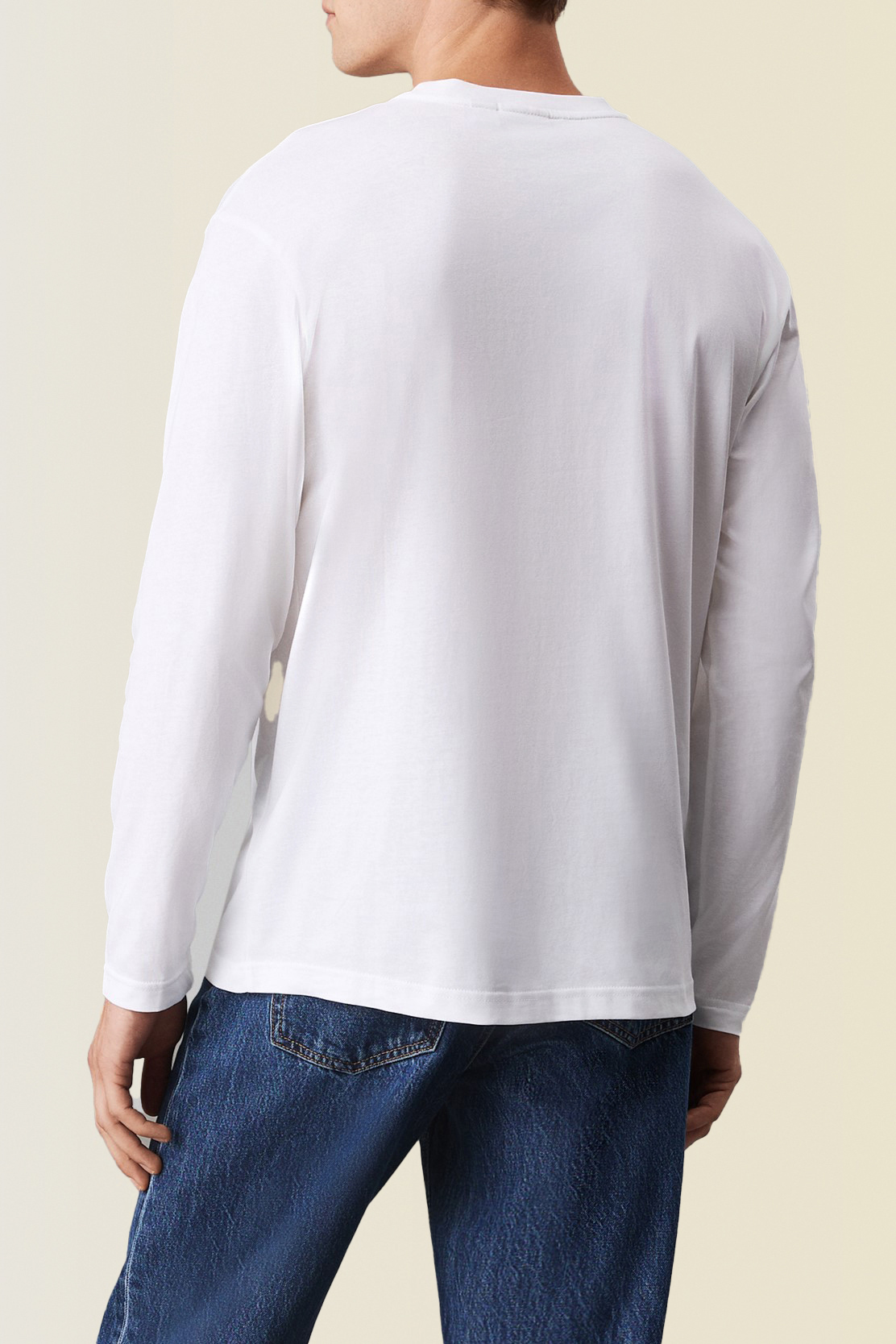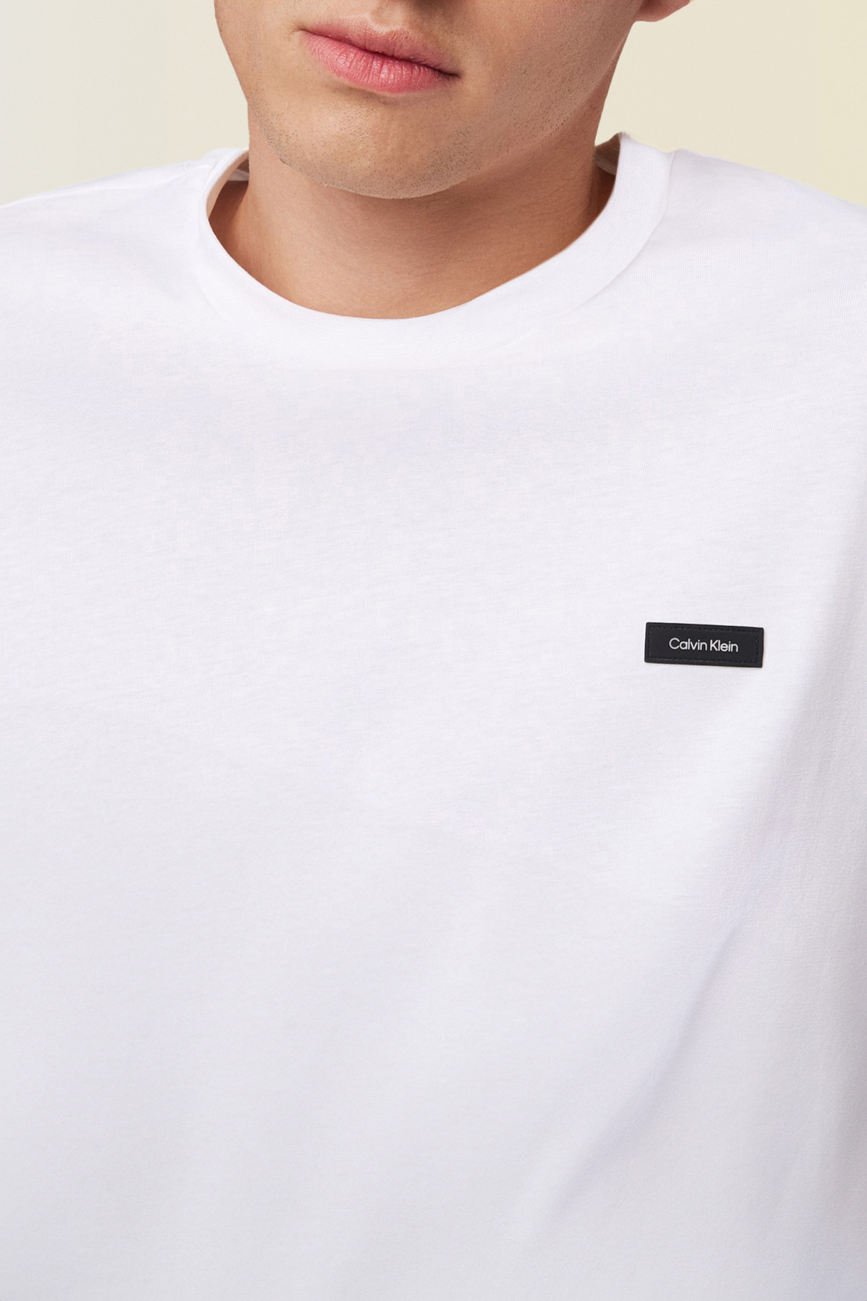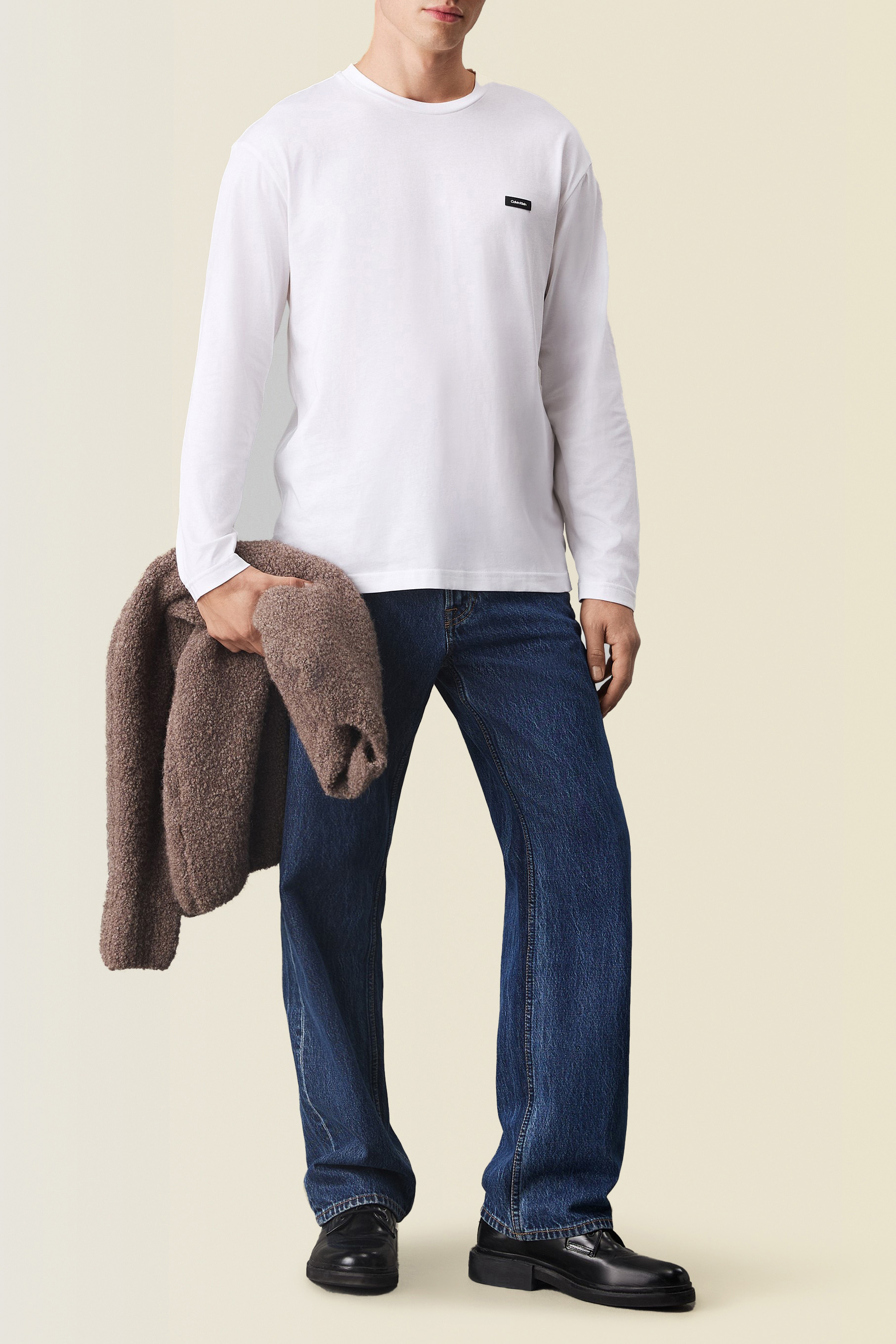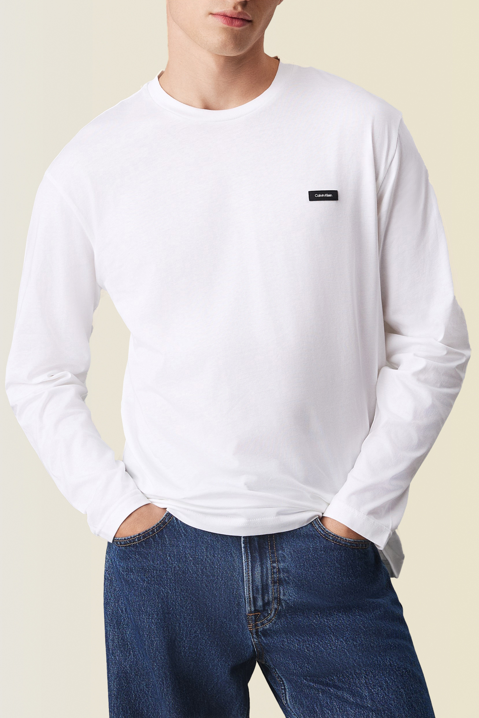 חולצת טי ארוכה מבית Calvin Klein, עשויה כותנה מחודשת בצבע לבן בשילוב צווארון מעוגל עם פאץ' לוגו המותג בצד החזה.
