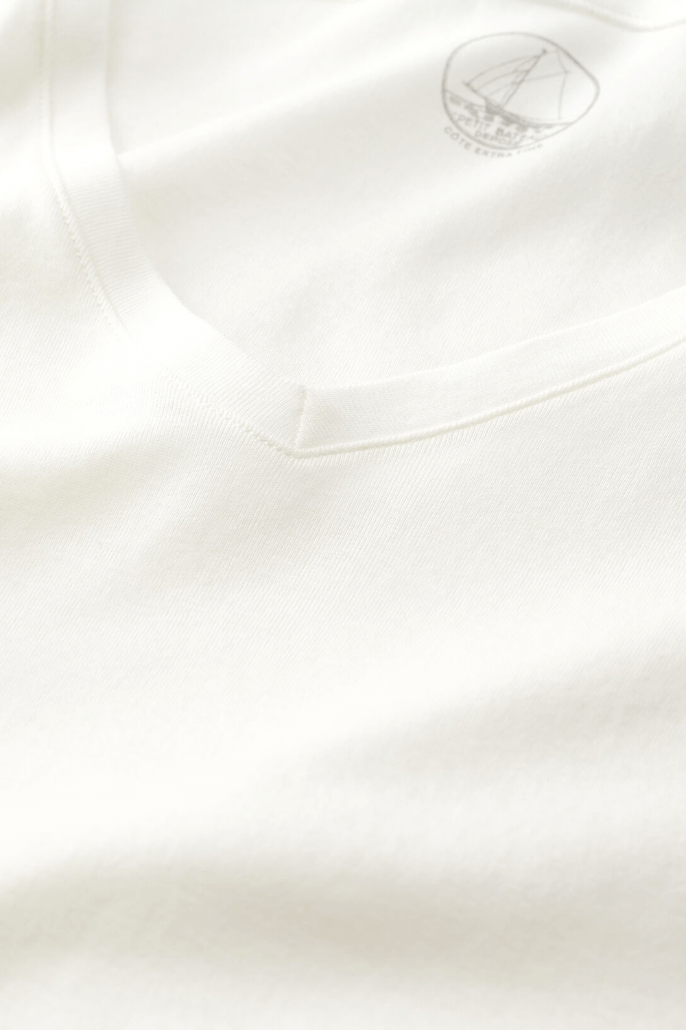 המותג הצרפתי המשובח והשיקי הגיע סוף סוף לארץ עם קולקציה חדשה לילדים ולאמהות. המותג נודע בזכות עיצוב מלא מחשבה הכולל הקפדה על לבישה קלה ונוחה עמידה בכביסות מסביב לשעון ושיק צרפתי נאיבי ועל זמני. זוהי חולצת טי העשויה 100% כותנה איכותית וסופר רכה בגוון לבן-מרשמלו. לדגם זה צללית נינוחה עם שרוולים קצרים ומחשוף וי. מדובר בפריט בייסיק משובח שילווה אותך במערכות לבוש רבות.