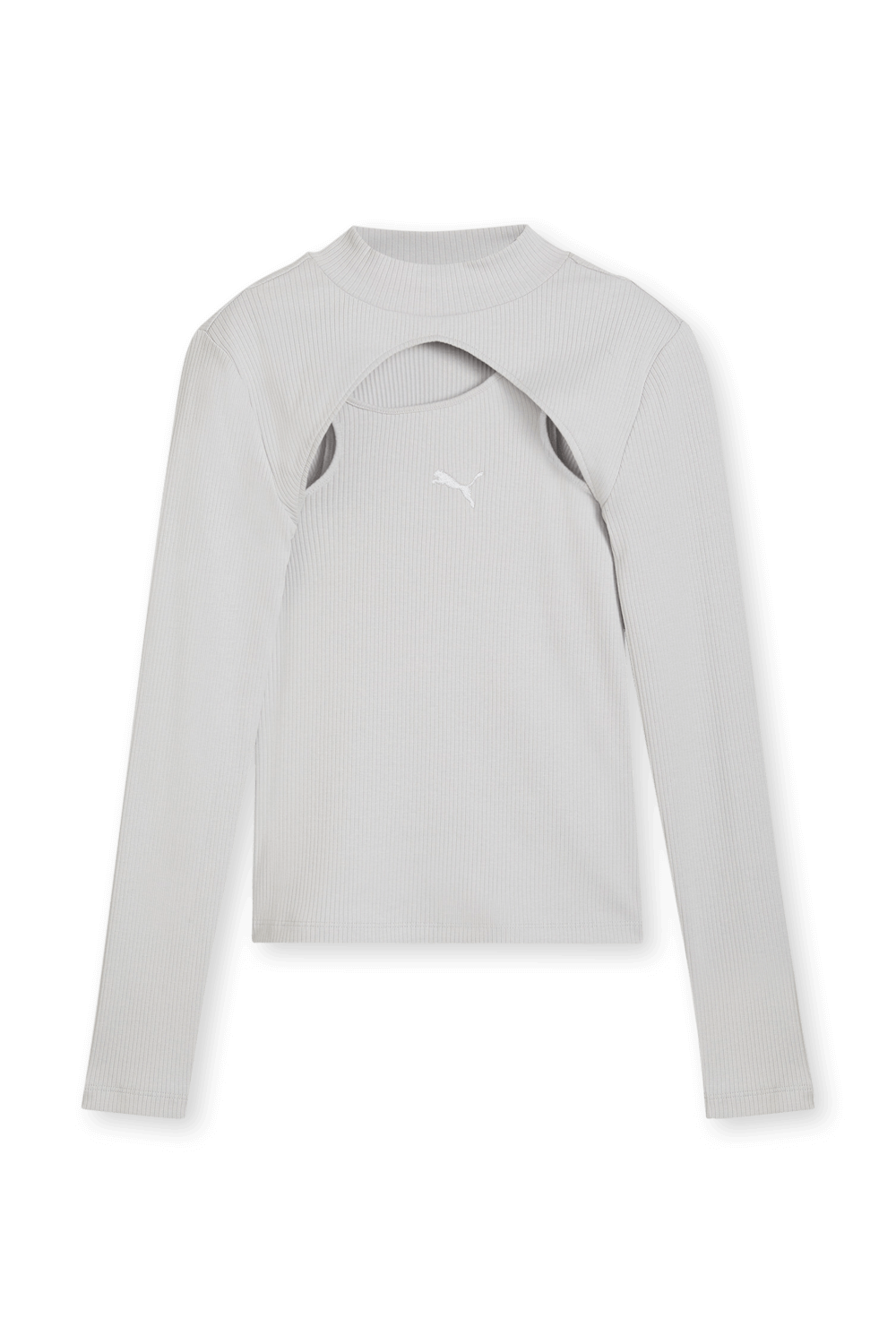 חולצת טי Dare To מבית Puma, עשויה תערובת כותנה ופוליאסטר ממוחזר בצבע אפור ובמראה שכבות של עליונית על גופיה.