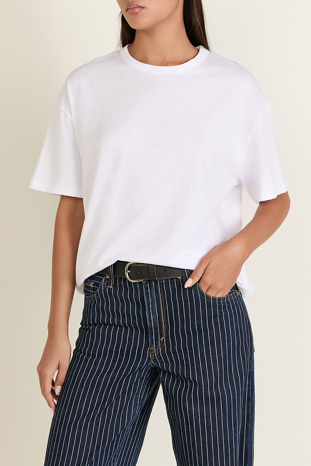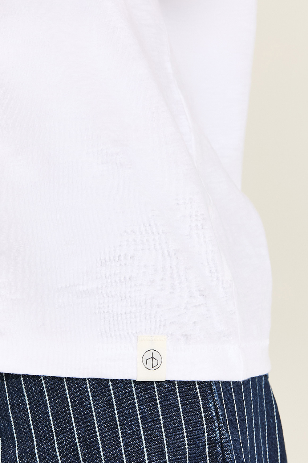 חולצת טי מבית Rag&Bone, עשויה כותנת פימה אורגנית בצבע לבן בשילוב צווארון מעוגל עם פאץ' קטן בסיומת.