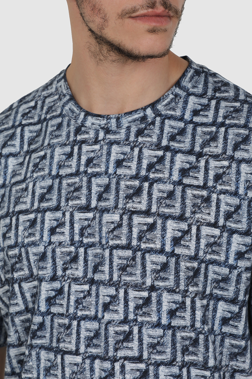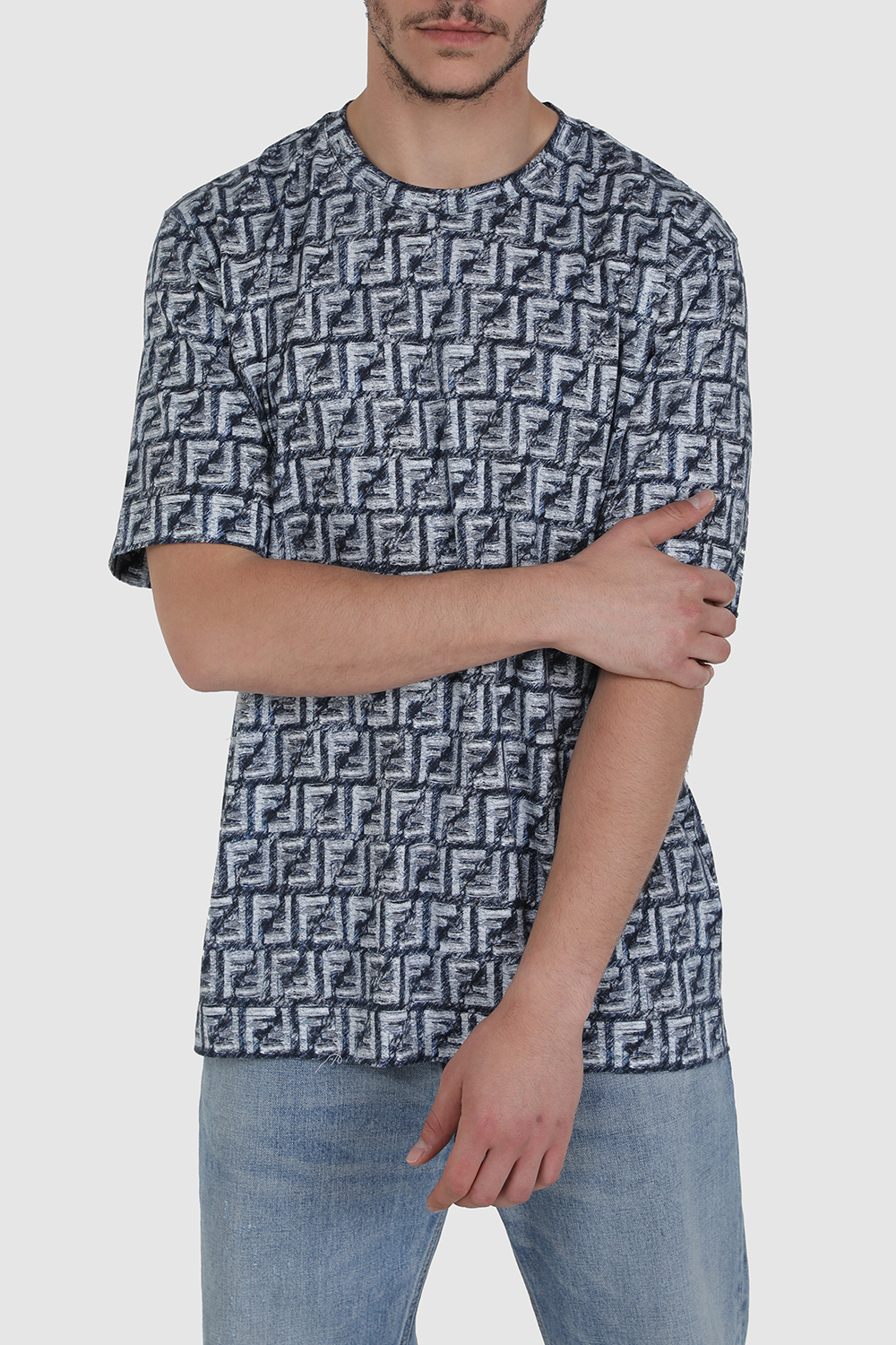 חולצת טי מבית Fendi, עשויה כותנה בצבע כחול עם צווארון מעוגל ובעיצוב לוגו חזרתי בצבע לבן במראה קרעים על דנים. ניתן לשלב את החולצה עם מכנסיים תואמים ליצירת חליפה ייחודית.