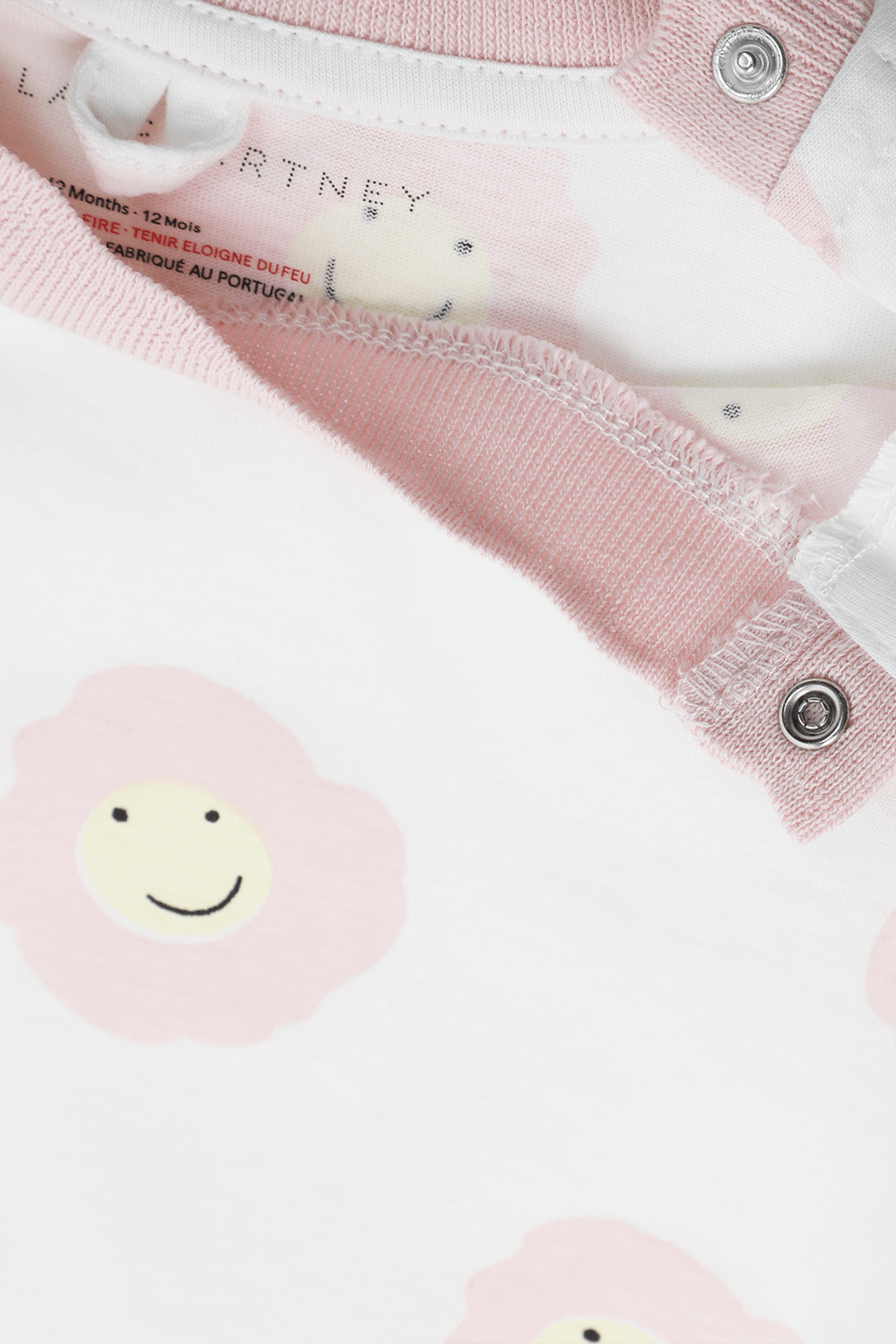 חולצת טי קצרה בעיצוב בית האופנה Stella McCartney העשויה כותנה בצבע לבן עם הדפס פרחים סמיילי. לפריט אמרות ריב ורודות ושני כפתורי תיקתק בצדי הצווארון.