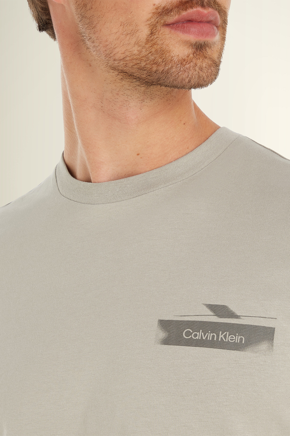 חולצת טי מבית Calvin Klein, עשויה כותנה ממוחזרת בצבע חאקי עם הדפס אחורי והטבעת סיליקון של הלוגו.