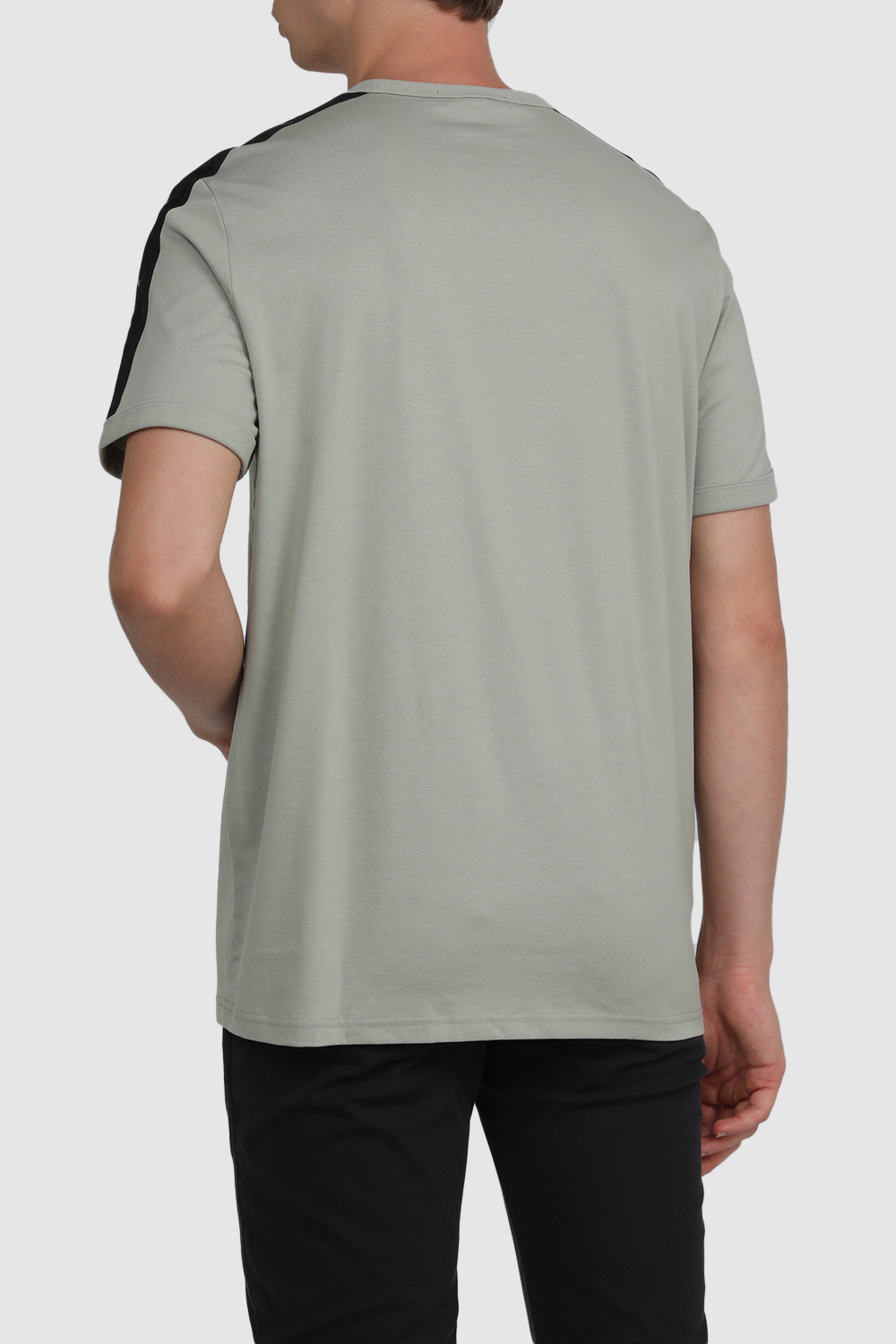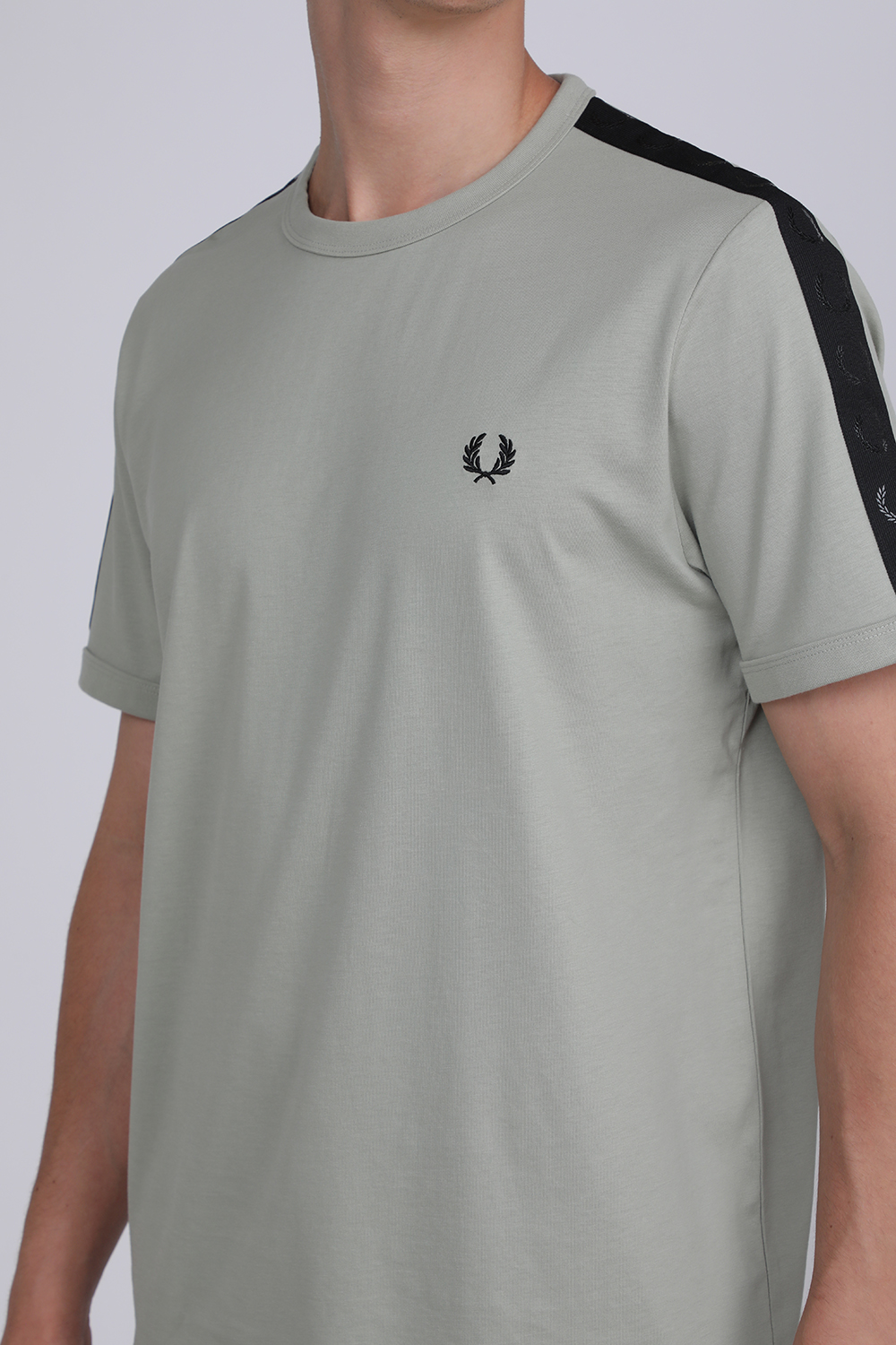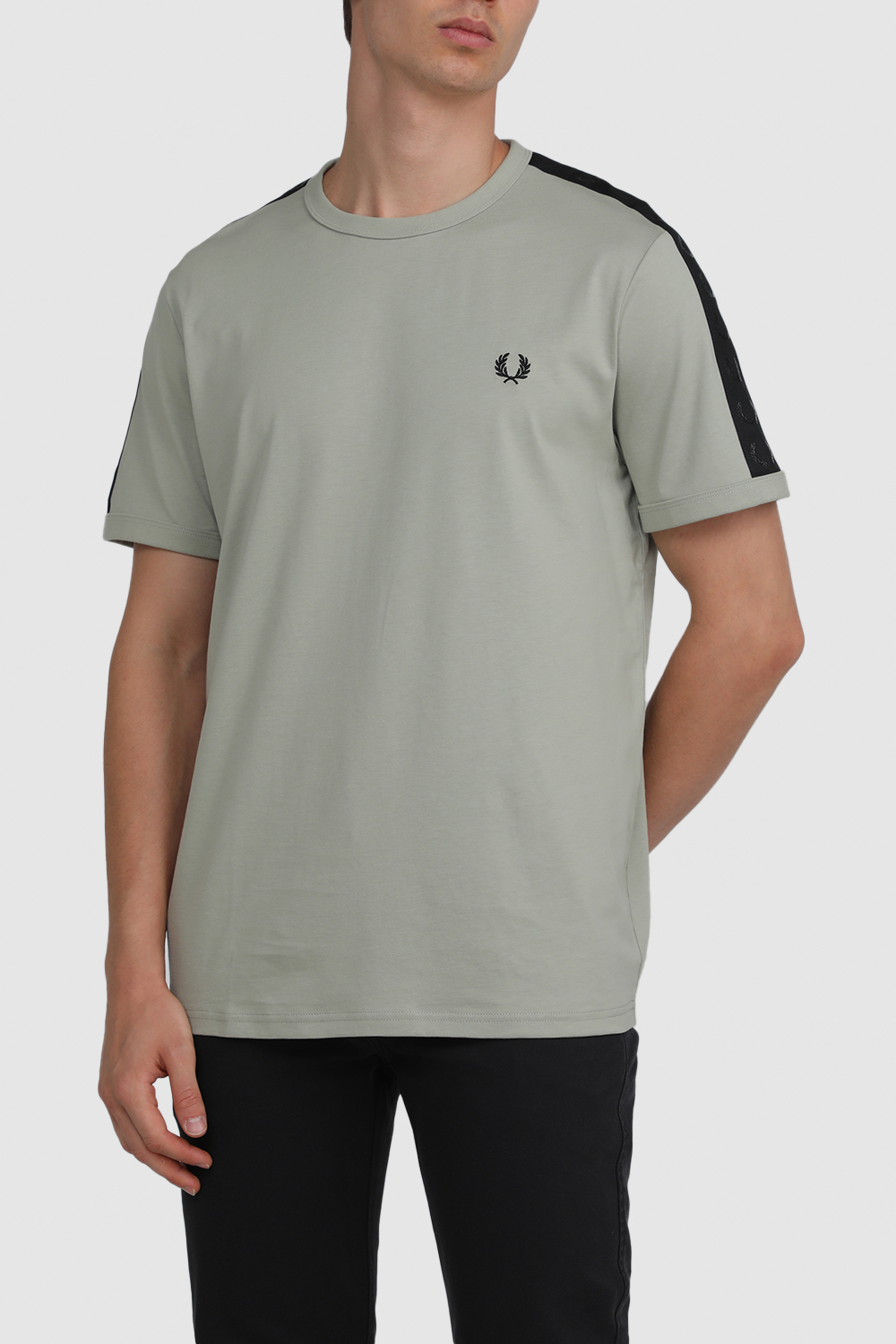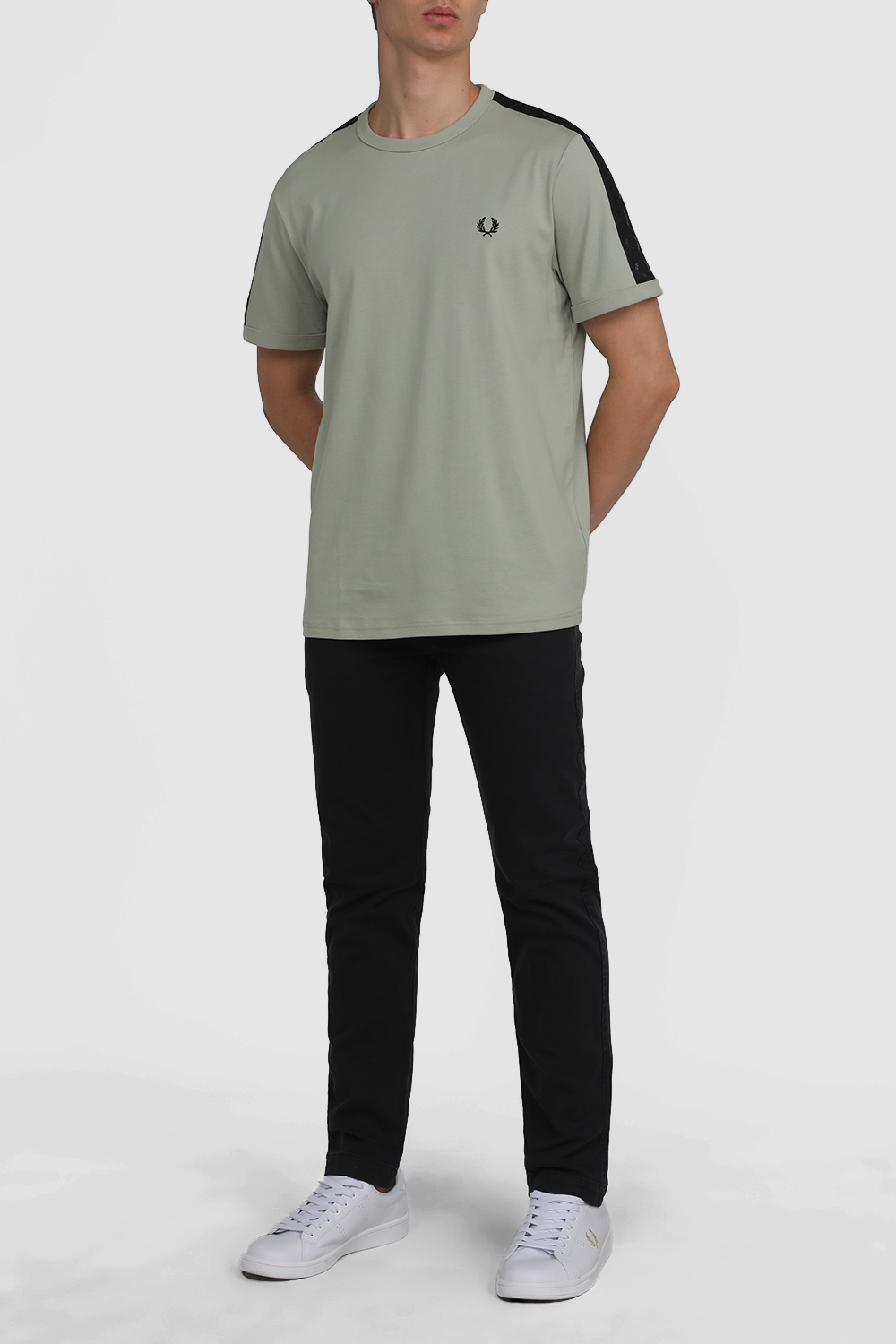 חולצת טי מבית Fred Perry, עשויה כותנה בצבע ירוק פיסטוק עם לוגו סטריפ שחור על השרוולים.