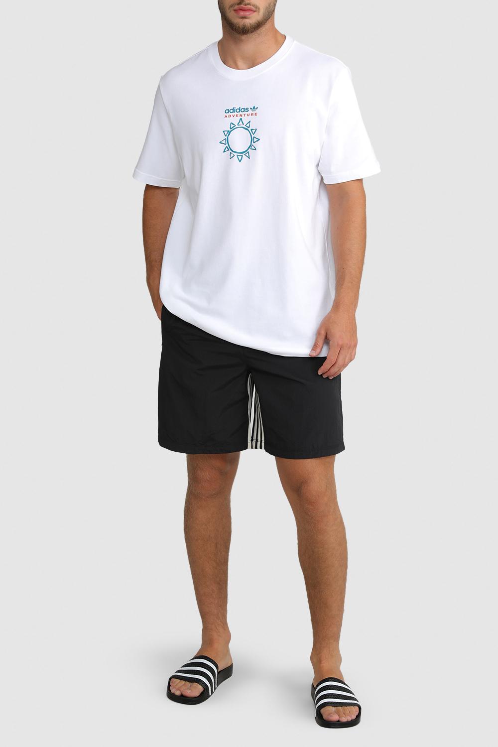 חולצת טי עם צווארון מעוגל מבית Adidas, עשויה כותנה בצבע לבן עם הדפס לוגו ושמש בחזית.