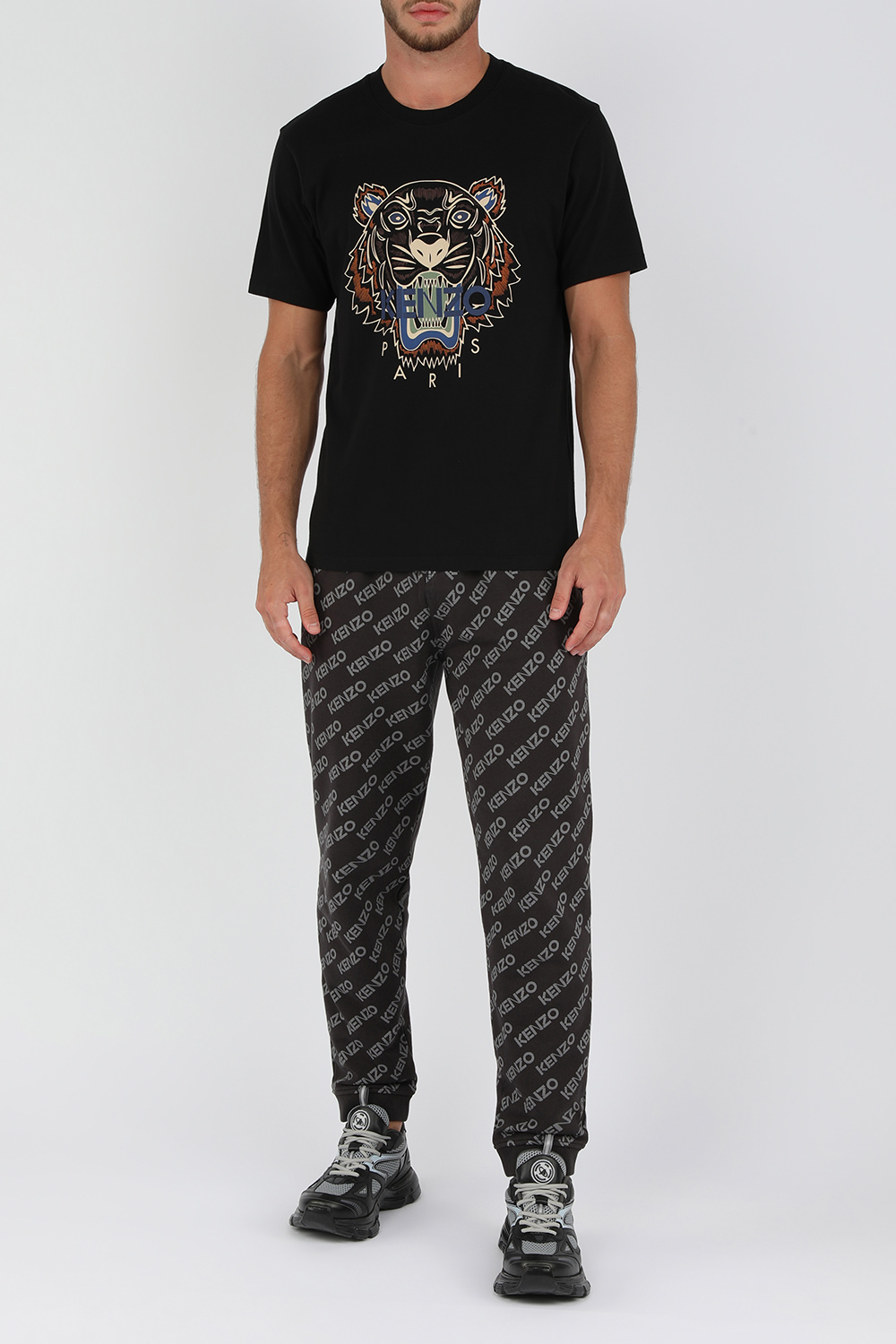 חולצת טי מבית KENZO. זהו דגם העשוי 100% כותנה איכותית בצבע שחור עם הדפס של דמות הנמר המזוהה עם המותג פלוס הלוגו מעל. לפריט גזרה ישרה ונינוחה עם צווארון מעוגל ושרוולים קצרים.