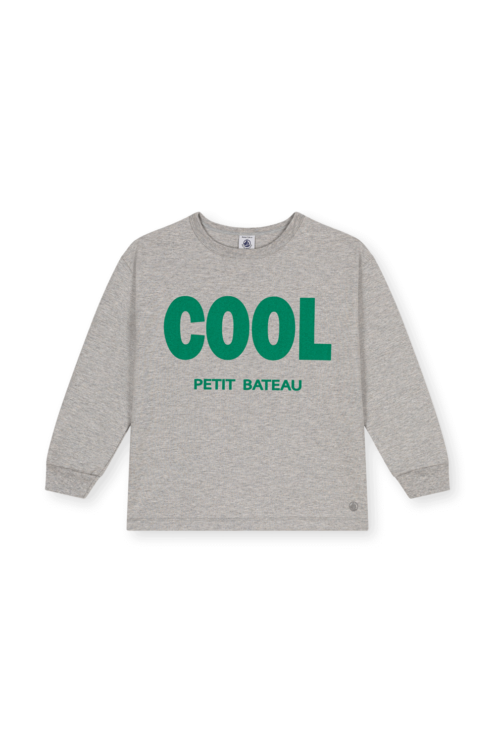 חולצת טי קצרה בגזרה ישרה מבית Petit Bateau, עשויה כותנה אורגנית בצבע אפור עם הכיתוב COOL.