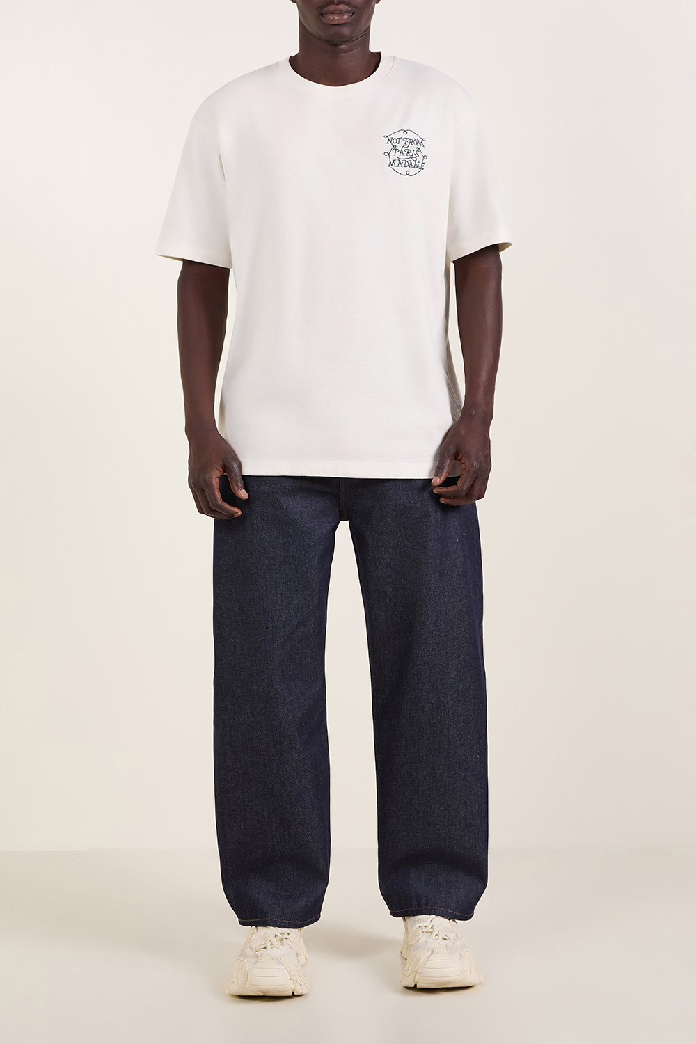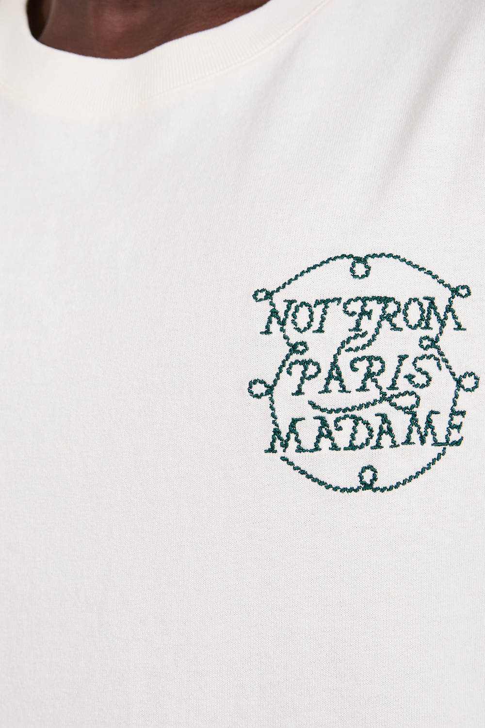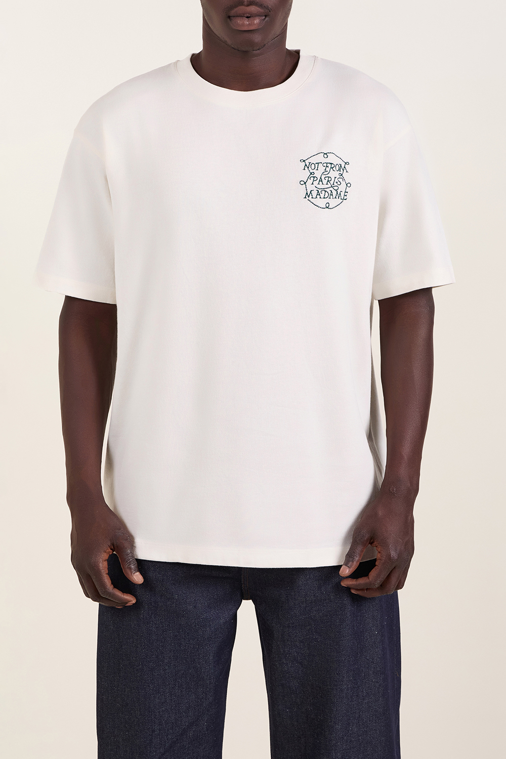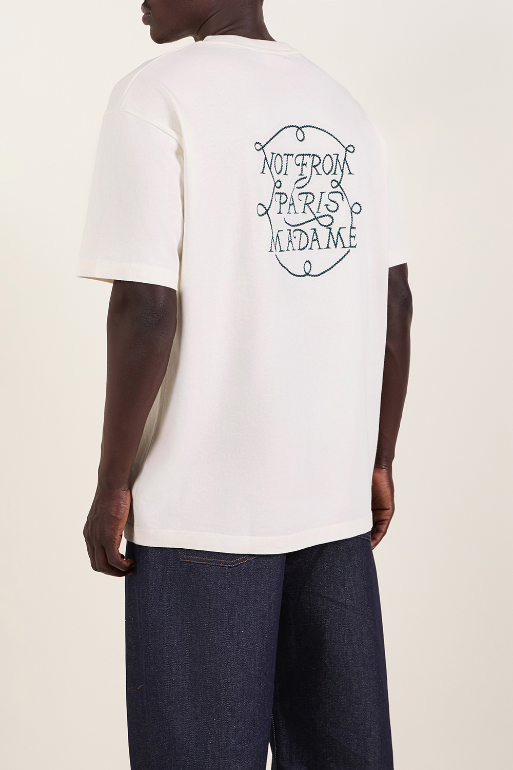 חולצת טי חולצת מבית Drole De Monsieur, עשויה כותנה בצבע קרם עם רקמת מוטו המותג Not from Paris Madame מלפנים ומאחור.
