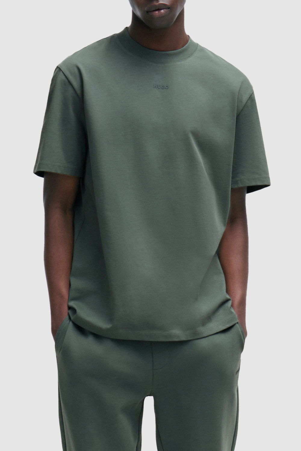 חולצת טי מבית Hugo, עשויה כותנת ג'רזי בצבע ירוק ובגזרת אוברסייז עם לוגו בחזית.