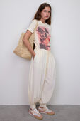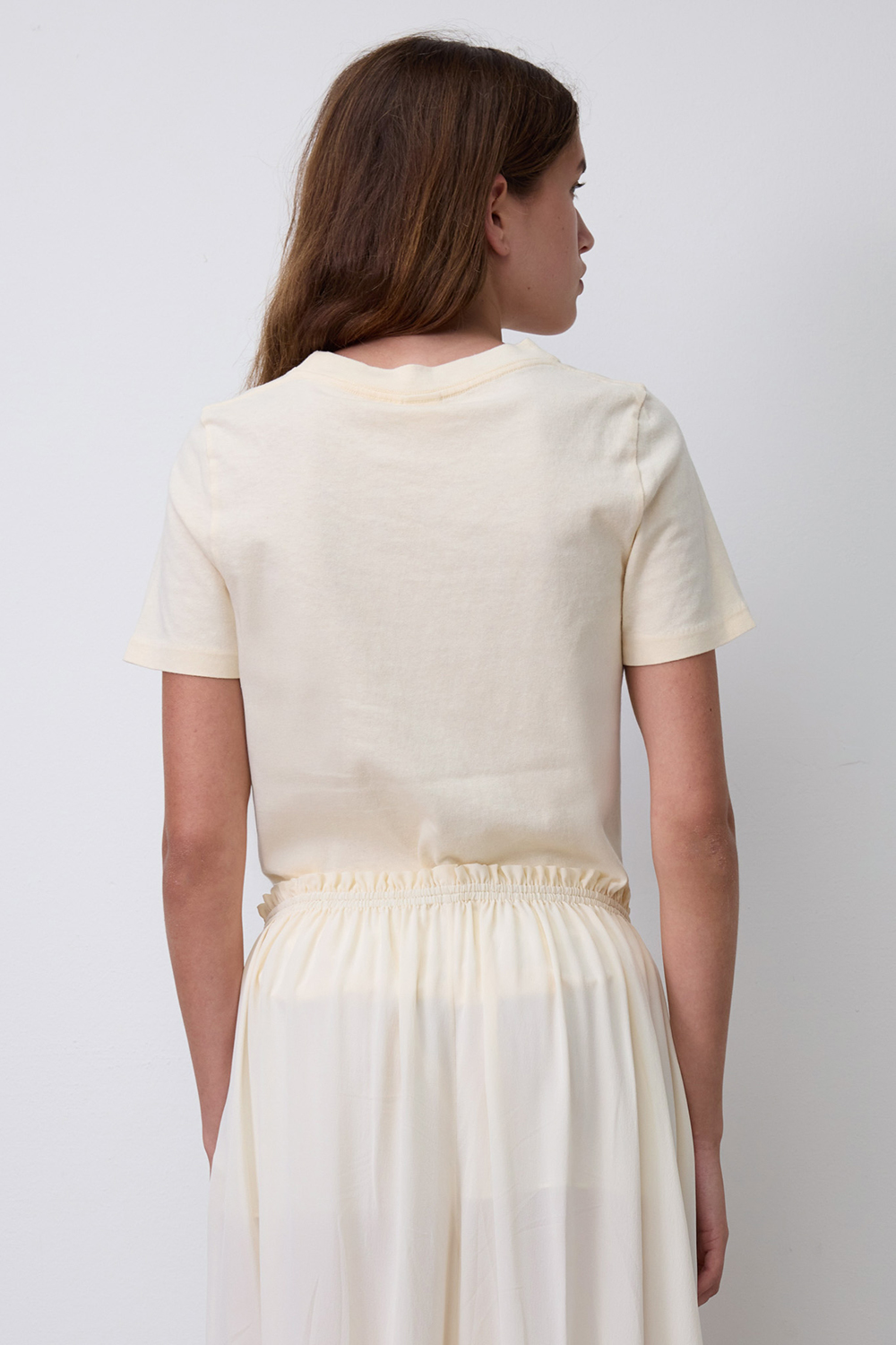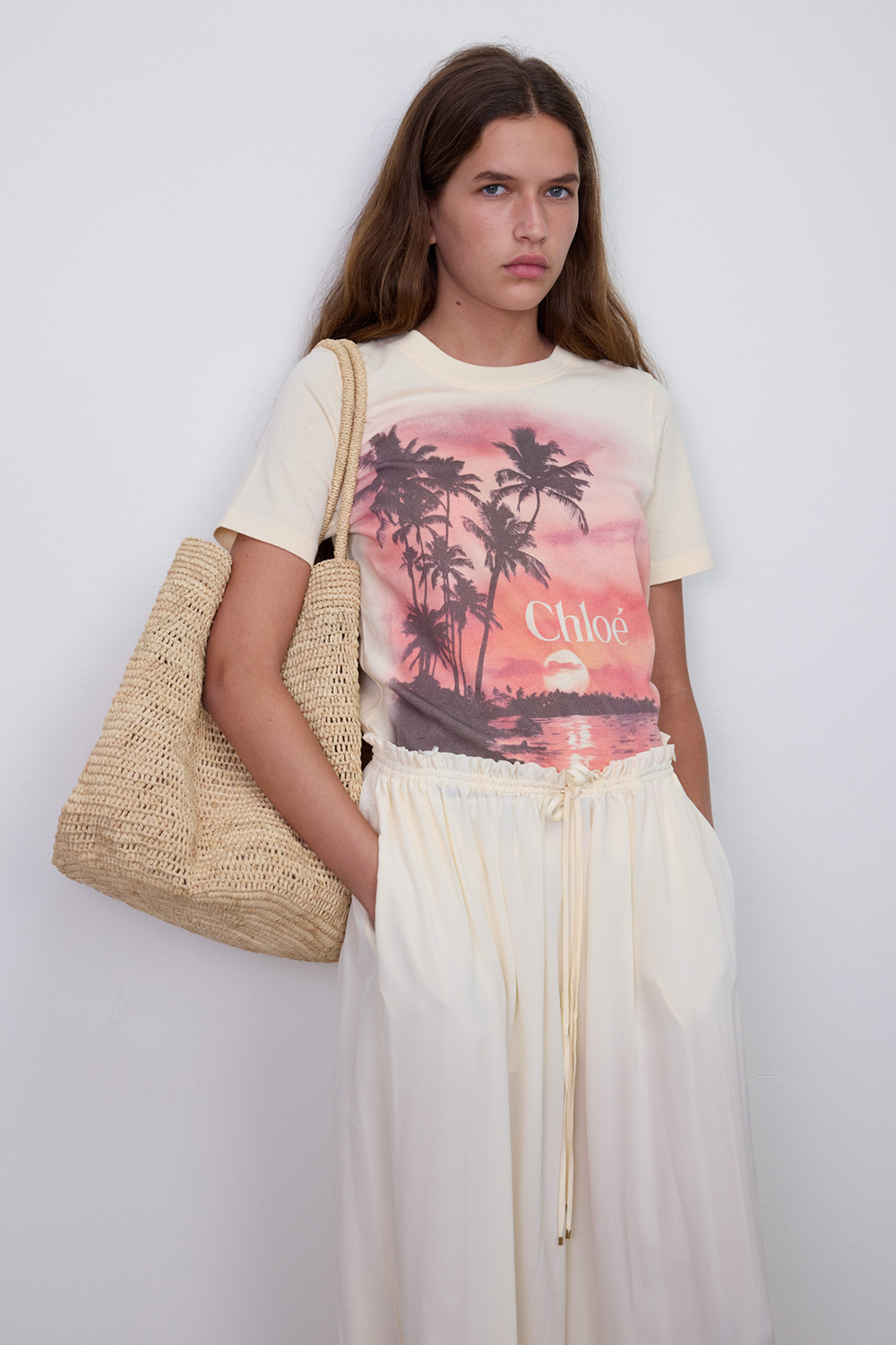 חולצת טי בגזרה צמודה מבית Chloe, עשויה ג'רזי כותנה אורגנית בצבע צהוב עדין בשילוב הדפס שקיעה ולוגו המותג.