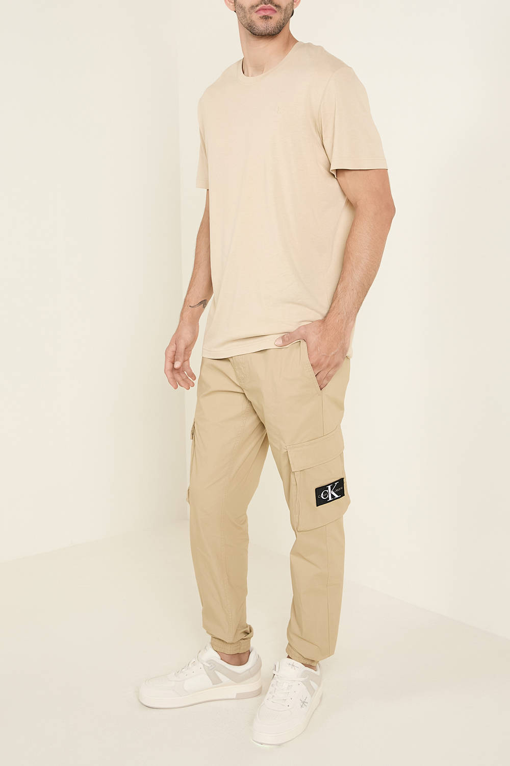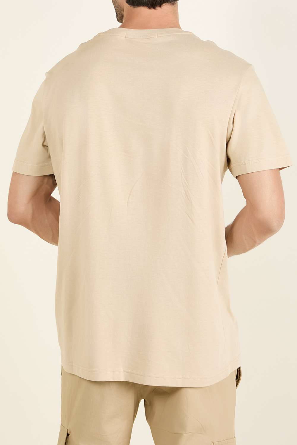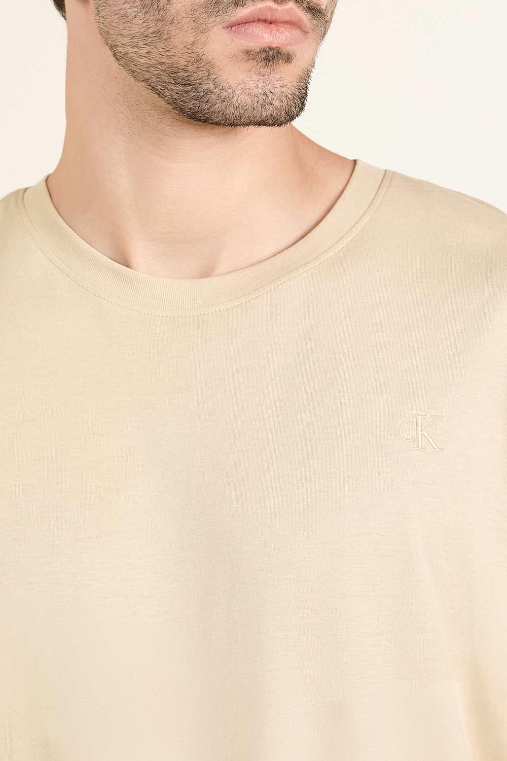 חולצת טי קלאסית ו-Must Have בכל ארון מבית Calvin Klein, עשויה תערובת כותנה מחודשת ומודאל בצבע בז' עם צווארון מעוגל, בשילוב רקמת לוגו המותג בצד החזה.