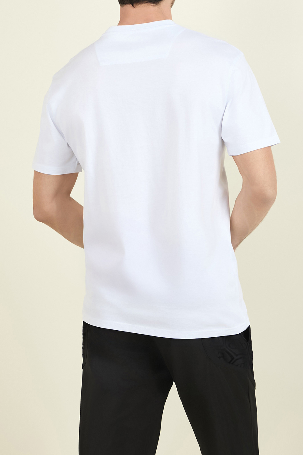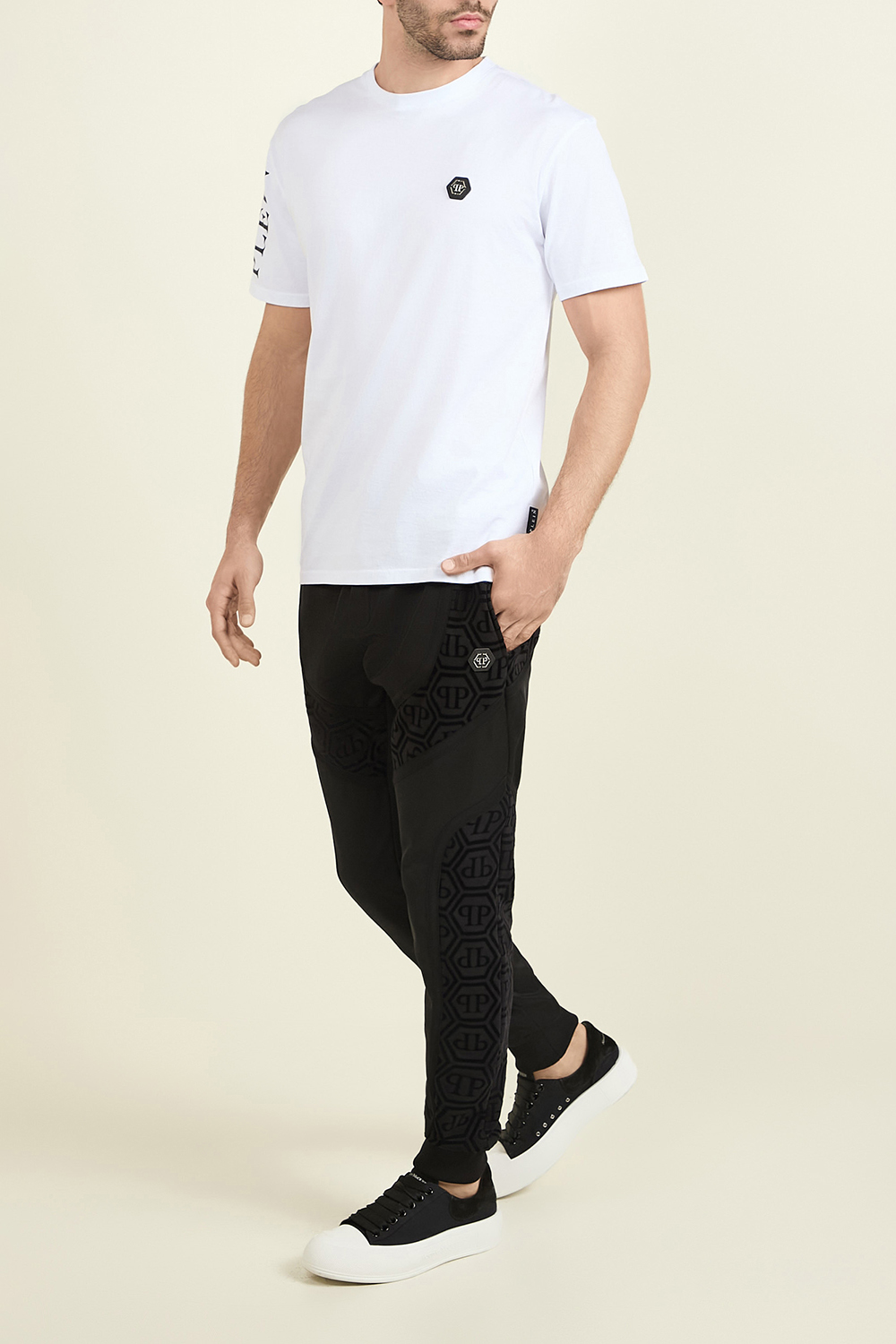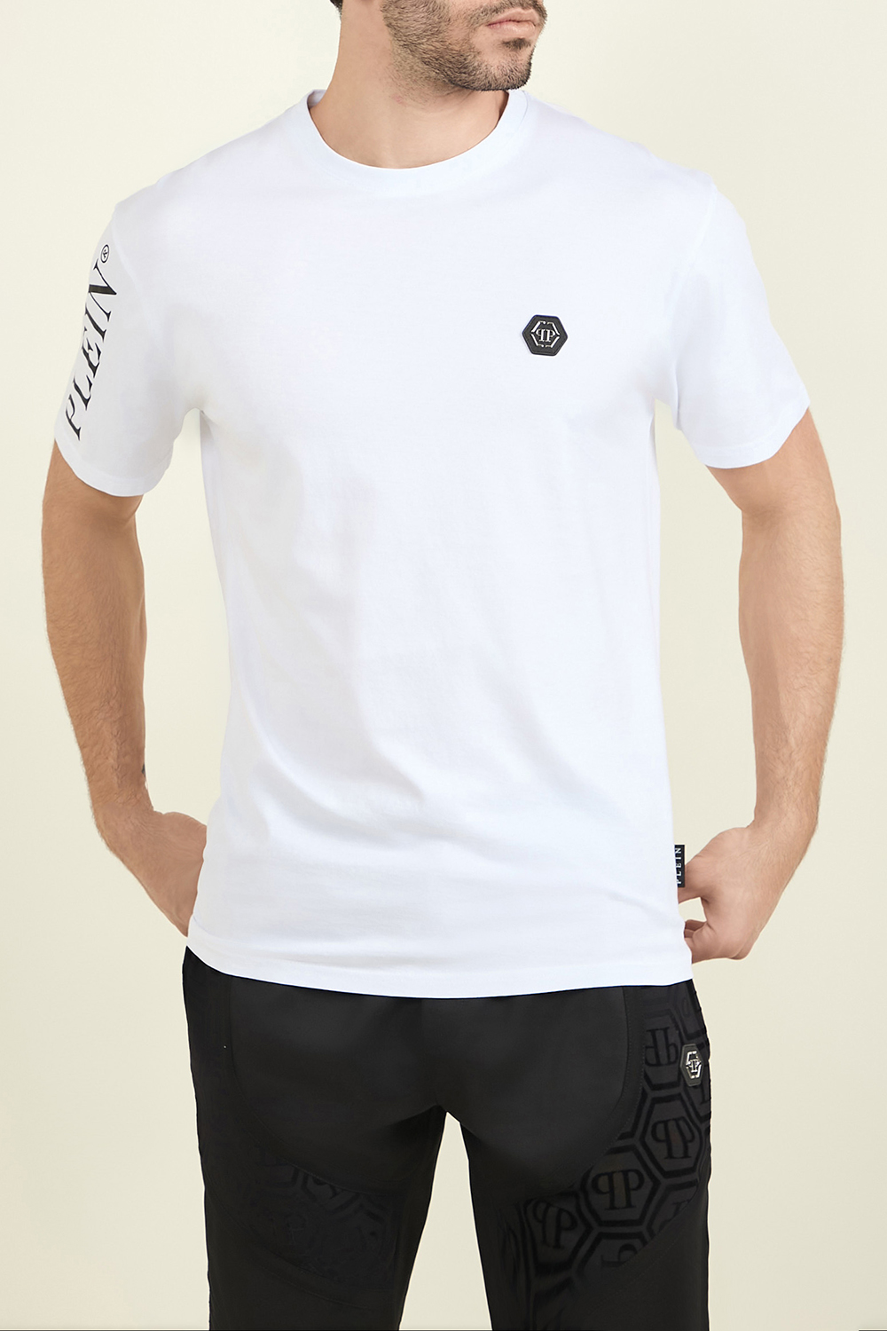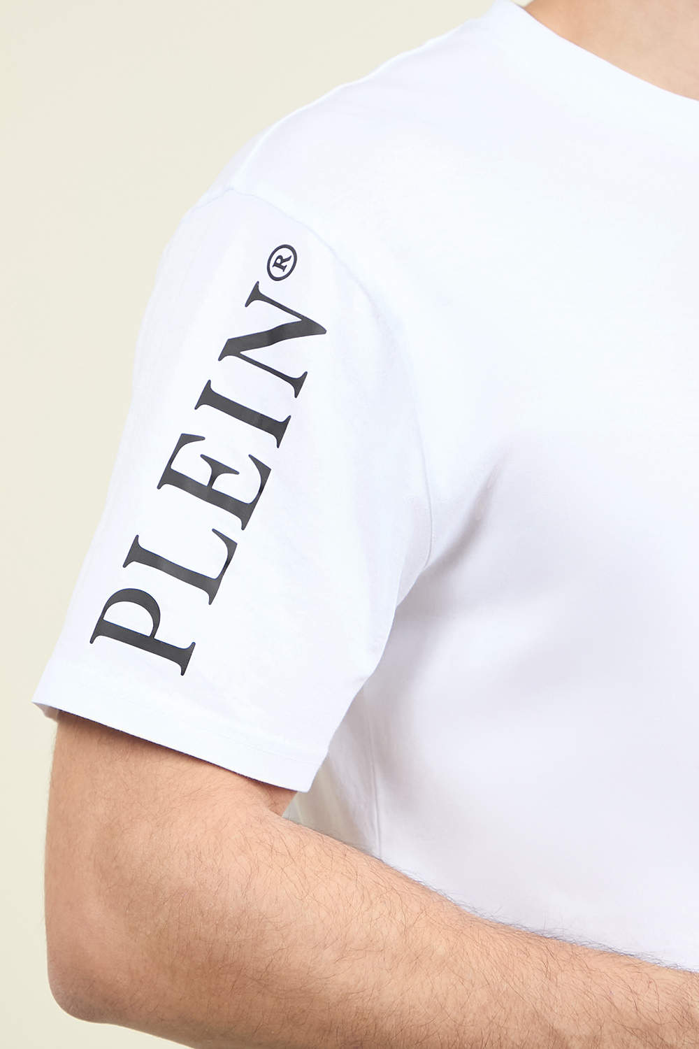 חולצת טי מבית Philipp Plein, עשויה כותנה בצבע לבן עם לוגו פאץ' מטאלי בחזה והדפס לוגו על השרוול.
