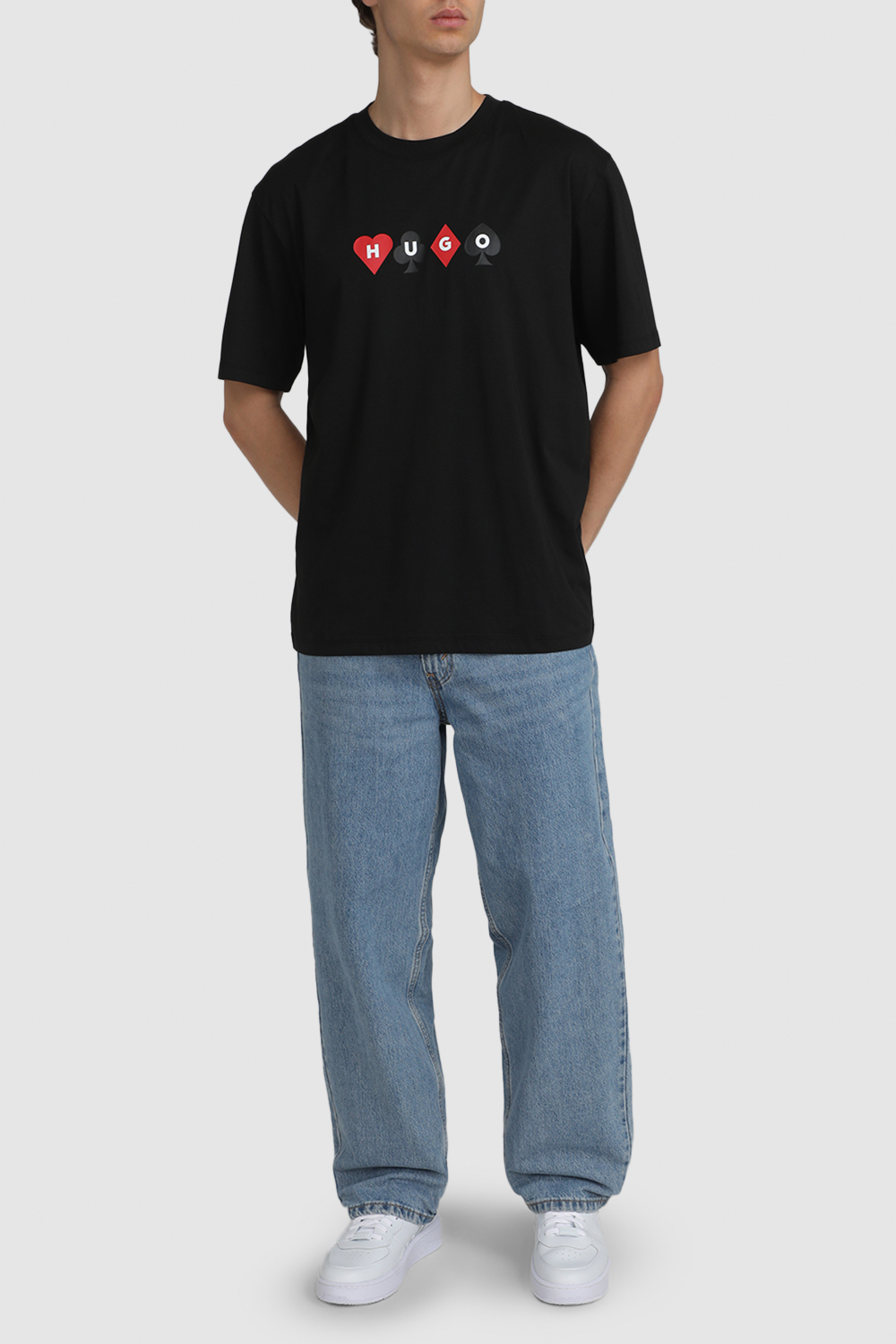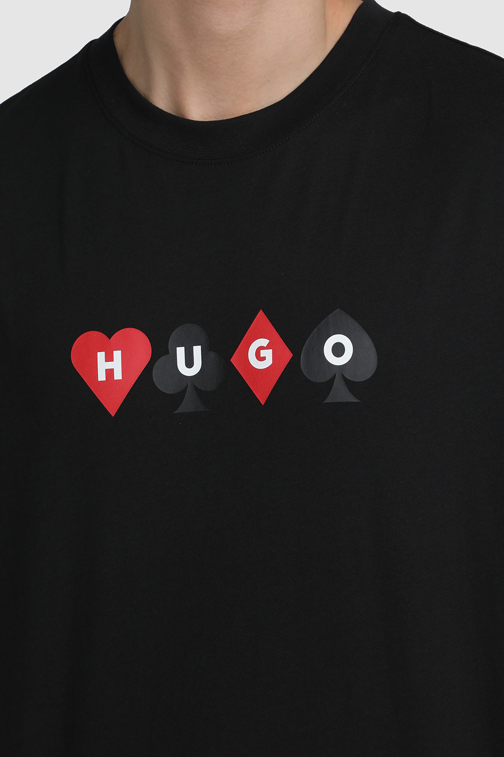 חולצת טי בגזרה נינוחה מבית Hugo, עשויה כותנה בצבע שחור עם צווארון מעוגל בשילוב הדפס משחק קלפים בחזית ובגב.