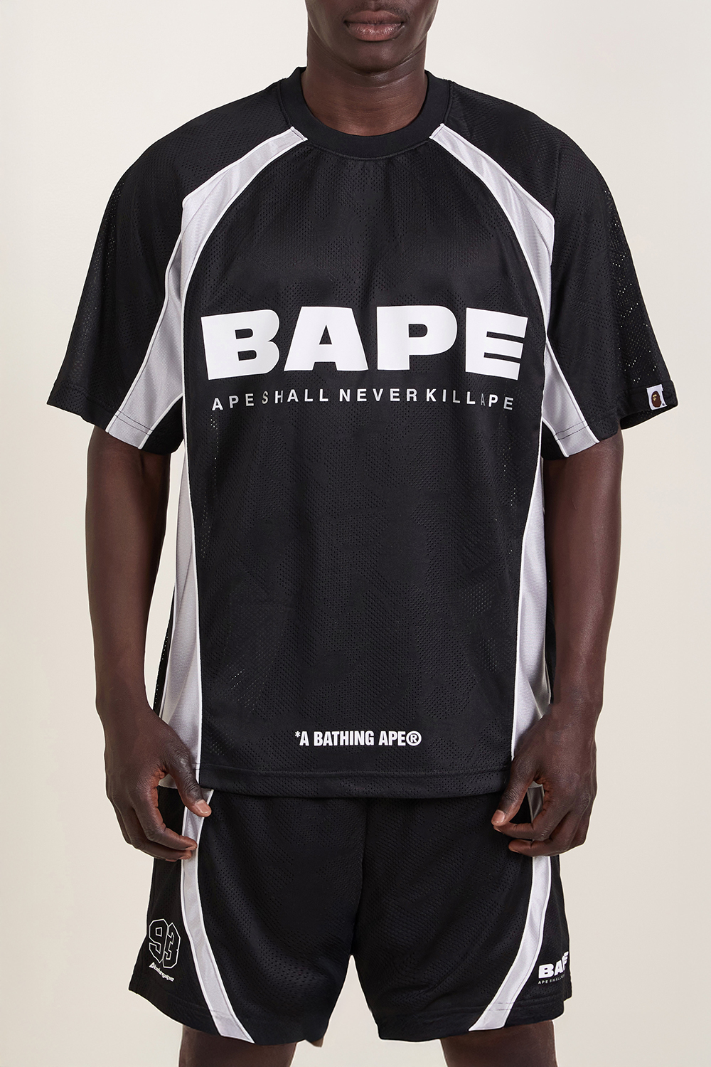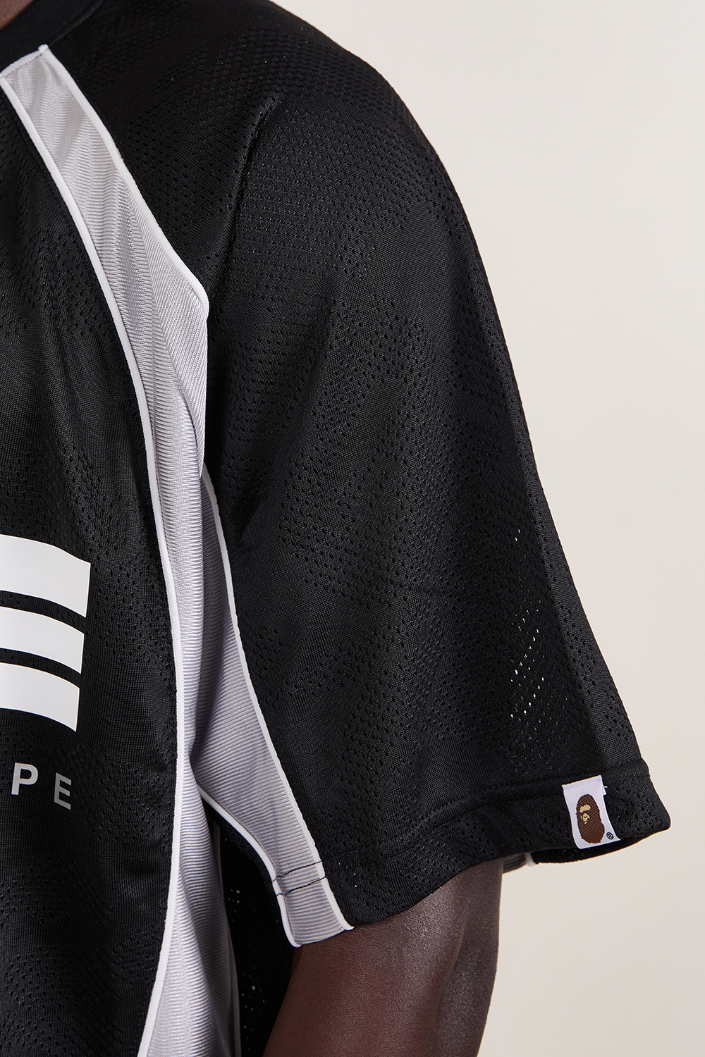 חולצת כדורגל מבית Bape, עשויה בד רשת בצבע שחור ופסי כסף עם הדפסים.