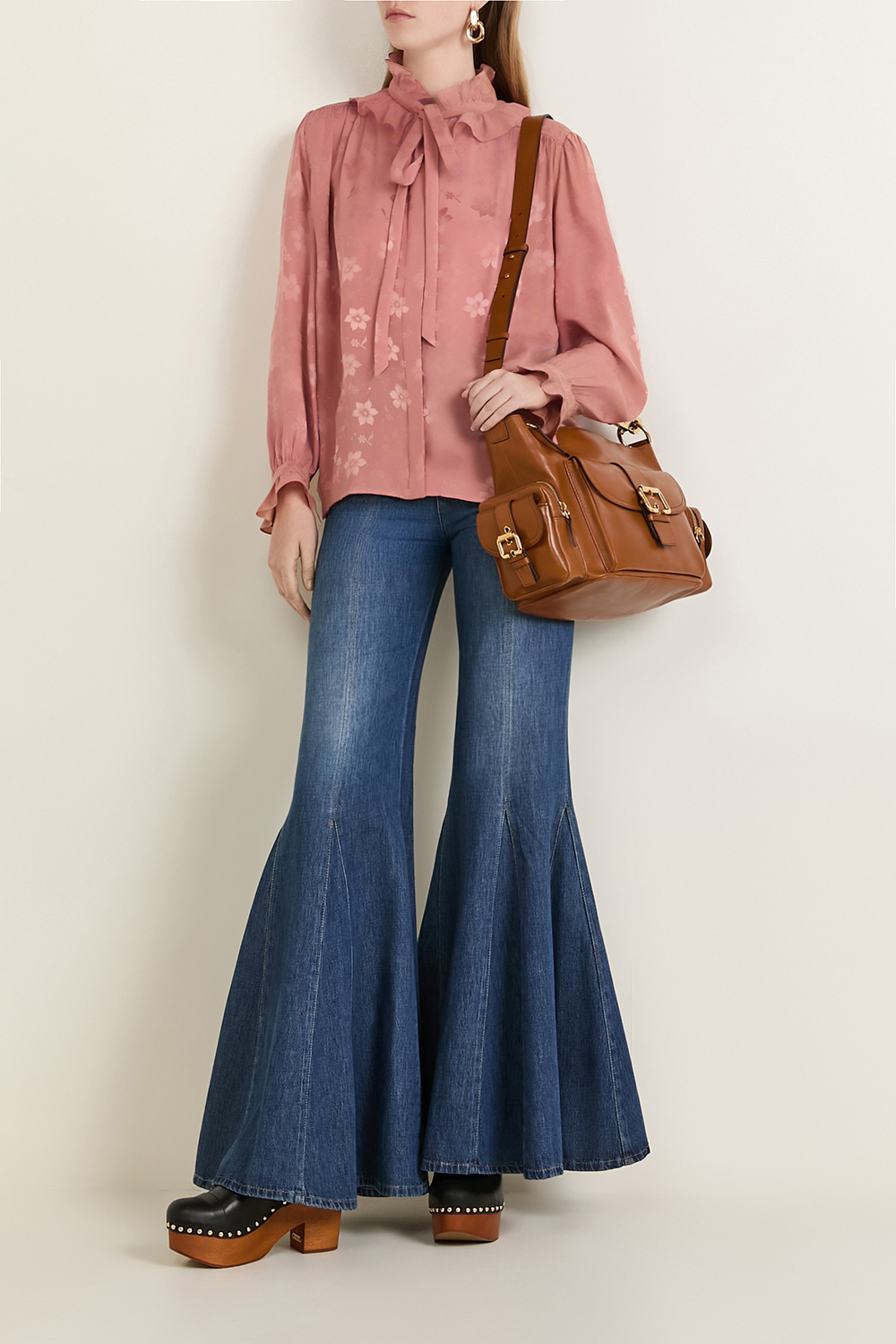 חולצת כפתורים רומנטית עם צווארון קשירה מבית Chloe. היא עשויה משי ז'קרד אורגני בצבע ורוד ובדוגמת פרחים, ויש לה שרוולים המסתיימים במלמלה ונסגרים בכפתור. החולצה נסגרת בכפתורים נסתרים העשויים אם הפנינה.