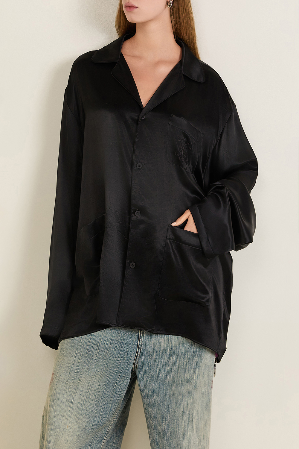 חולצת כפתורים מבית Balenciaga, מעוצבת בסגנון פיג'מת אוברסייז היסטרית, שאפשר ללבוש גם כשמלת מיני. היא עשויה סאטן מלכותי בצבע שחור, עם שני כיסים קדמיים.