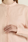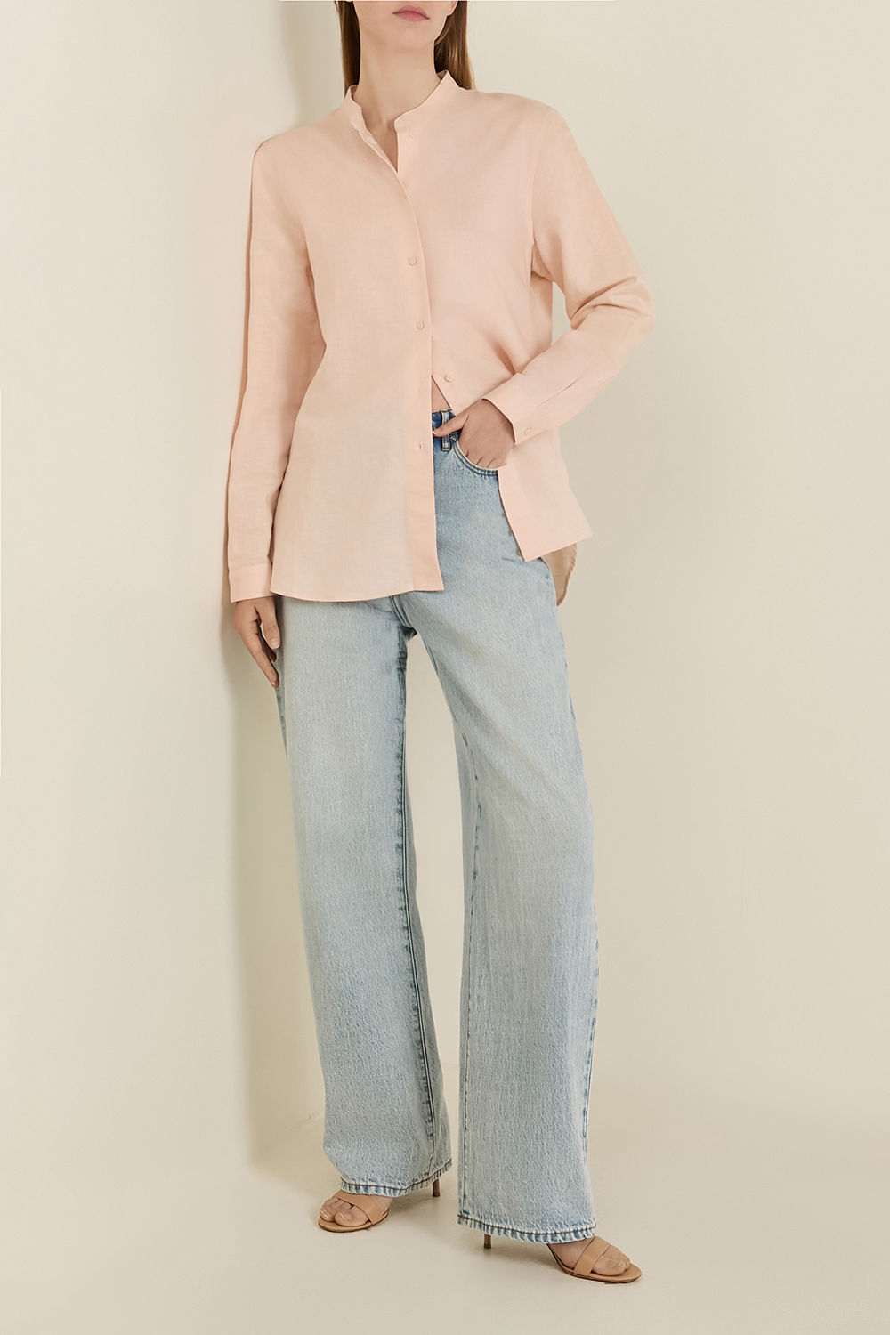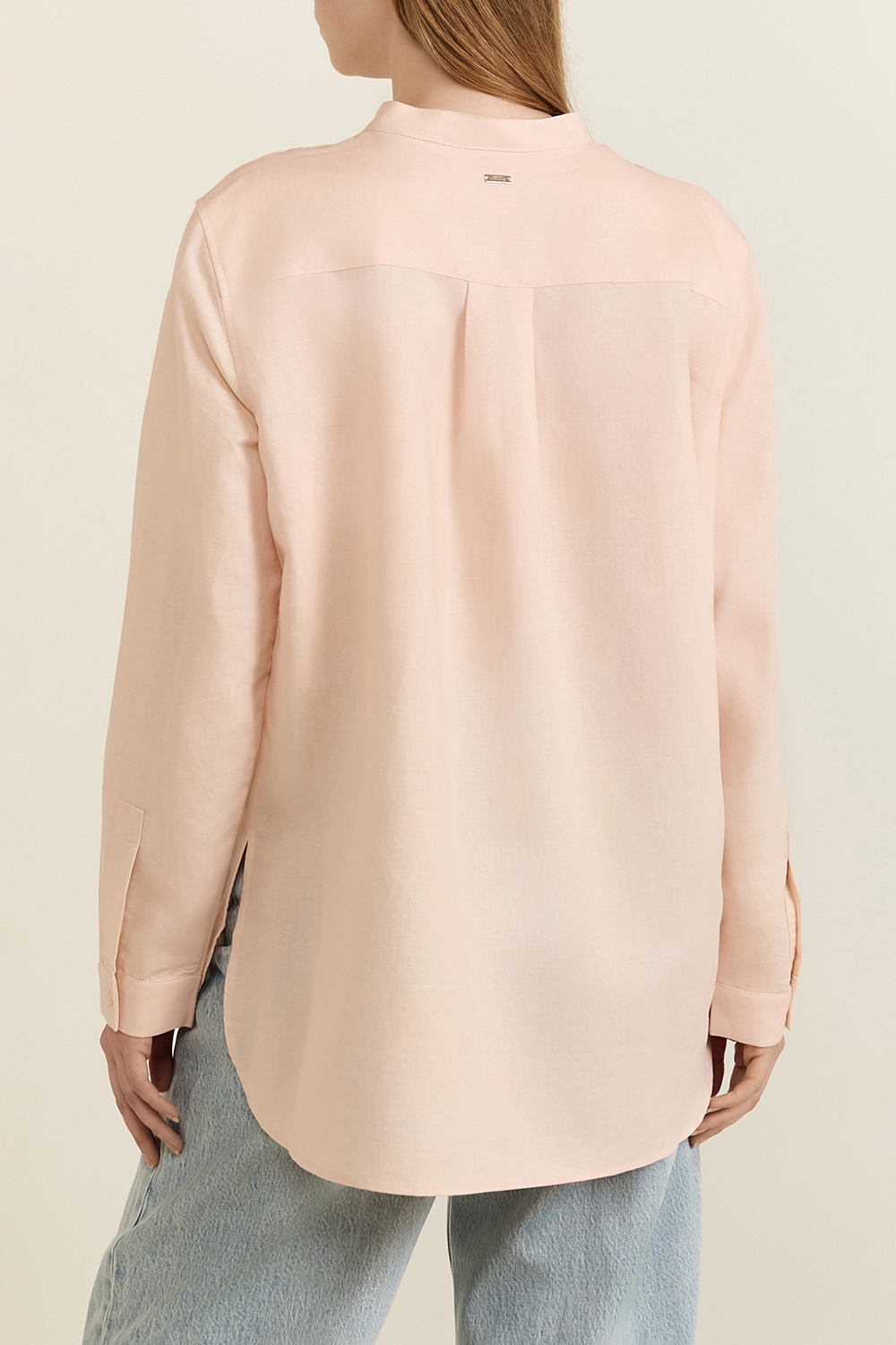 חולצת כפתורים מבית Armani Exchange עם צווארון מעוגל, עשויה פשתן וויסקוזה בצבע ורוד.